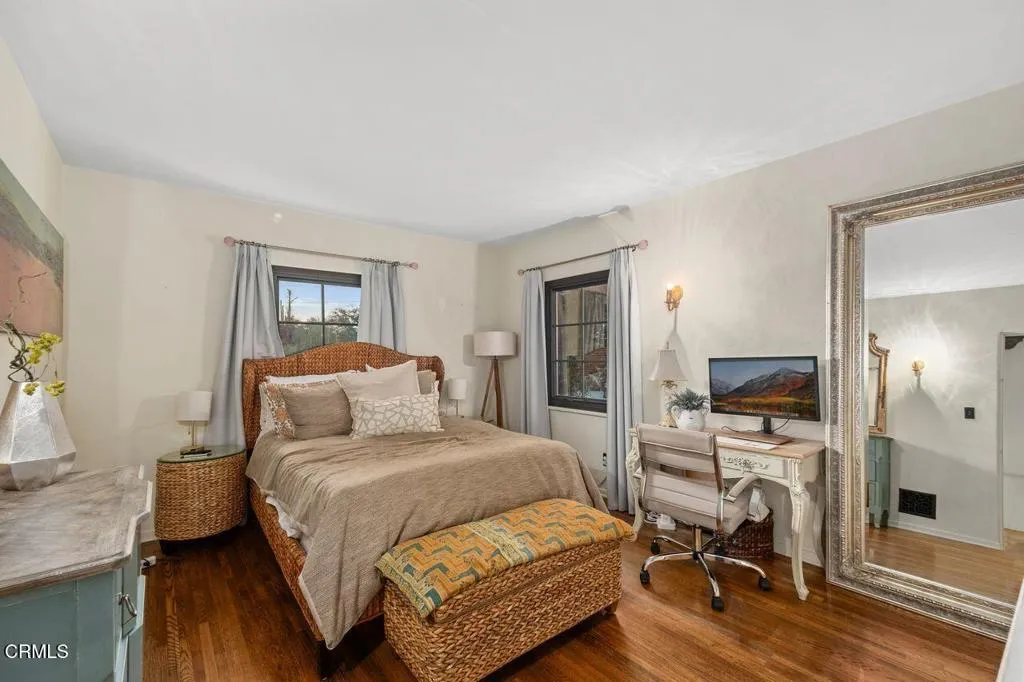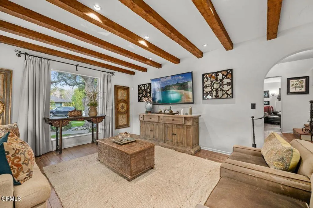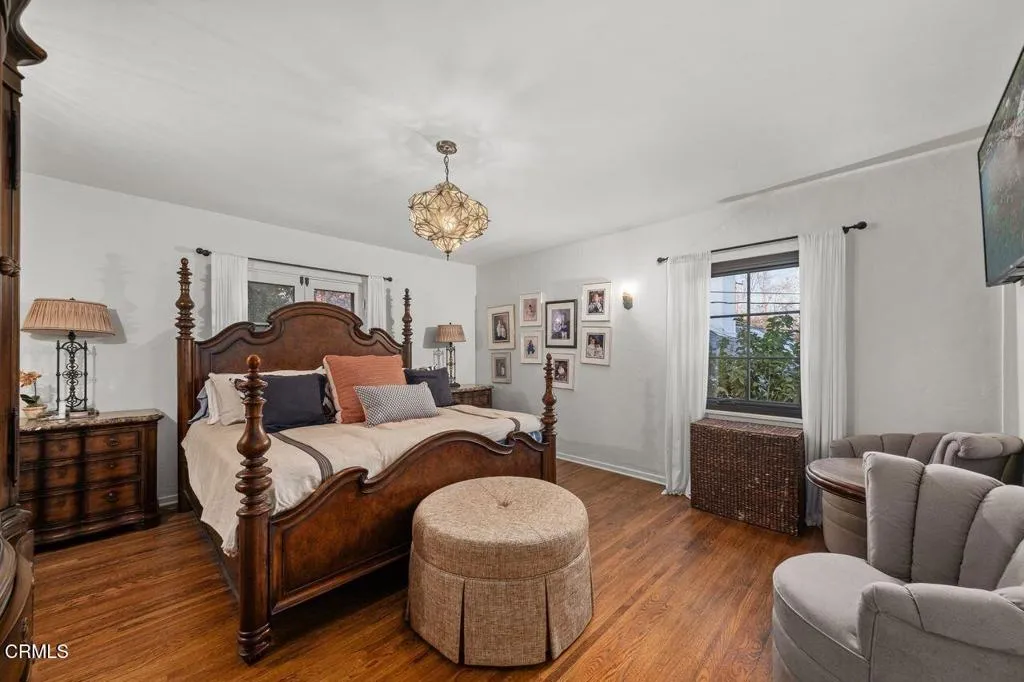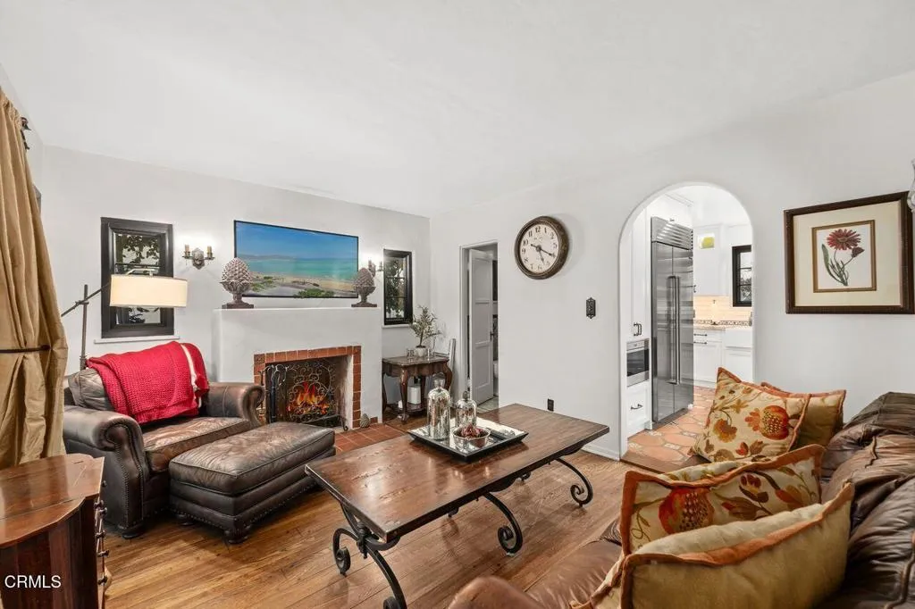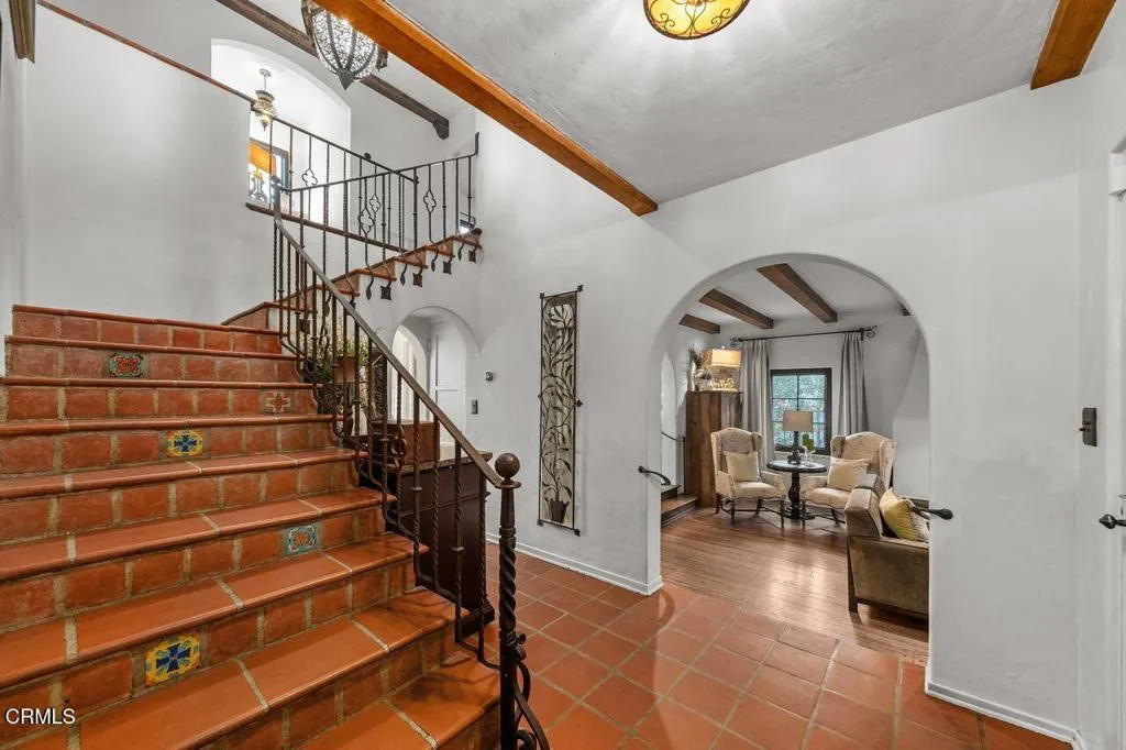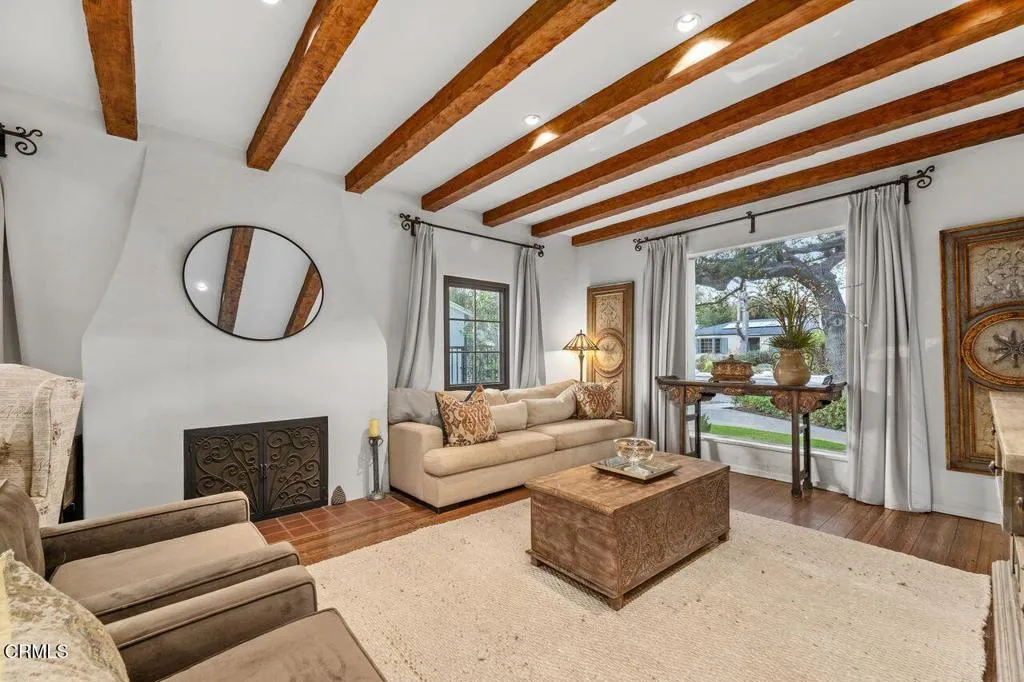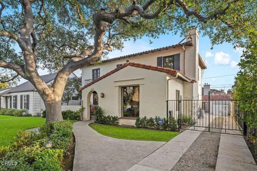 Nestled in the historic Chapman Woods neighborhood, this stunning 1931 Spanish Revival home seamlessly blends timeless architectural charm with modern updates. The property features a main house with 3 bedrooms, 3 baths, and a den, along with a separate detached guest house. A lush front lawn and gated courtyard lead to an inviting interior filled with Spanish-inspired details, including high wood-beamed ceilings, arched entryways, wrought iron accents, and unique tiling throughout. All windows are new and were replaced by Renewal by Anderson. The spacious sunken living room boasts hardwood floors, a gas fireplace, and a large picture window that showcases views of the San Gabriel Mountains. The dining room features an abundance of natural light, where French doors open onto a serene backyard patio, perfect for entertaining. The newly updated kitchen features custom cabinetry and high-end appliances, including a Wolf range, Sub-Zero refrigerator, Cove dishwasher, built-in microwave, wine fridge, and ice maker. A large picture window offers a scenic backyard view, and multiple doors provide seamless access to the outdoor space. Adjacent to the kitchen, a cozy den features a charming fireplace and a convenient powder room. Upstairs, three bedrooms and two baths provide comfort and style. The primary suite includes a private balcony, large closet, hardwood floors, and an en-suite bathroom featuring elegant finishes. Down the hall, a full bathroom with dual sinks serves the remaining bedrooms. The detached guest house is a private retreat, complete with a fireplace, a mini-split A/C system, a full kitchen with appliances, a bath, and a separate laundry area. The backyard offers a peaceful escape, featuring a lush lawn, mature trees, a tiled patio, and a distinctive water fountain creating a tranquil setting for relaxation. This exceptional Spanish Revival home is a rare find, blending architectural character with modern comfort in one of Pasadena's most desirable neighborhoods.