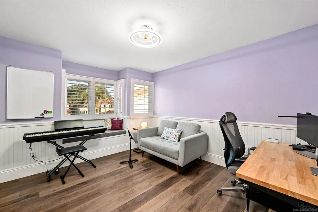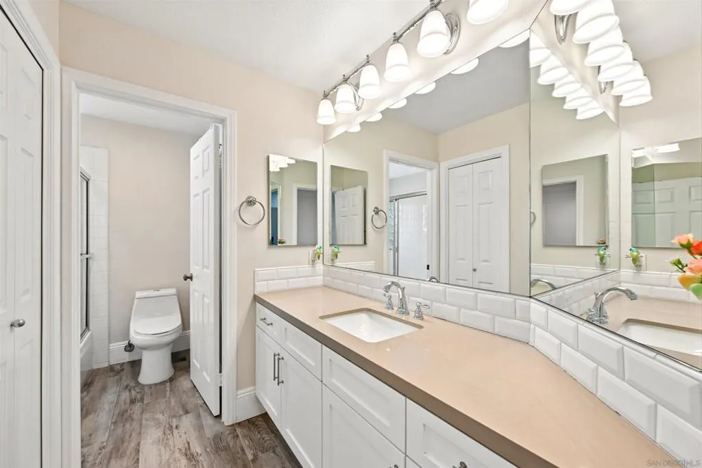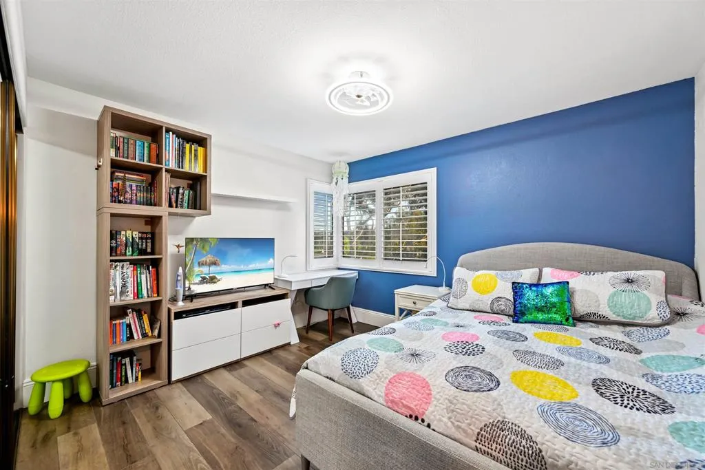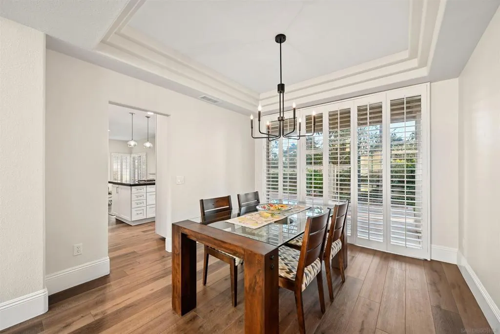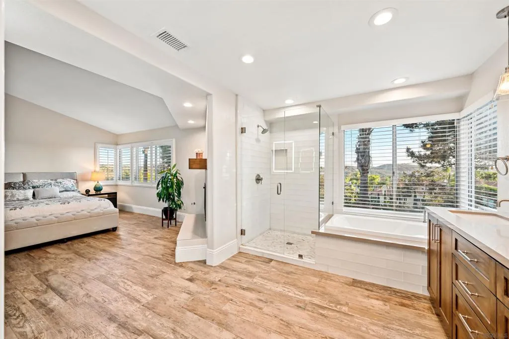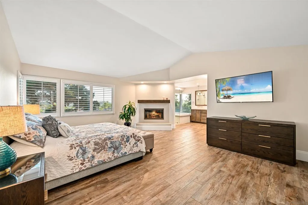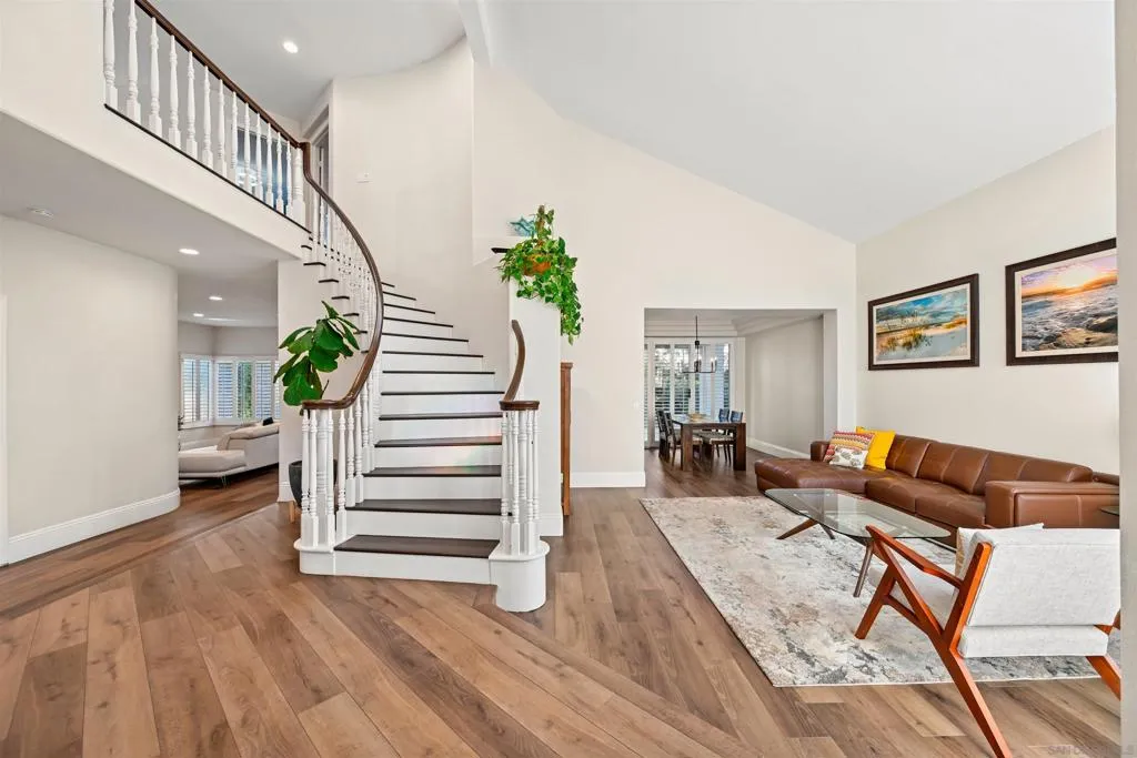Discover elevated living in this exquisite executive home in the sought-after Cantamar neighborhood of Carmel Valley. Perfectly positioned on a premium cul-de-sac, this picture-perfect residence blends timeless elegance with modern style. Enter through dramatic double doors into a grand foyer, where a sweeping curved staircase and soaring two-story ceilings create an impressive, light-filled welcome. The spacious living room offers the perfect setting to entertain or unwind and flows seamlessly into the formal dining room, highlighted by a tray ceiling for added sophistication. A desirable first-floor bedroom and full bathroom provide flexibility for guests or multi-generational living. The chef’s kitchen is both beautiful and functional, featuring sleek white cabinetry with self-closing drawers, granite countertops, an oversized island with bar seating, pendant lighting, stainless steel appliances, and a large walk-in pantry. It opens effortlessly to the inviting family room with a cozy fireplace. Designed for indoor-outdoor living, glass sliders lead to a spacious, beautifully landscaped backyard complete with artificial turf and a patio ideal for relaxing, entertaining, or dining al fresco. A laundry room with sink and storage, along with a three-car garage, completes the main level. Upstairs, the primary suite serves as a private retreat, offering a fireplace, a walk-in closet with built-in organizers, and a spa-inspired bathroom with quartz countertops, a soaking tub, and a large walk-in shower accented with decorative glass tile and herringbone stone flooring. A versatile loft, two additional bedrooms—one featuring a built-in bench and wainscoting and a secondary bathroom complete the upper level. Recent additions and features include luxury vinyl plank flooring throughout, plantation shutters, tall baseboards, a redesigned kitchen island, dishwasher, designer lighting fixtures, recessed lighting, ceiling fans, water heater, and an upgraded garage with epoxy floors, built-in cabinetry, and overhead storage. Ideally located near Carmel Knolls Park, The Bay Club, top-rated schools, and premier shopping and dining at Del Mar Highlands Town Center and One Paseo. Just minutes from the iconic beaches of Del Mar and La Jolla, with convenient access to I-5 and Highway 56, this home offers an exceptional opportunity to call your own!