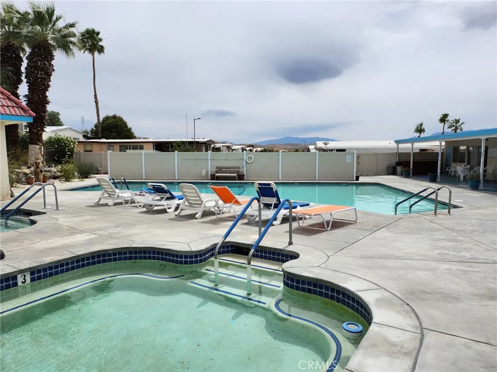 Bright, move-in ready 2 bed / 2 bath in Sparkling Water Mobile Home & RV Park — a vibrant 55+ community known for its natural mineral water pool and spa. Sunlit interiors, fully furnished and equipped with all appliances, make this a turnkey option for downsizers or part-time residents. The oversized backyard offers plenty of room for outdoor living or a creative garden. Low space rent unlocks excellent value and access to community amenities including a clubhouse, commercial kitchen, banquet room, billiards, card room, and shuffleboard. Experience relaxed, resort-style living in Desert Hot Springs.