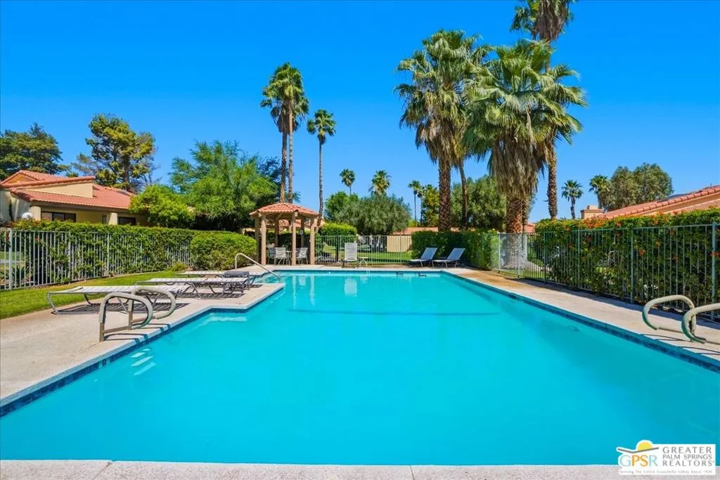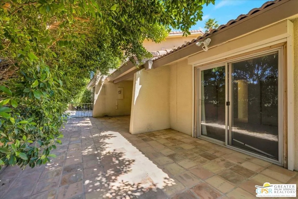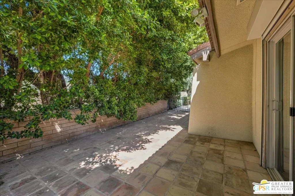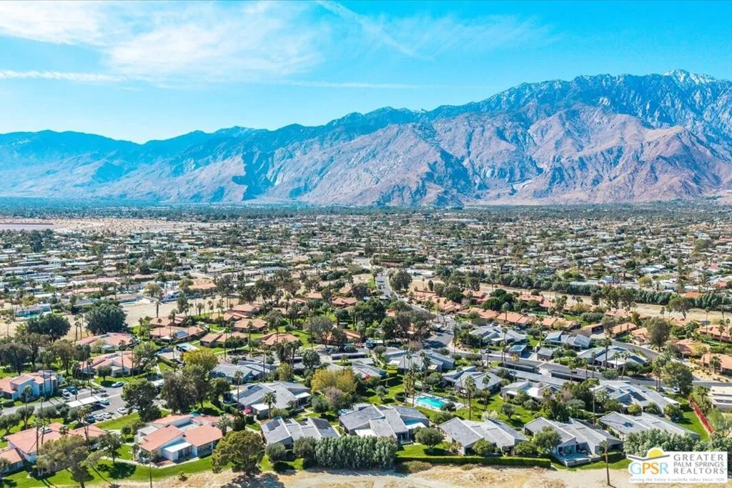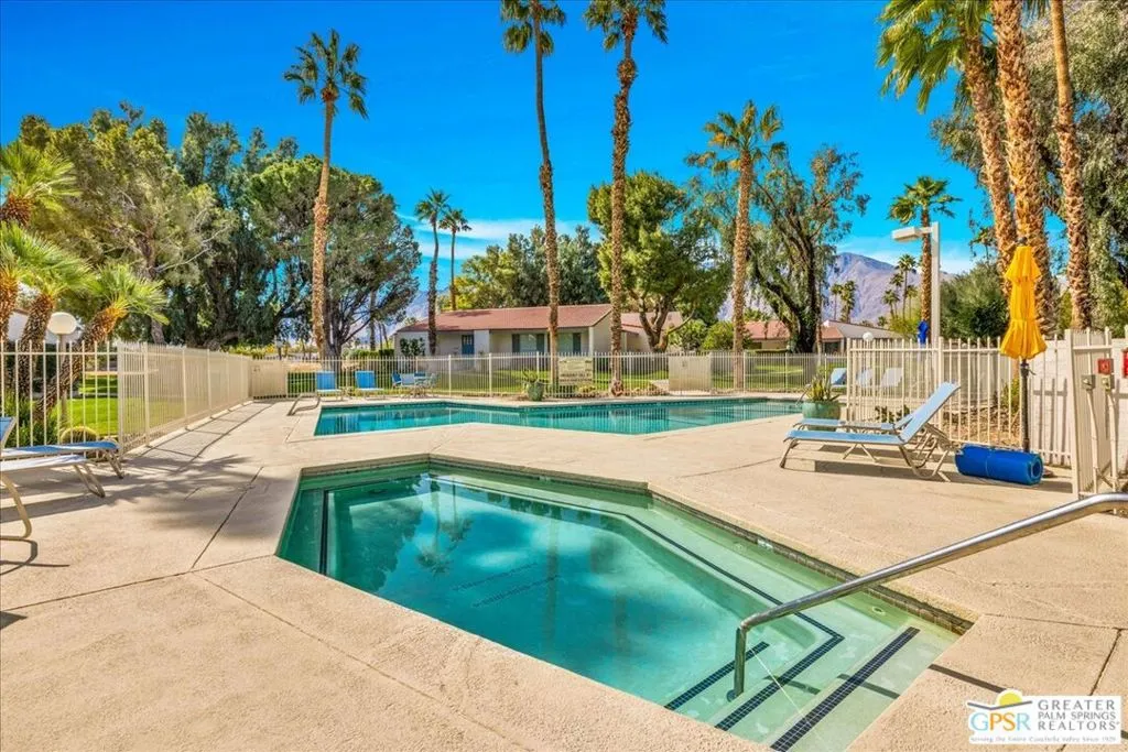Welcome to Palm Springs Country Cluban iconic gated community designed by renowned mid-century architect William F. Cody where timeless design meets resort-style living. This 2-bedroom, 2-bath end-unit condo offers approximately 1,538 sq ft of interior space and is ideally located in Phase 5, one of the most desirable sections of the community. Being an end unit, it provides added privacy, abundant natural light, and convenient proximity to parking. The home features two spacious private patios, a rare and highly desirable setup. Enjoy stunning San Jacinto Mountain views from the west-facing patio, while the second patio opens to lush garden surroundings creating the perfect indoor-outdoor desert lifestyle. Inside, you will find soaring vaulted ceilings, a gas fireplace with tile surround, and an open-concept living space filled with natural light. The kitchen offers mid-century inspired design elements, including an island, wood cabinetry, stainless steel appliances, and a skylight that brightens the space throughout the day. Large sliding doors from both the living room and kitchen create seamless access to the patios. The primary suite is generously sized with direct patio access, mountain views, dual vanities, and a walk-in closet. A spacious guest bedroom also features patio access, complemented by a well-sized guest bath. Additional features include an in-unit washer and dryer with newer appliances. Palm Springs Country Club offers resort-style amenities, including beautifully landscaped grounds, a sparkling saltwater pool, spa, and included services such as cable, internet, water, and trash, all within a peaceful, well-maintained gated setting. This is a successor trust sale and presents a fantastic fixer opportunity to customize and add value within a historically significant mid-century community. With solid bones, a desirable layout, and an unbeatable setting, this unit is ready for your vision. Bring your ideas and make it your own, opportunities like this are rare, and the property is being sold as-is, where-is.