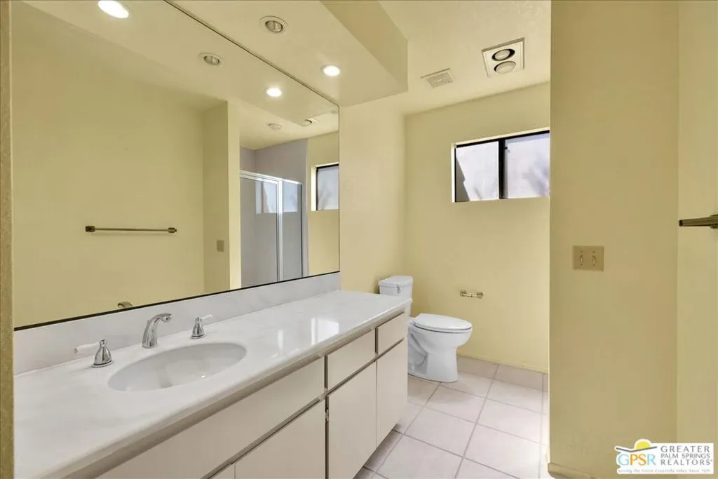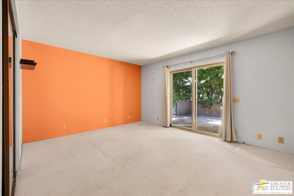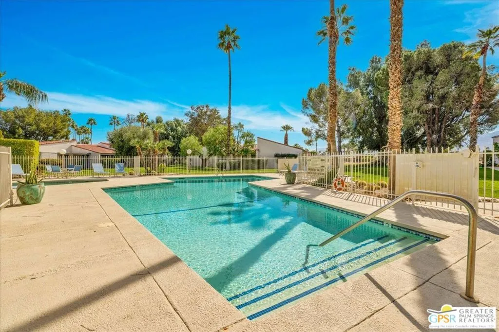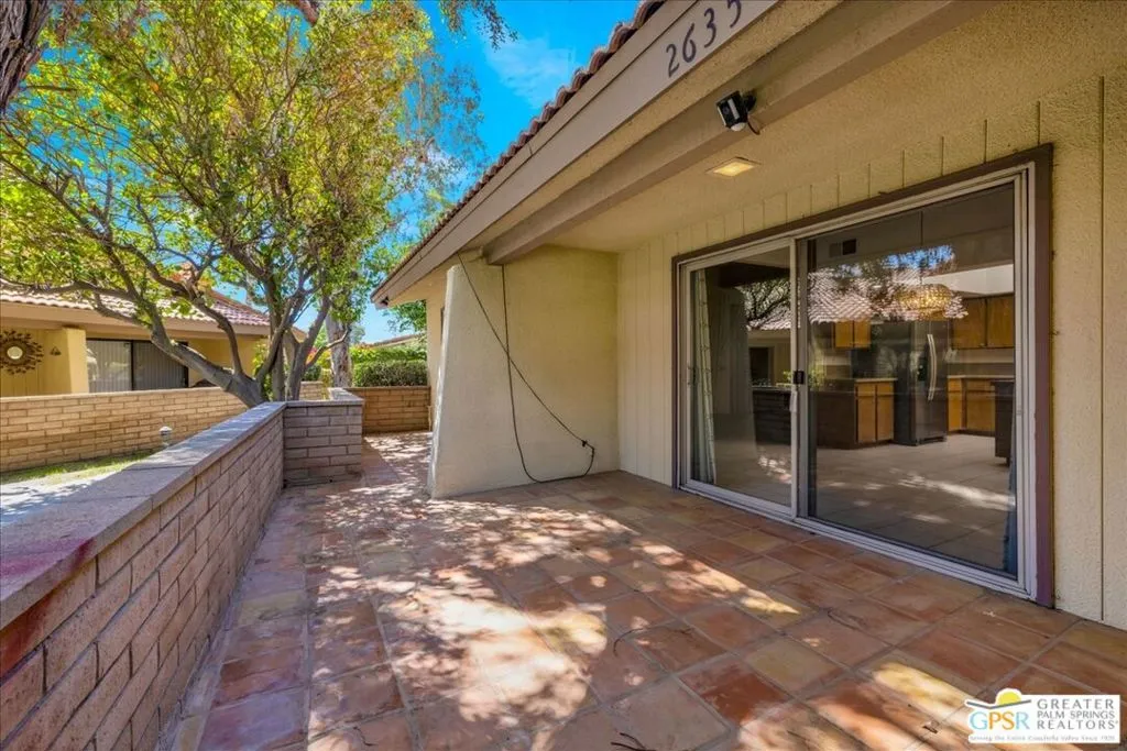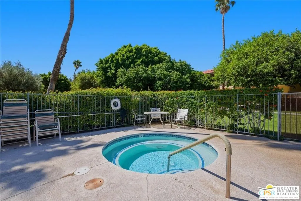 Welcome to Palm Springs Country Cluban iconic gated community designed by renowned mid-century architect William F. Cody where timeless design meets resort-style living. This 2-bedroom, 2-bath end-unit condo offers approximately 1,538 sq ft of interior space and is ideally located in Phase 5, one of the most desirable sections of the community. Being an end unit, it provides added privacy, abundant natural light, and convenient proximity to parking. The home features two spacious private patios, a rare and highly desirable setup. Enjoy stunning San Jacinto Mountain views from the west-facing patio, while the second patio opens to lush garden surroundings creating the perfect indoor-outdoor desert lifestyle. Inside, you will find soaring vaulted ceilings, a gas fireplace with tile surround, and an open-concept living space filled with natural light. The kitchen offers mid-century inspired design elements, including an island, wood cabinetry, stainless steel appliances, and a skylight that brightens the space throughout the day. Large sliding doors from both the living room and kitchen create seamless access to the patios. The primary suite is generously sized with direct patio access, mountain views, dual vanities, and a walk-in closet. A spacious guest bedroom also features patio access, complemented by a well-sized guest bath. Additional features include an in-unit washer and dryer with newer appliances. Palm Springs Country Club offers resort-style amenities, including beautifully landscaped grounds, a sparkling saltwater pool, spa, and included services such as cable, internet, water, and trash, all within a peaceful, well-maintained gated setting. This is a successor trust sale and presents a fantastic fixer opportunity to customize and add value within a historically significant mid-century community. With solid bones, a desirable layout, and an unbeatable setting, this unit is ready for your vision. Bring your ideas and make it your own, opportunities like this are rare, and the property is being sold as-is, where-is.