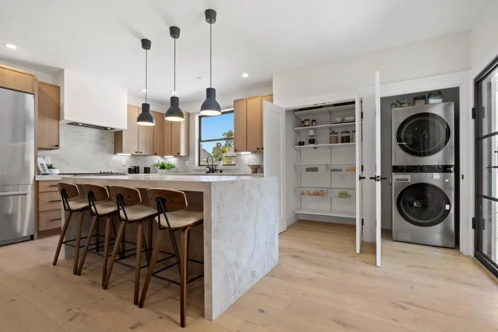 This impeccably remodeled Craftsman residence at 1117 Palm has been taken down to the studs and thoughtfully rebuilt with high-end finishes throughout. Featuring four bedrooms and three bathrooms, the home offers a flexible and functional layout with 2 bedrooms and 1 bathroom upstairs, and 2 bedrooms and 2 bathrooms on the lower level. The spacious ground floor primary suite is a true retreat, complete with a cozy fireplace, a generous walk-in closet, and a spa-inspired bathroom adorned with natural stone finishes. The expansive living and dining areas are filled with natural light and designed for both everyday living and entertaining. The chefs kitchen is beautifully appointed with quartzite countertops, high-end appliances, and refined finishes that carry throughout the home. Step outside to a private backyard with a large deck, perfect for dining, entertaining, and enjoying the California lifestyle. The fully updated garage offers incredible versatility, featuring recessed lighting and French doors that open to the backyard. This space is ideal as a home office or gym, with potential for an ADU (buyer to verify). Major upgrades include new plumbing, electrical, windows, a 50-year presidential roof, new furnace, and air conditioning, offering peace of mind for years to come.