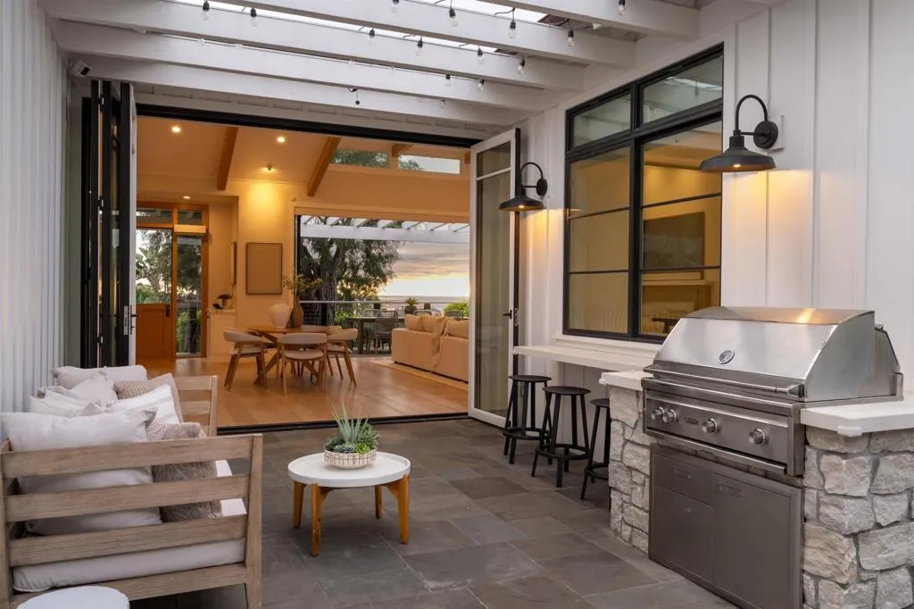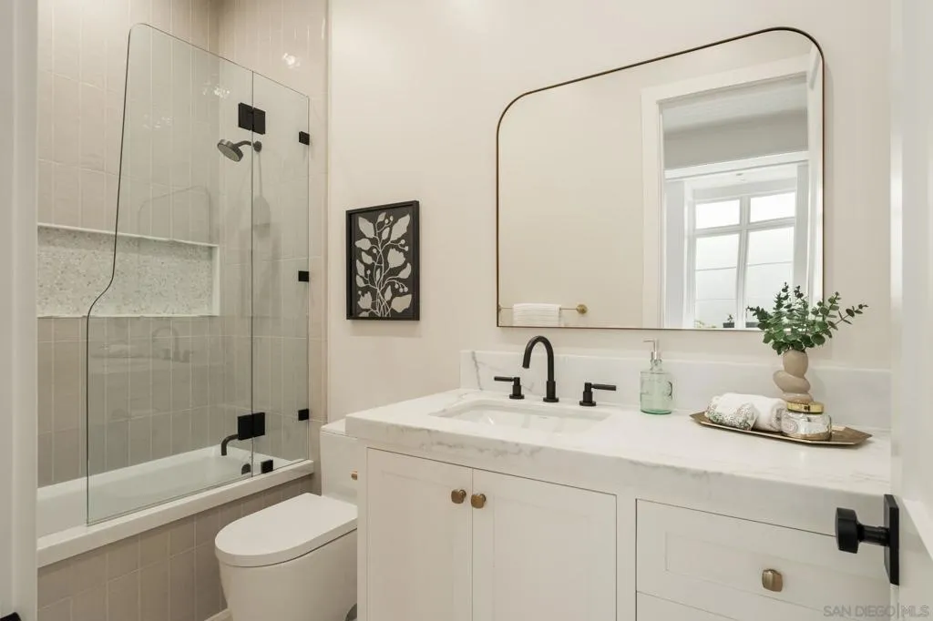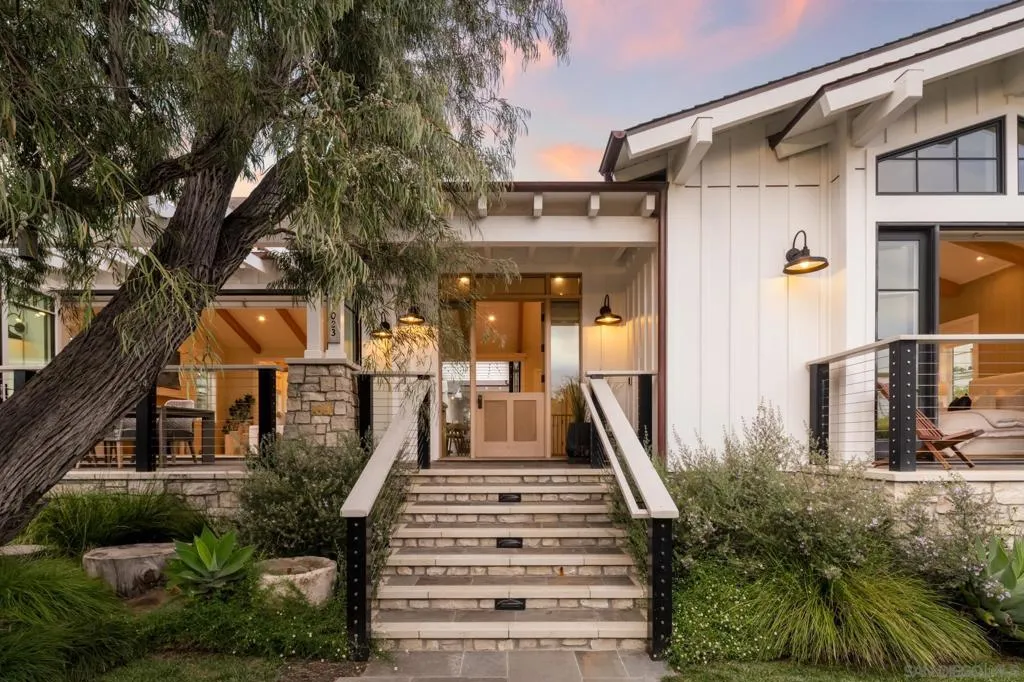 Set in Olde Del Mar just blocks from the beach, shops, and restaurants, this beautiful ocean-view home offers an exceptional coastal lifestyle. Built in 2022, the open 4-bedroom floor plan centers around an inviting great room with vaulted ceiling and retractable glass doors that open to an expansive porch, creating a seamless indoor-outdoor setting for sunset views. The chef’s kitchen features a generously sized island with marble countertops and luxury Miele 6-burner range with grill and double ovens. Two bedrooms are located on the main level, including a luxurious primary suite with balcony and spa-like bath. On the lower level, thoughtfully designed light wells and high ceilings enhance the bright, airy feel of the two additional bedrooms and bonus room. A detached ADU, hot tub, built-in BBQ, and covered outdoor living area with fireplace create an ideal setting for entertaining. Complete with paid solar and a 2-car garage with EV charger, this stunning residence presents a rare opportunity to own a newer build in a highly sought-after location west of the 101.
