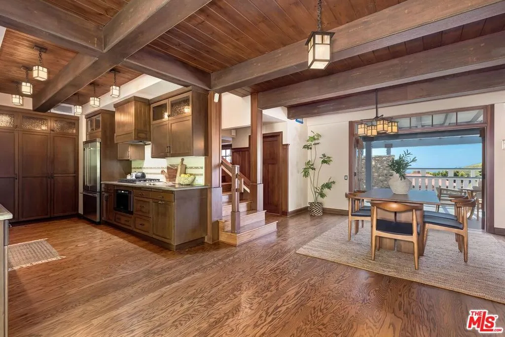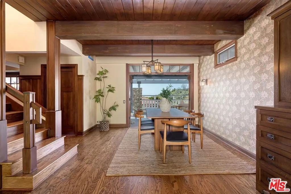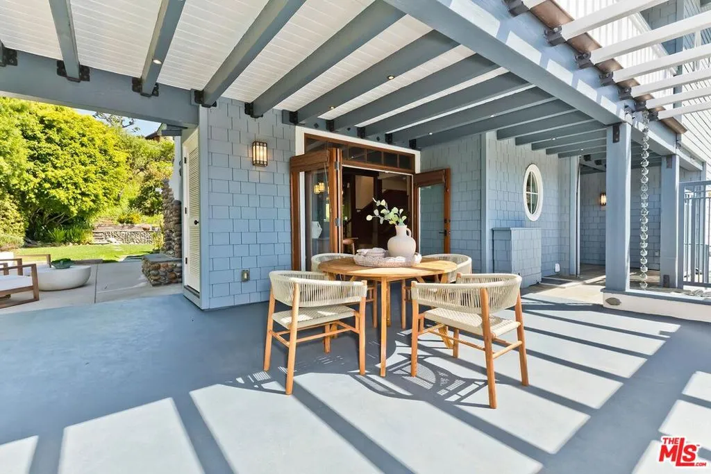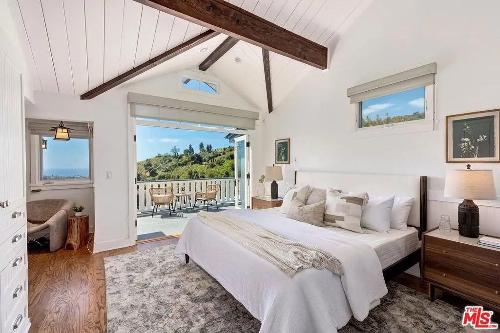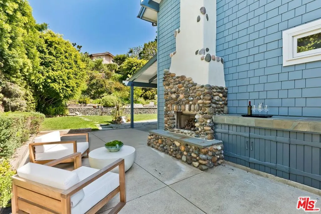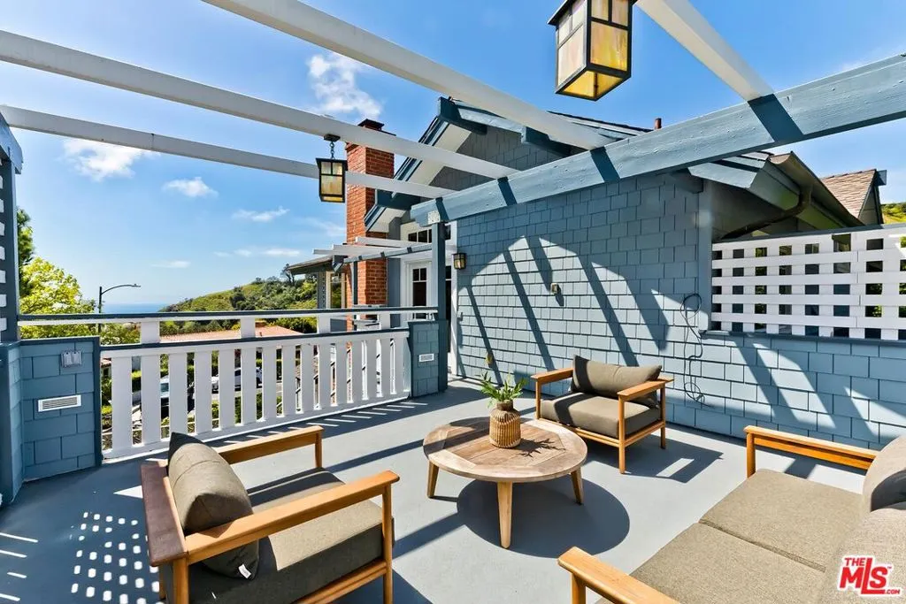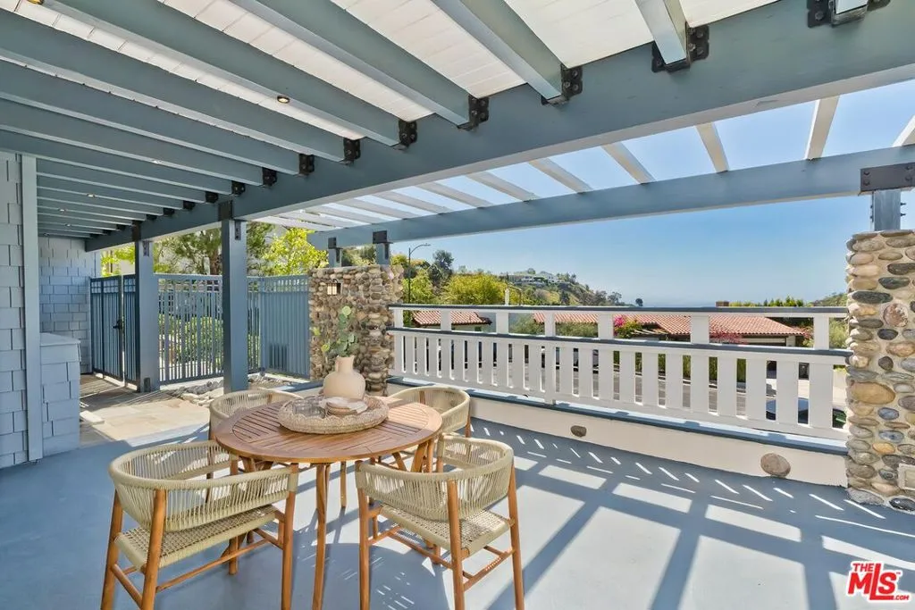 El Hito means 'the Milestone,' and that's what this home really is. A stunning property tucked into an idyllic cul-de-sac surrounded by natural beauty, this 4-bedroom + office/den and 3.5 bathroom in Pacific Palisades is as impressive as it is welcoming. The home, with a jaw-dropping view of the Pacific Ocean, has a one-of-a-kind style, presenting a seamless blend of Craftsman and Cape Cod. Surrounded by concrete and Hardie Shingle Siding, not only did the home escape harm in the fires, but miraculously, the entire street was almost completely untouched. Inside is an impressive array of heavy dark wood floors, exposed wood beams above, Bluestone tiles, an enormous stone fireplace in the formal Living Room, and Craftsman design details throughout. French Doors open from the private office to the exterior, allowing natural light to stream in, and the Formal Dining Room flows to the casual breakfast nook and Chef's Kitchen- each space enhanced by glass windows/doors extending to the backyard. The home was recently remodeled, expanded, and updated- the kitchen has new Viking stainless steel appliances and an abundance of storage and food prep space. Situated on a .62-acre lot, the 2733 sq ft home has an expansive backyard that includes a vast stretch of grass, patios, a stone fireplace, a variety of entertaining areas, and a fenced-in hillside that provides a dizzying array of beautiful wildflowers and mature citrus trees. Upstairs are the family's sleeping quarters, each comfortable and spacious. The Primary Bedroom features two closets (one of which a walk-in), high vaulted ceilings, attached designer bathroom and a large balcony that beckons you outdoors to best appreciate the inspiring view of the ocean. A patio with an exterior staircase could easily be used for morning yoga or midday meditation. The possibilities are endless. Additional amenities: 2-car garage, alarm system, filtered water throughout the home,extra-large generator, skylights, and outdoor shower. A truly special property- a milestone in the revitalized Palisades that is not to be missed.
