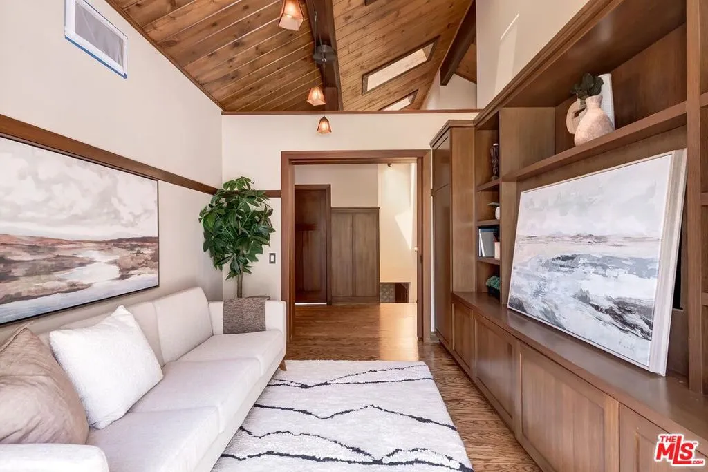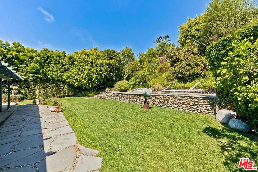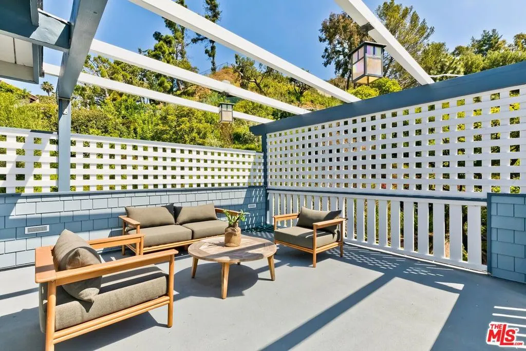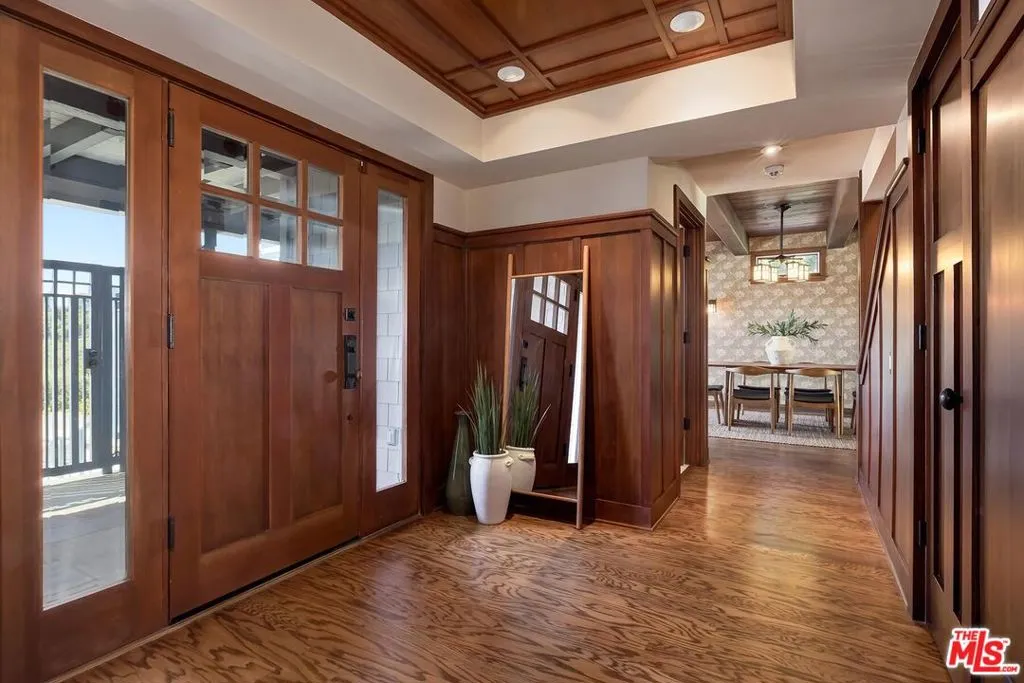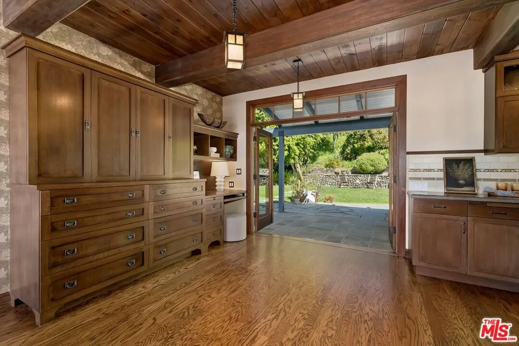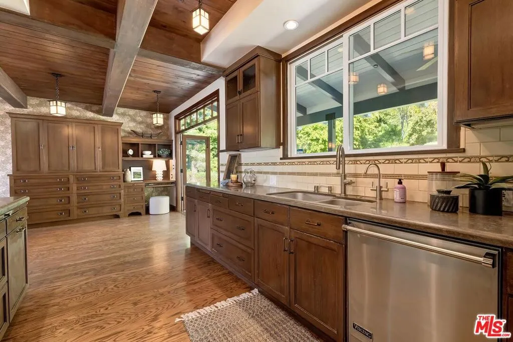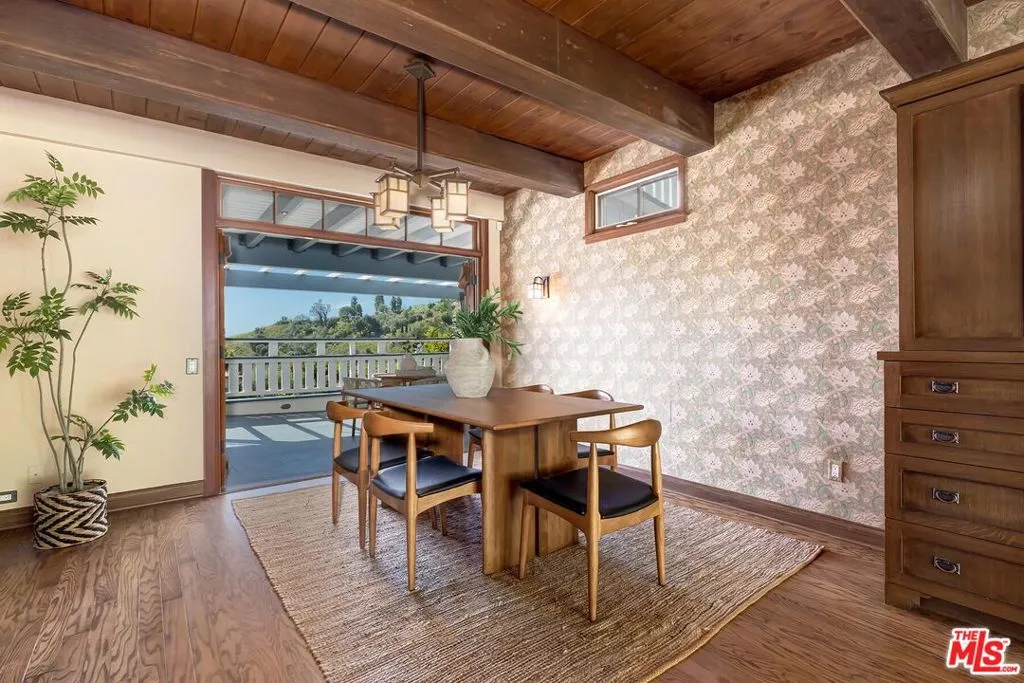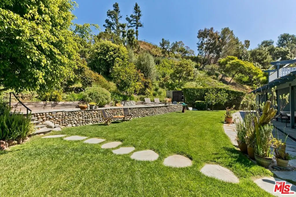 El Hito means 'the Milestone,' and that's what this home really is. A stunning property tucked into an idyllic cul-de-sac surrounded by natural beauty, this 4-bedroom + office/den and 3.5 bathroom in Pacific Palisades is as impressive as it is welcoming. The home, with a jaw-dropping view of the Pacific Ocean, has a one-of-a-kind style, presenting a seamless blend of Craftsman and Cape Cod. Surrounded by concrete and Hardie Shingle Siding, not only did the home escape harm in the fires, but miraculously, the entire street was almost completely untouched. Inside is an impressive array of heavy dark wood floors, exposed wood beams above, Bluestone tiles, an enormous stone fireplace in the formal Living Room, and Craftsman design details throughout. French Doors open from the private office to the exterior, allowing natural light to stream in, and the Formal Dining Room flows to the casual breakfast nook and Chef's Kitchen- each space enhanced by glass windows/doors extending to the backyard. The home was recently remodeled, expanded, and updated- the kitchen has new Viking stainless steel appliances and an abundance of storage and food prep space. Situated on a .62-acre lot, the 2733 sq ft home has an expansive backyard that includes a vast stretch of grass, patios, a stone fireplace, a variety of entertaining areas, and a fenced-in hillside that provides a dizzying array of beautiful wildflowers and mature citrus trees. Upstairs are the family's sleeping quarters, each comfortable and spacious. The Primary Bedroom features two closets (one of which a walk-in), high vaulted ceilings, attached designer bathroom and a large balcony that beckons you outdoors to best appreciate the inspiring view of the ocean. A patio with an exterior staircase could easily be used for morning yoga or midday meditation. The possibilities are endless. Additional amenities: 2-car garage, alarm system, filtered water throughout the home,extra-large generator, skylights, and outdoor shower. A truly special property- a milestone in the revitalized Palisades that is not to be missed.