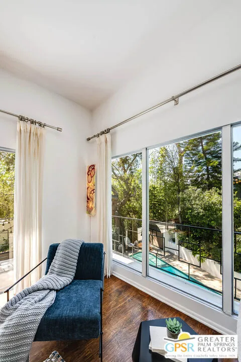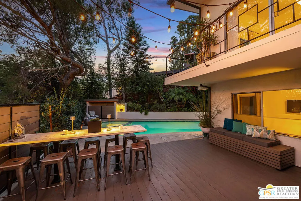This ultimate Hollywood oasis lifestyle home, located in the coveted Hollywood Dell neighborhood, offers great privacy and is within walking distance of the Hollywood Bowl and close proximity to many popular restaurants and shops. Enter into a large, bright and open main living area with high ceilings and walls of glass that offer views of the pool, mature landscaping and the Hollywood Hills. Entertain in an open cook's kitchen with professional appliances, stone counters and a cozy breakfast nook, all with a seamless flow to the adjacent dining area. When your preference takes dining and entertaining outdoors, step onto a wonderful deck with dining table and an intimate seating area around the fire pit. The primary bedroom upstairs opens to a beautifully serene patio with a set of exterior stairs with a design that evokes the Greek Isles and leads you to the pool and spa. A large 2nd bedroom on this floor is private and has its own en-suite bath. Step from the third bedroom, located on the ground floor, directly to the pool area, or double it as a party room for pool days. There is an excellent bonus room at this level that could be used as a home office or would be perfect for an art studio. Mature landscaping nestles the home into the hillside, and a path that leads to the top of the property brings you to an enchanting escape overlooking the hills. There are many smart home features, invaluable huge basement storage, laundry room and 2 car garage with Tesla EV charger. This is an extraordinary property that offers many lifestyle options. Hurry!