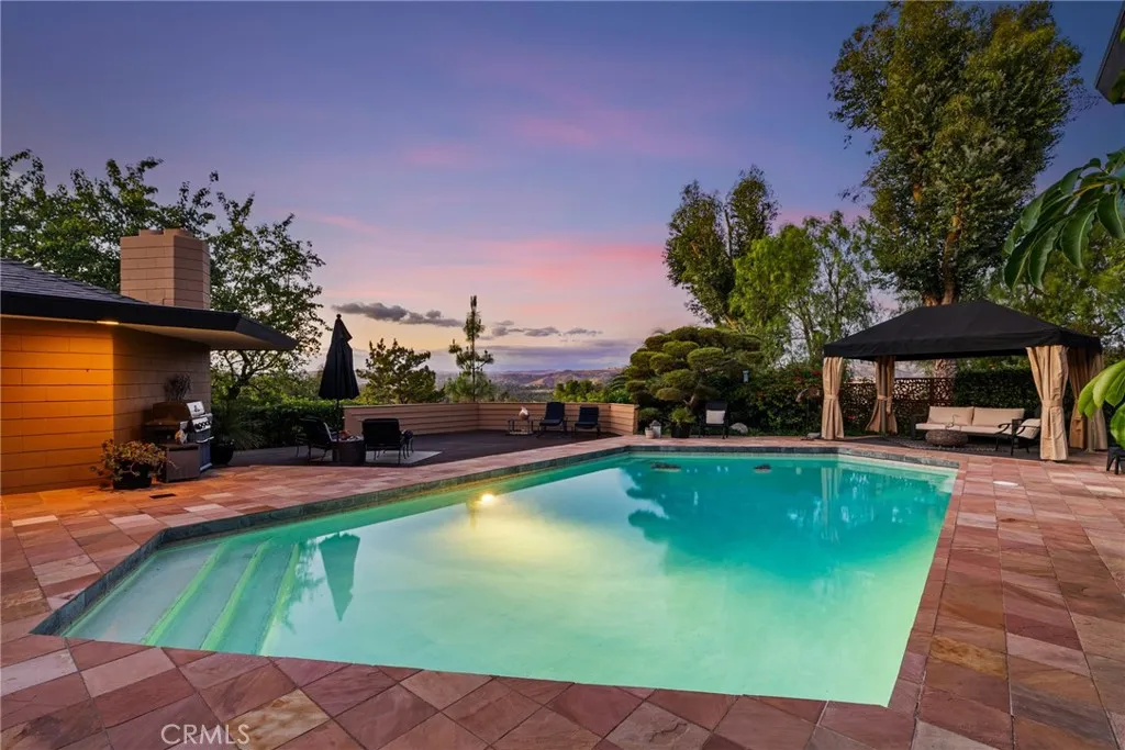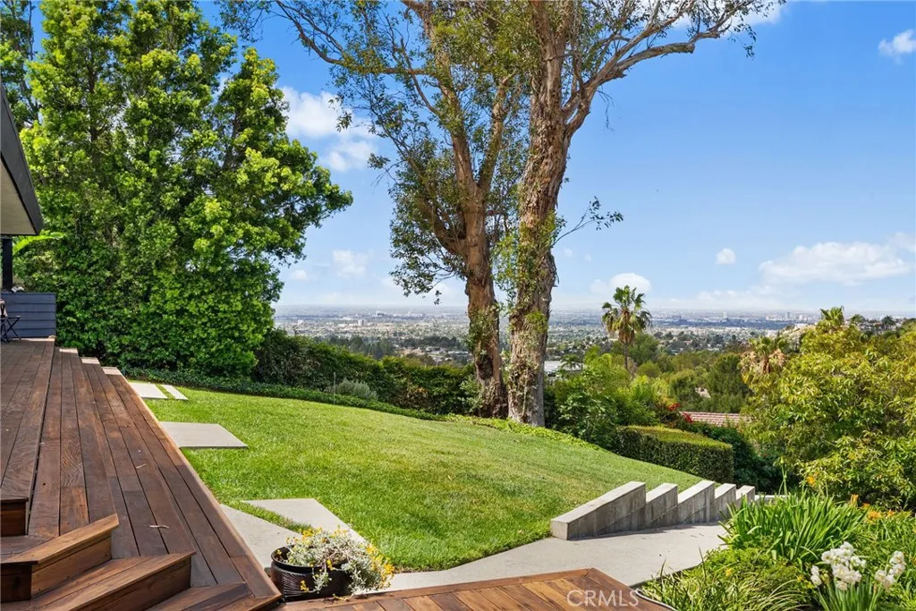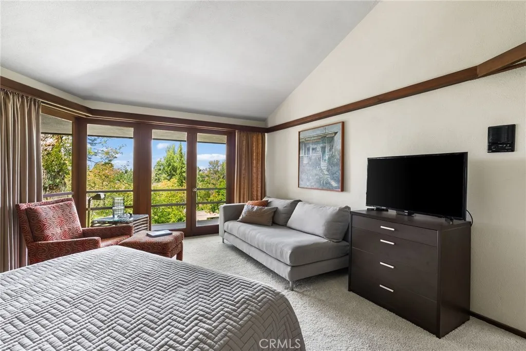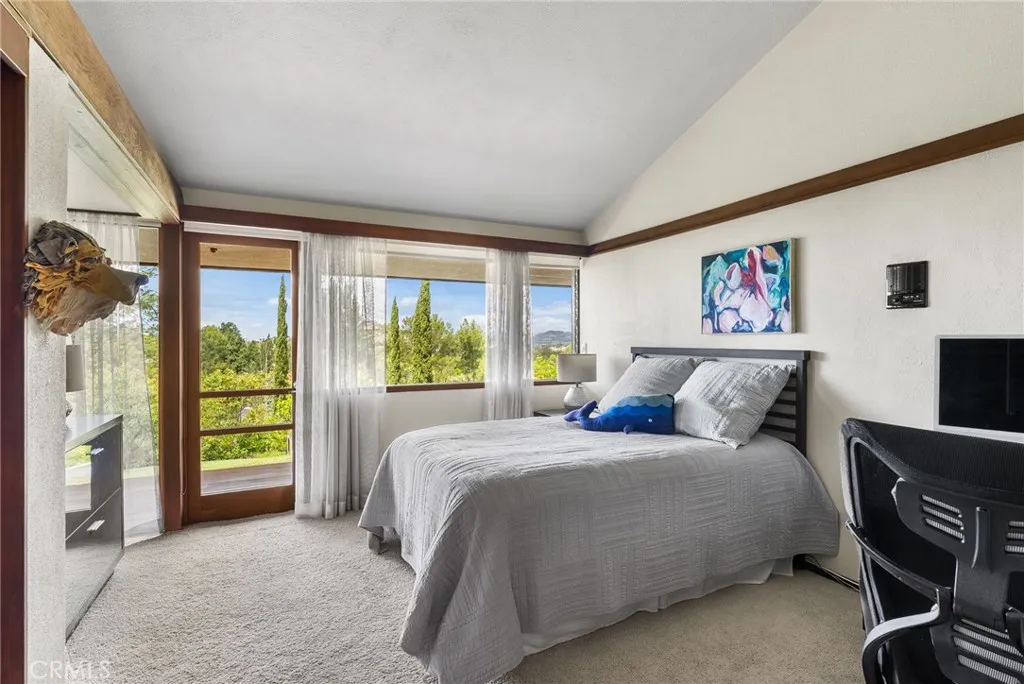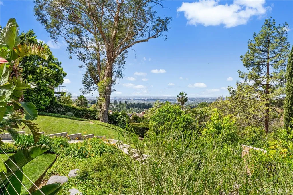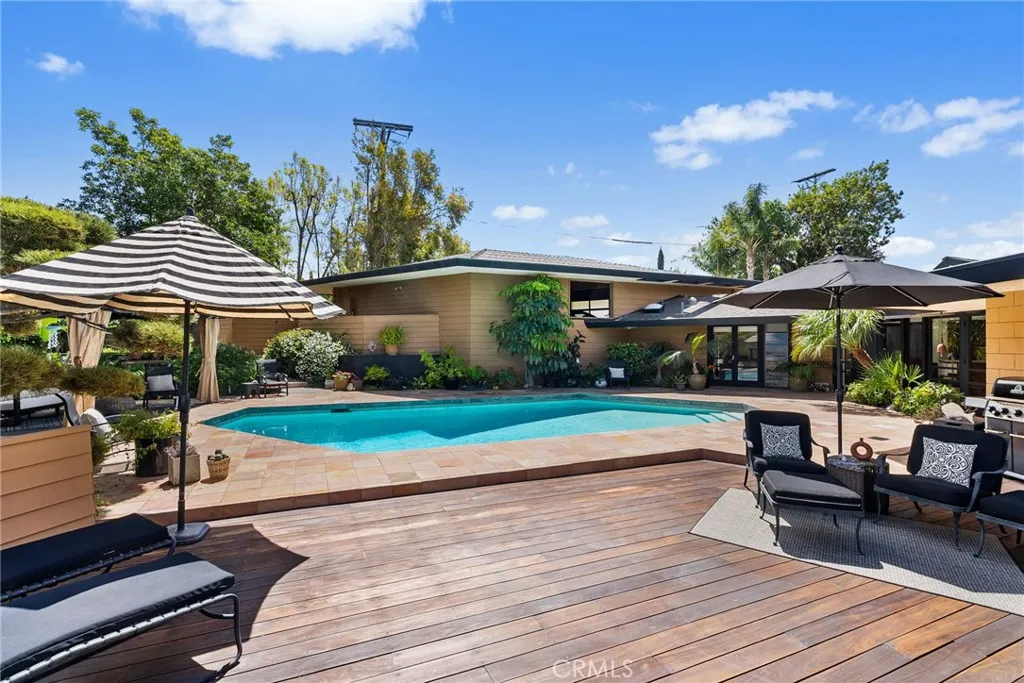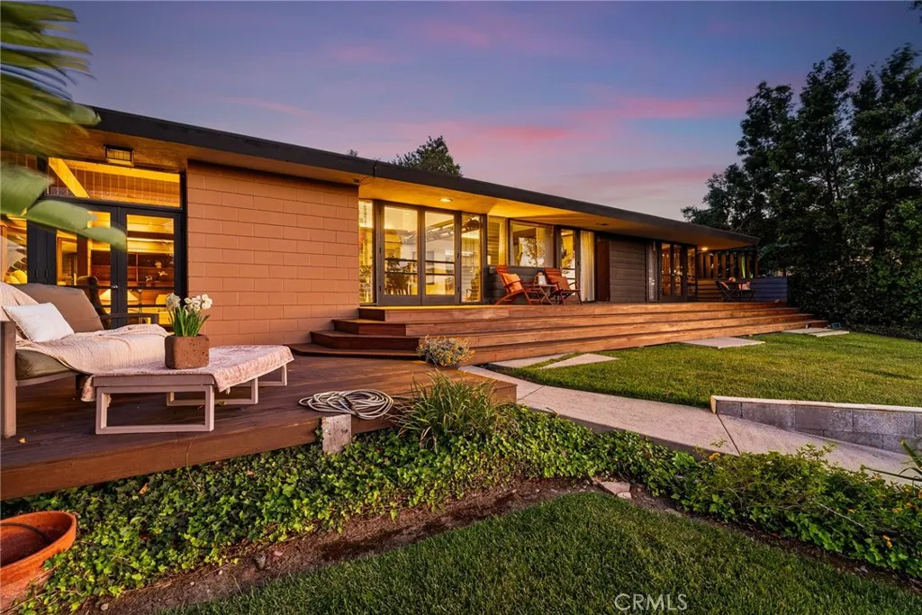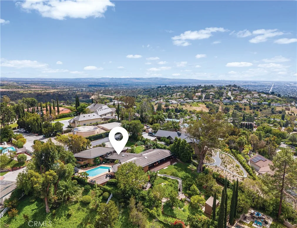 Perched above Lemon Heights, this exceptional single-story mid-century modern home showcases sweeping 180-degree views from Catalina Island to Palos Verdes, framed by rolling hills and mountains—enjoyed from nearly every room and carried throughout the indoor-outdoor living experience. Designed by a protégé of Frank Lloyd Wright and inspired by the iconic Rosenbaum House, the residence embodies organic modernism with clean lines, natural materials, and a strong architectural presence. Inside, soaring post-and-beam ceilings, skylights, and expansive walls of glass fill the open living spaces with light, blurring the line between indoors and out. The home is designed for both relaxed living and entertaining, featuring a dramatic great room that flows effortlessly to multiple patios, an impressive 2,500-square-foot wraparound Ironwood deck, and a grass yard—all thoughtfully positioned to capture views in every direction. The kitchen opens to the den and overlooks the pool area, complete with a firepit and expansive patios for outdoor enjoyment, while the formal dining room opens directly to the impressive deck for indoor-outdoor entertaining. The updated kitchen connects to the main living areas. The flexible layout includes a private primary suite, two additional bedrooms, a detached guest studio, and a pool tucked into the hillside. Complete with a three-car garage and workshop, this is a rare architectural retreat offering privacy, style, and breathtaking views from nearly every vantage point. Set on an expansive lot, this is more than a home—it’s a rare architectural statement and a warm, modern sanctuary defined by light, space, and its exceptional setting.