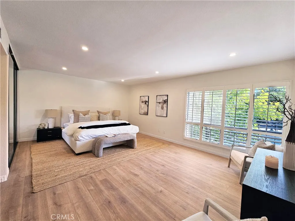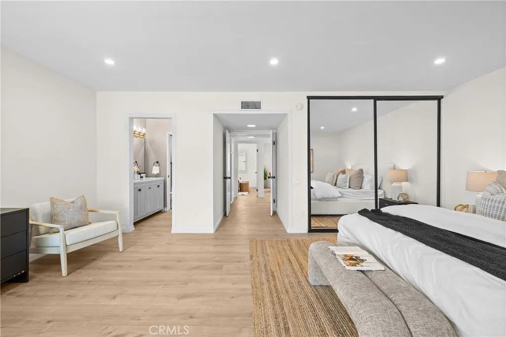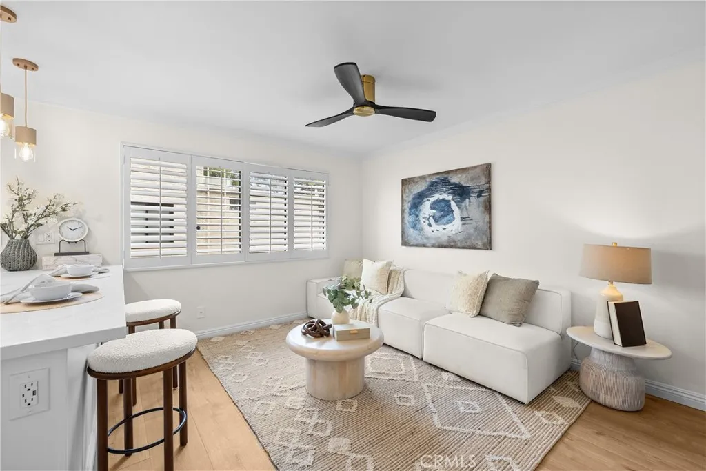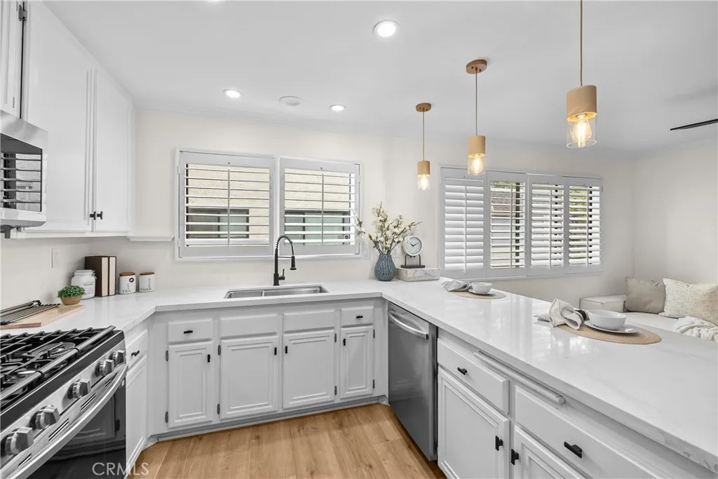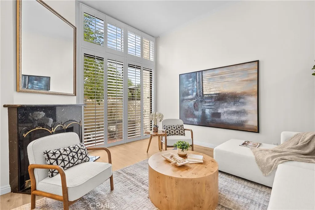 Gorgeous, remodeled townhome in the serene Dove Creek community, offering over 1,750 square feet of living space with 3 bedrooms and 2.5 bathrooms. A grand double-door entry opens to a spacious living room with soaring two-story ceilings, a cozy fireplace, and plantation shutters. Sliding glass doors fill the space with natural light and lead to a private patio—perfect for morning coffee or evening relaxation. An elevated dining area overlooks the living room and flows seamlessly into the kitchen and family room, creating an ideal layout for both everyday living and entertaining. The light-filled kitchen features quartz countertops, stylish pendant lighting, and stainless steel appliances, including a newer stove and microwave. Adjacent, the family room offers a comfortable space to gather or unwind. Upstairs, a versatile loft with accordion doors provides the perfect option for a home office or third bedroom. The oversized primary suite boasts double-door entry, high ceilings, beautiful flooring, dual closets, and a private en-suite bath. The primary bathroom has been thoughtfully updated with a dual-sink vanity, modern lighting, updated mirrors, and a beautifully remodeled walk-in shower. Additional highlights include a tastefully remodeled powder room for guests and an updated hall bathroom with contemporary finishes. The secondary bedroom features a clean, neutral aesthetic. Private Double Car Garage with Automatic Opener and Direct Access. Central Air & Heat. Residents of Dove Creek enjoy access to a pool, two spas, and a tennis court. Ideally located near shopping, dining, and entertainment at The Village, Westfield Topanga, and Ventura Boulevard, with convenient access to the 101 and 118 freeways.