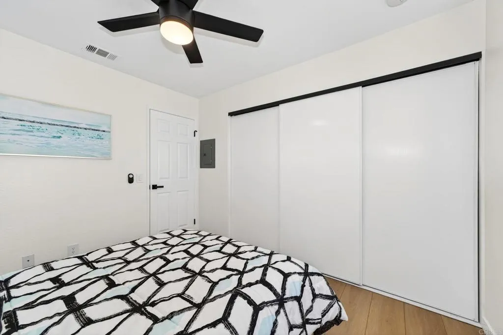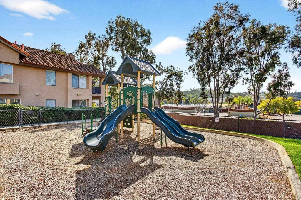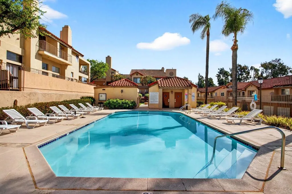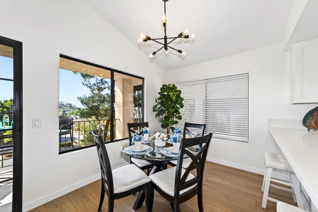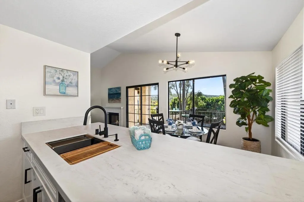 The one you’ve been waiting for! Welcome to this beautifully remodeled 2-bedroom, 2-bath condo in the desirable Avocado Gardens community of San Marcos — where modern design meets comfort, privacy, and mountain views. Step inside and immediately notice the soaring vaulted ceilings in the living and dining areas, creating an open, airy feel rarely found in condos at this price point. Natural light fills the space, drawing you toward the modernized fireplace featuring contemporary “Fire & Ice” crushed glass — a stunning focal point that adds both warmth and style. The fully remodeled kitchen is thoughtfully designed with quartz countertops, white shaker cabinetry with soft-close doors and drawers, and stainless-steel appliances. From the kitchen, dining area, and private balcony, enjoy peaceful mountain views and the added benefit of no rear neighbors. Luxury vinyl plank flooring runs throughout the main living areas, complemented by designer three-tone paint and matte black ceiling fans that carry a timeless black-and-white aesthetic from room to room. The spacious primary suite offers dual closets and a dual-vanity ensuite bathroom, providing both functionality and comfort. The secondary bedroom and bath are equally well-appointed, ideal for guests, a home office, or roommates. Even the attached garage has been upgraded — freshly painted with a sleek epoxy-coated floor for a clean, finished look. The building itself is gated for added privacy, and residents enjoy access to Avocado Gardens amenities including a pool, spa, and playground. Located just minutes from California State University San Marcos, with convenient access to I-15 and Highway 78, this home offers both style and everyday practicality. Turnkey. Elevated. Ready for its next owner.