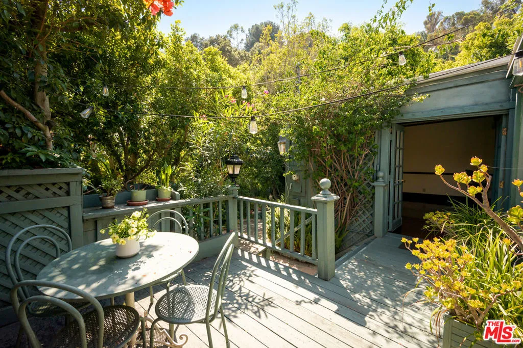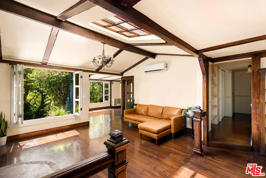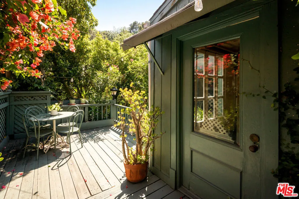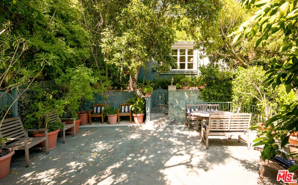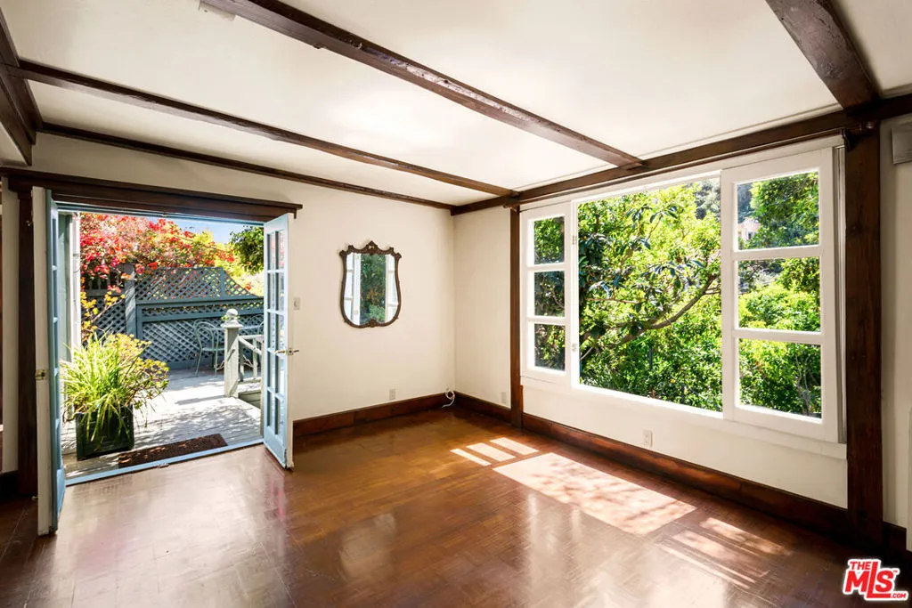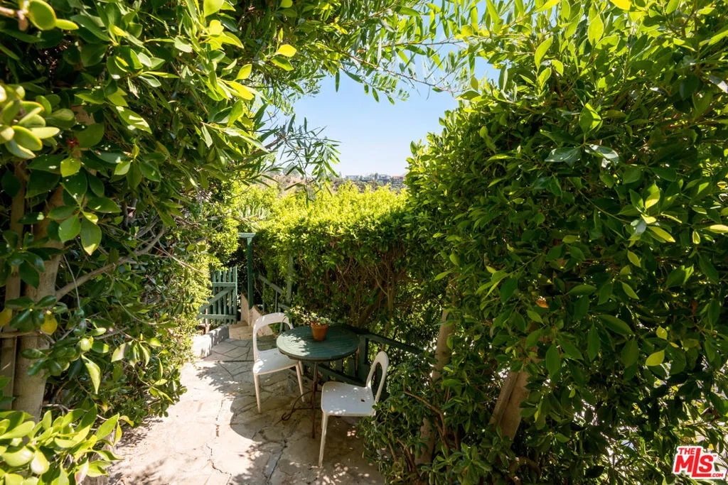 Set in the hills of Beachwood Canyon, this private, gated residence blends timeless European character with effortless California lifestyle. Surrounded by lush landscaping on a quiet, tree-lined street, both tucked away yet moments from the energy of the village. Interiors are warm and refined, with antique wood floors, beamed ceilings, and architectural details throughout. Natural light pours in through French doors and three artist skylights; creating an airy, indoor-outdoor flow perfect for entertaining. The layout offers 2 bedrooms, 1 full bath, a formal dining area, library, laundry area and a bright, flexible office space. Outside, a sun deck and expansive rooftop garden create a true extension of the living space. Ideal for entertaining and unwinding. A hidden hillside retreat reveals sweeping canyon views. Additional features include a detached two-car garage and mature citrus trees. Zoned LARD4, the property also presents future development or expansion potential, adding a compelling long-term opportunity. Located just two blocks from Beachwood Village, minutes from the Hollywood Sign and Griffith Observatory, with easy access to hiking trails, cafes, and the Franklin Strip. A rare offering that you do not want to miss.