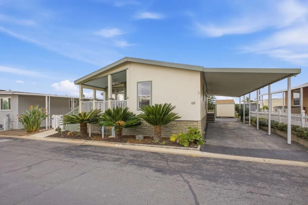 Welcome to this remodeled home located within the gated Rancho Mesa 55+ community. The front porch offers a comfortable outdoor space suitable for morning coffee, reading, or relaxing throughout the day. Inside, the home features updated flooring, newer appliances, and refreshed interior finishes. The layout offers an open-concept living and dining area with natural light throughout, creating a bright and functional living space. The kitchen is positioned adjacent to the main living area and includes ample cabinet storage and included appliances, providing convenience for everyday use and entertaining. This home offers three bedrooms and two full bathrooms, allowing flexibility for guests, a home office, or additional living space. The primary bedroom includes an en-suite bathroom. The exterior includes landscaped areas and a private outdoor setting. The Rancho Mesa community features gated access and maintained common areas, with proximity to shopping, dining, and other everyday amenities.