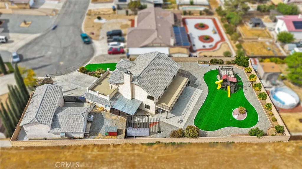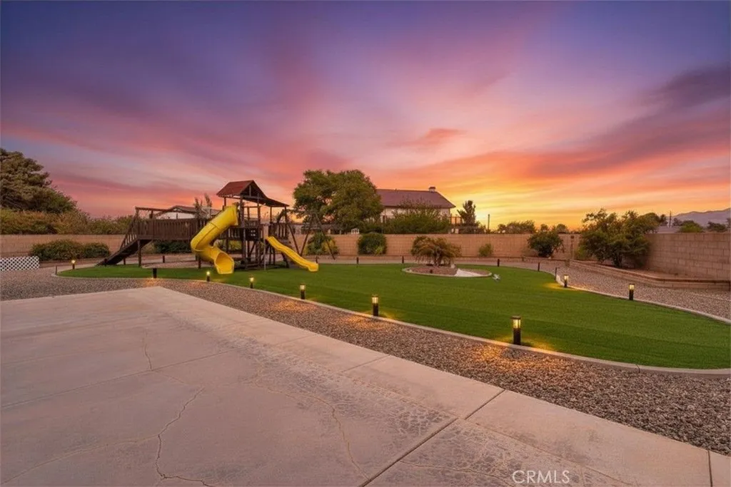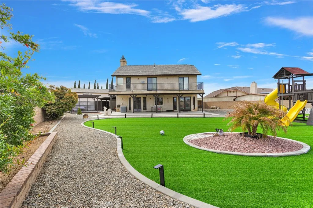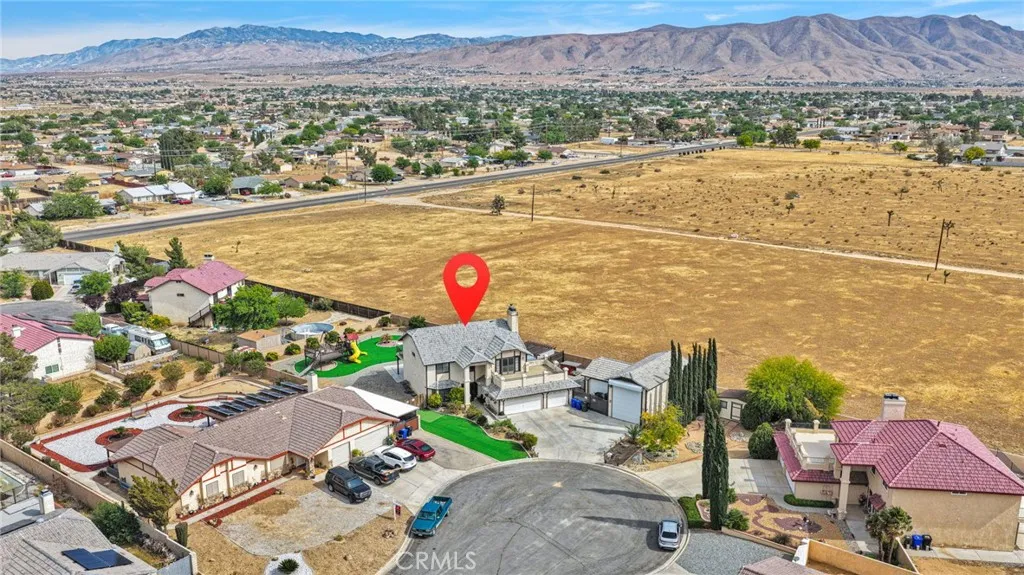 Welcome to this stunning Apple Valley home offering over 2,400 sq ft of spacious and thoughtfully designed living. Situated on a premium end of a quiet cul-de-sac lot, this property combines privacy, functionality, and beautiful mountain views. This 4-bedroom, 3-bathroom residence features a desirable layout with generous room sizes and abundant natural light throughout. Nearly every bedroom offers direct access to a balcony, creating a seamless indoor-outdoor feel, while the primary suite boasts its own private balcony retreat. The luxurious primary bathroom includes a walk-in closet, dual vanities, a soaking tub, and a separate shower, along with a cozy fireplace in the bedroom for added comfort and charm. The home is equipped with a wet bar, perfect for entertaining. A convenient indoor laundry room adds to the home’s practicality. Car enthusiasts and those needing extra space will appreciate the impressive garage setup, featuring a 3-car attached garage, a dedicated RV garage, and an additional detached 2-car garage. The property also offers RV access on both side yards, providing exceptional versatility. The fully landscaped front and backyard are enclosed by a block wall, offering both privacy and a polished curb appeal. This is a rare opportunity to own a well-appointed home with space, views, and amenities that truly set it apart.