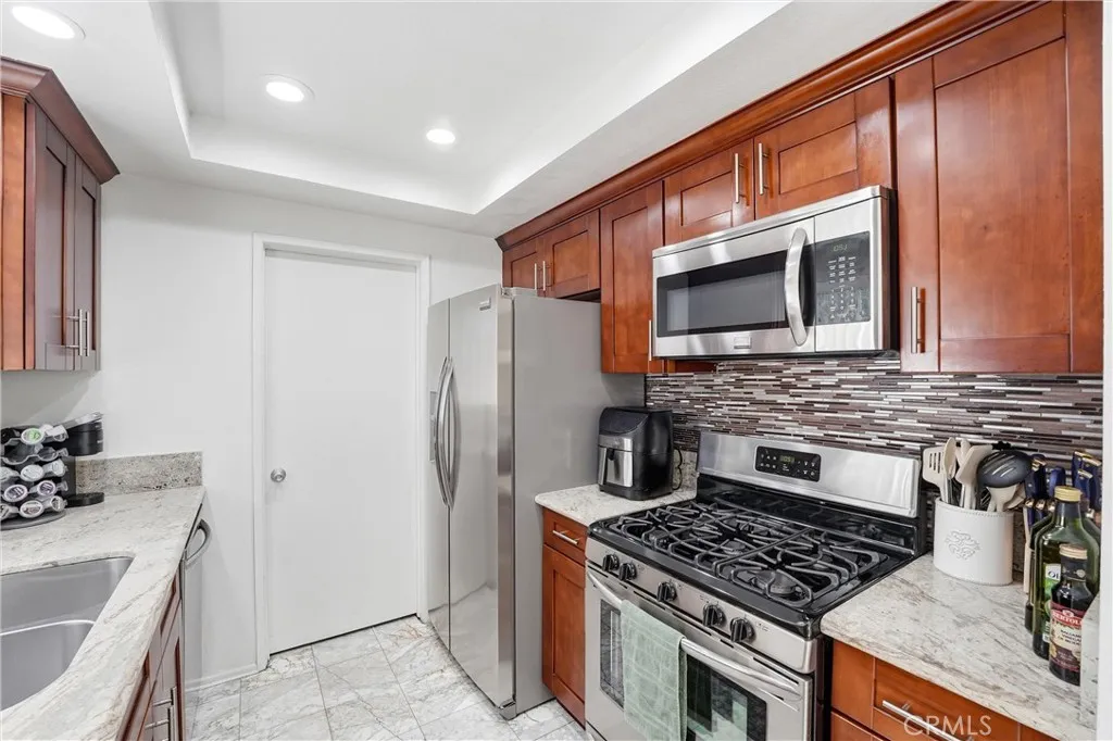 Spanish Corner Unit | Modern Finishes | 1 Parking | In Unit Laundry | Private Balcony A thoughtfully updated Spanish 2-bedroom, 2-bath corner-unit condo offering comfortable living in a well-connected Long Beach location in a community with a lush landscape. Set directly across from a landscaped greenbelt, creating a natural extension for walks, fresh air, and everyday ease with pets. This residence features a remodeled kitchen with natural stone countertops, shaker-style cabinetry, and stainless steel appliances, creating a clean and functional cooking space. The layout flows into a defined dining area and living room anchored by a fireplace, arched opening adding warmth and character to the main living space. As a corner unit, the home benefits from added privacy and natural light. Additional highlights, a private balcony suitable for outdoor seating, and an assigned parking space and an interior laundry area. Conveniently located near Wilson High School, Recreation Park Golf Course close to local dining, shopping, and coastal amenities throughout Long Beach.