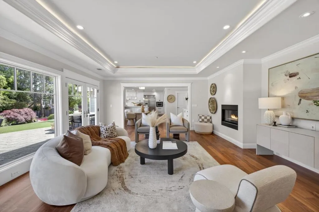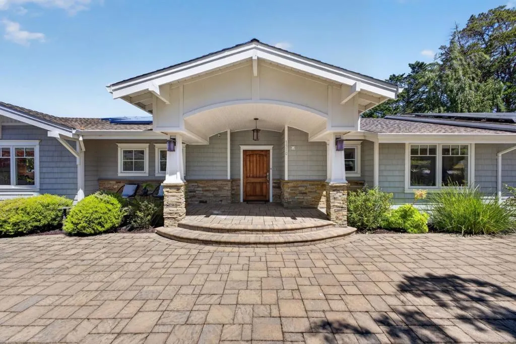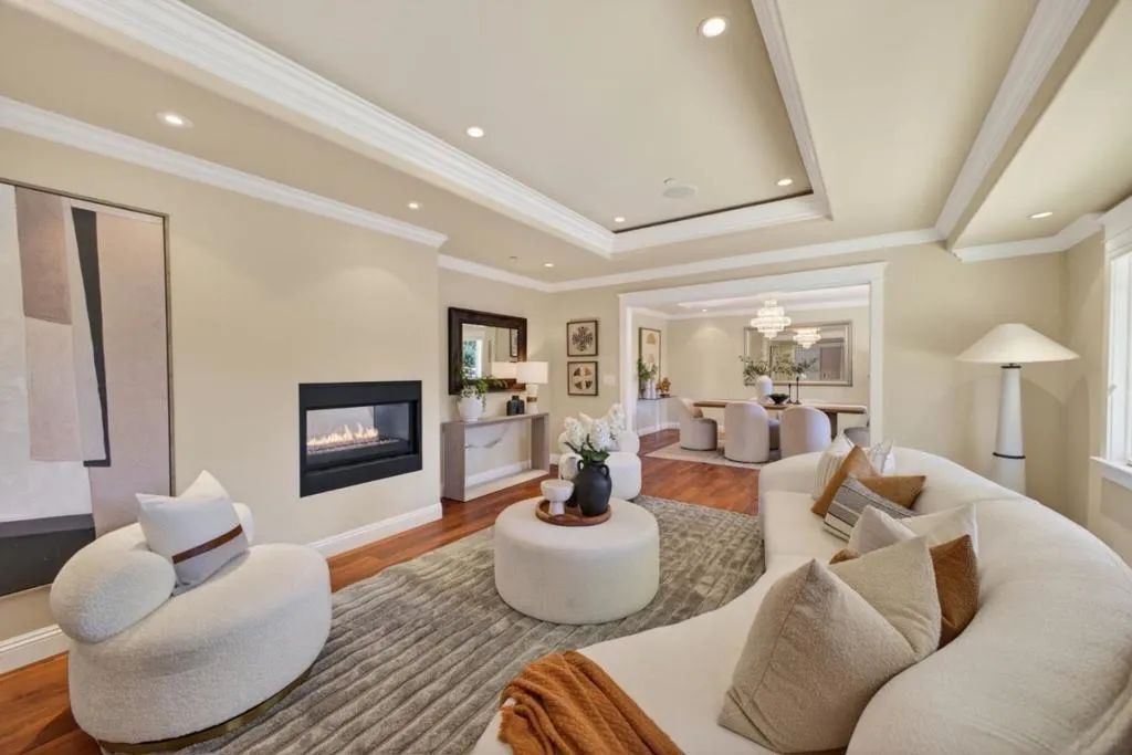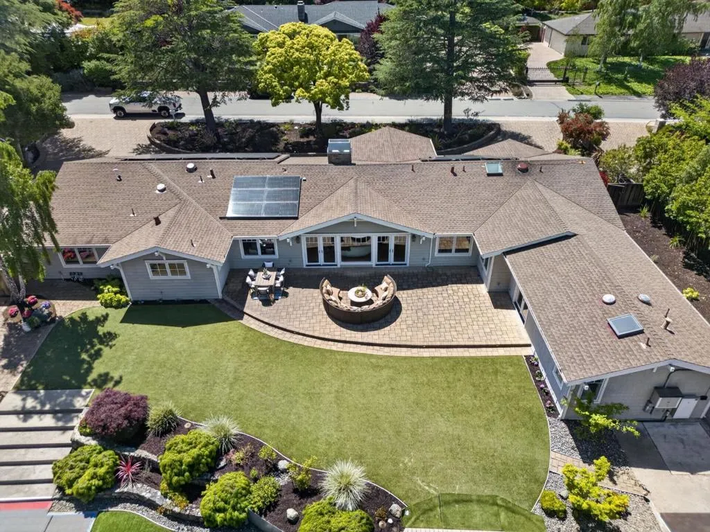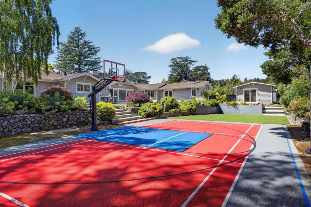 A MUST SEE, BEST OF THE BEST! Set on a flat, park-like half-acre lot, this beautifully renovated and expanded single-story home blends timeless elegance with modern functionality. A circular paver driveway leads to a covered front porch while also extending to a spacious motor court, providing access to a side-entry three-car garage with 2 Tesla EV chargers. Inside, hardwood floors and recessed lighting enhance a thoughtfully designed layout. A formal living room with a dual-sided fireplace--shared with the family room--flows into the formal dining area. The updated chef's kitchen features quartz countertops, a large island, stainless-steel appliances, abundant cabinetry, and a breakfast nook with a nearby powder room. French doors in the family room open to an expansive patio for seamless indoor-outdoor living. The private wing offers four bedrooms and four updated baths, including a luxurious primary suite with backyard access, dual walk-in closets, & a spa-like bath with soaking tub and glass shower. Grounds include turf lawns, a studio with kitchenette and powder room, a deck, and a pickleball court beneath a sport surface. Solar panels and a Tesla Powerwall add efficiency. 1510 Kingswood Dr represents the very best of Hillsborough living. Don't miss this turnkey masterpiece.