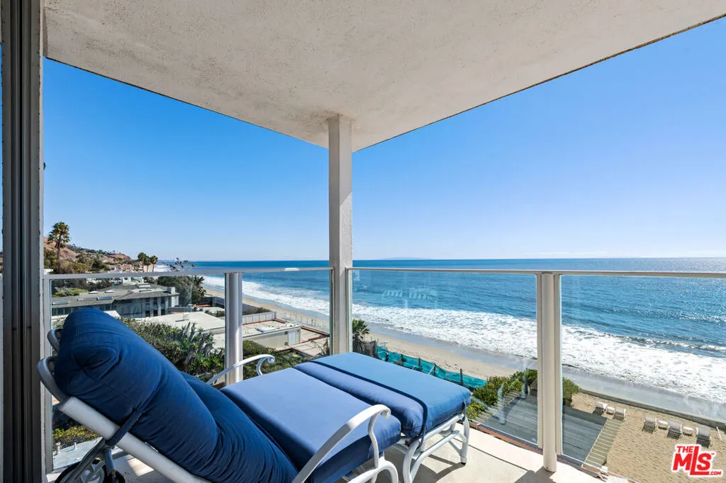 Set directly above the sand on Malibu's famed Carbon Beach, this top-floor corner residence at the exclusive Malibu Outrigger offers front-row panoramic ocean views stretching from Santa Monica to Catalina Island, with sightlines also capturing LAX and Palos Verdes. A rare opportunity in one of Malibu's few complexes with direct beach access and resort-style amenities, this sunlit condo blends timeless coastal charm with modern design. The open-concept living area features expansive walls of glass that frame endless blue horizons, a cozy fireplace, and seamless indoor-outdoor flow to a private oceanfront balcony perfect for morning coffee, outdoor dining, or watching dolphins play at sunset. The kitchen is beautifully designed with custom white cabinetry, granite countertops, and a stunning glass-tile backsplash.The ocean-view primary suite opens to the balcony and features a spa-like bath with dual vanities and a striking steam shower with Bose music system, clad in stone mosaic tile. A versatile second room doubles as a guest space or home office with built-ins, generous storage, and incredible coastline vistas. At the Malibu Outrigger, residents enjoy a heated oceanfront pool and spa, direct sandy beach access, an on-site management team, and an unparalleled location close in proximity to Soho House, Nobu, Malibu Pier, and the Country Mart. One covered parking space plus surface lot parking for additional cars and secure entry complete this rare beachfront offering.