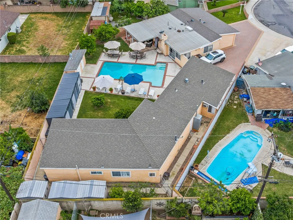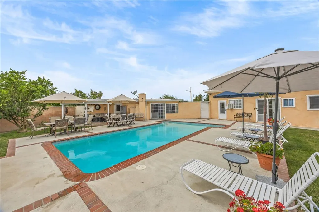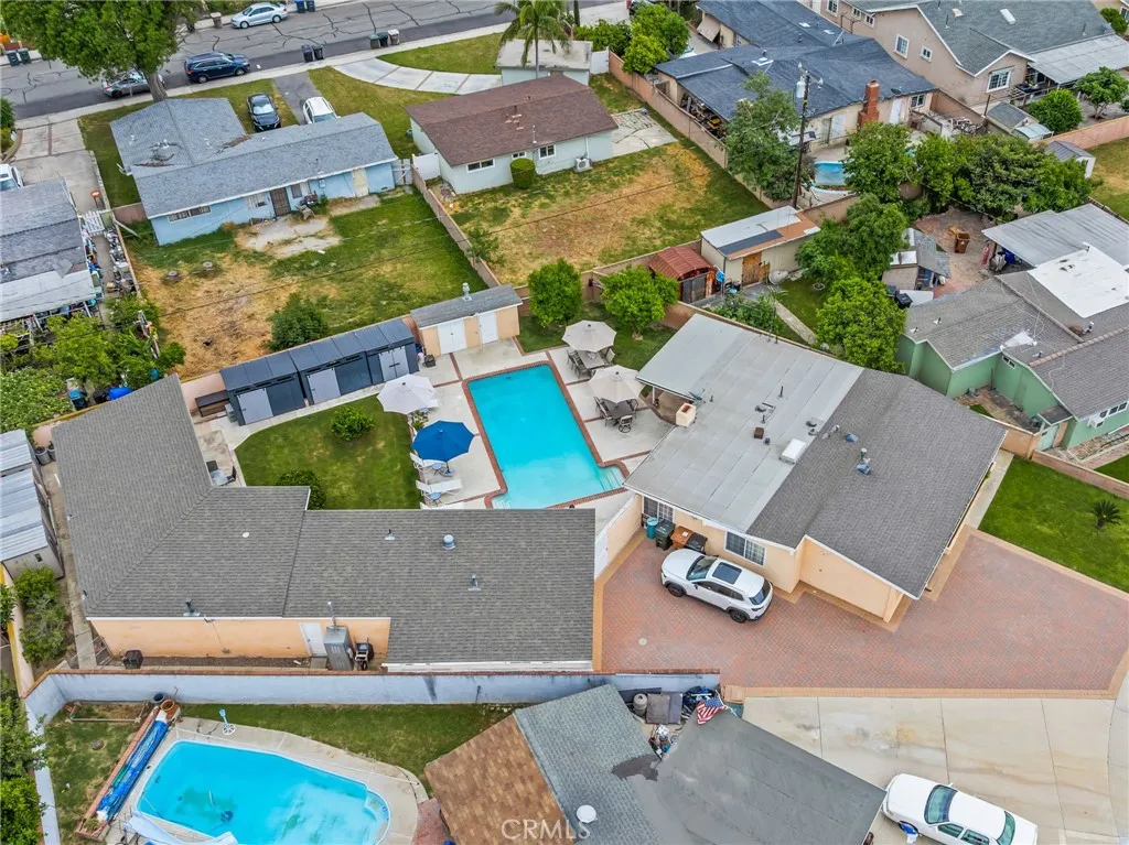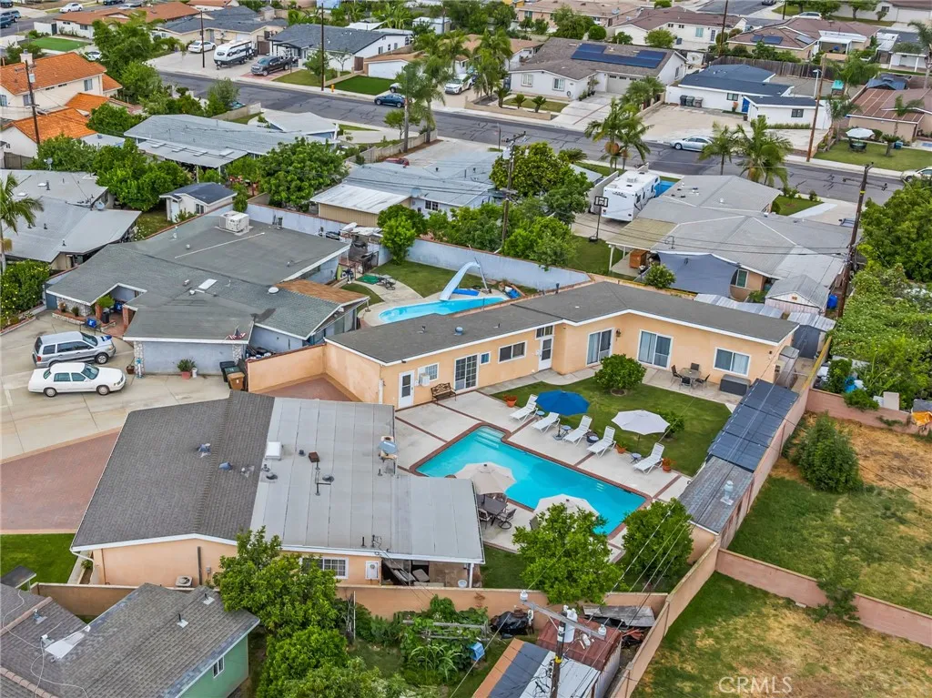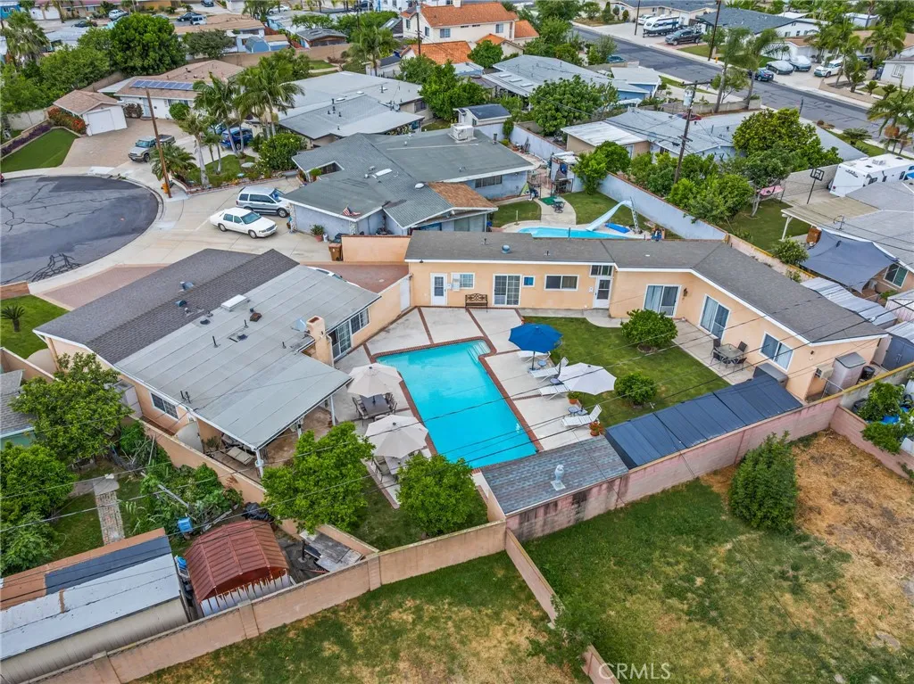 HOT BUY! Rare 2-on-a-lot located in the unincorporated area of Anaheim on a quiet cul-de-sac featuring three separate living units, a sparkling pool, and a highly versatile layout on a pie-shaped lot just under 1/4 acre, offering a unique blend of space, functionality, and potential for multi-generational living or income opportunities (buyer to verify). The single-story main residence includes 3 bedrooms and 2 bathrooms with upgraded finishes throughout, highlighted by a kitchen with stone countertops, matching stone backsplash, oak cabinetry, and stainless steel appliances that opens to the family room with fireplace, mantel, and built-in oak entertainment center, along with a formal living room off the entry. Additional upgrades include recessed lighting, a skylight, vaulted finished ceilings, ceiling fans, and tile flooring throughout, while the spacious primary suite offers a large en-suite bathroom with dual sinks and mirrored closet doors. A covered patio with ceiling fans, TV, and speakers extends the living space outdoors, creating a true indoor-outdoor lifestyle. The detached secondary structure features two fully separate units with no shared walls, separated by a central laundry room with sink and exterior access to the pool and side yard. Unit 1 offers 1 bedroom, 1 bathroom, a kitchen, and family room, while Unit 2 offers 2 bedrooms, 1.25 bathrooms, a living room, and a spacious full kitchen with double oven and counter bar. Both units are upgraded with stone countertops, vaulted ceilings, ceiling fans, updated flooring, newer windows, and heating and air conditioning, each with private sliders leading directly to the backyard and pool area. Set on nearly 1/4 acre, the property also features low-maintenance landscaping, block walls, mature fruit trees, multiple high-end storage units, and an upgraded paver driveway with ample parking and potential RV or boat storage. Conveniently located near parks, schools, shopping, and dining, this is a rare opportunity in today’s market—schedule your private showing today before it’s gone.