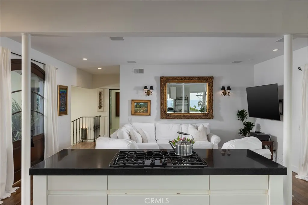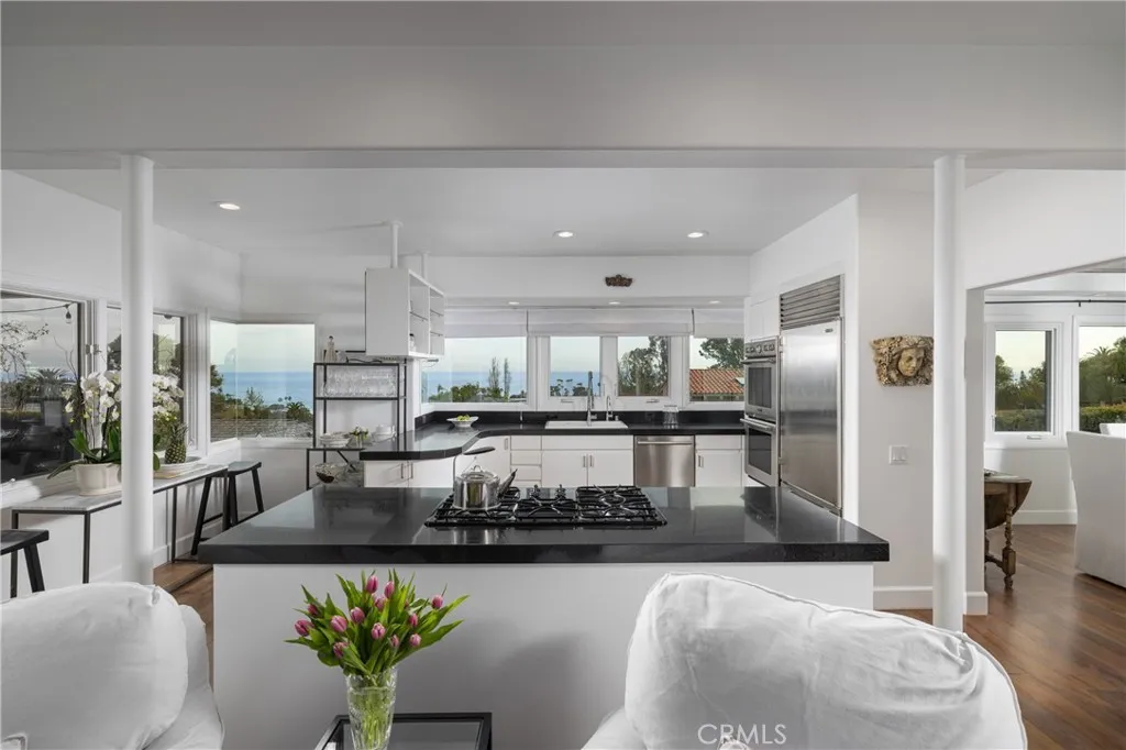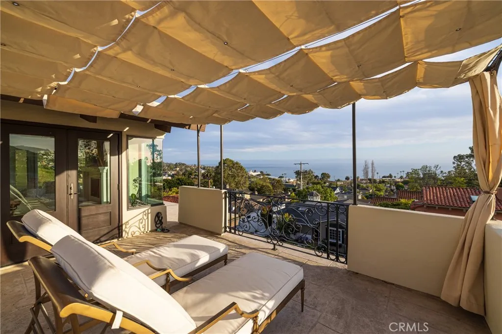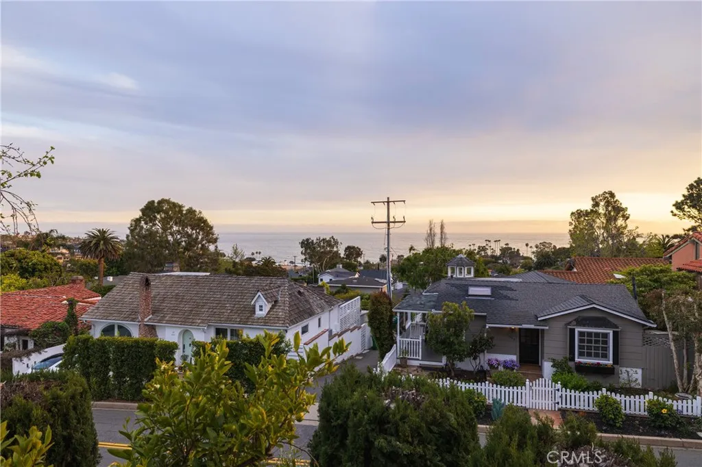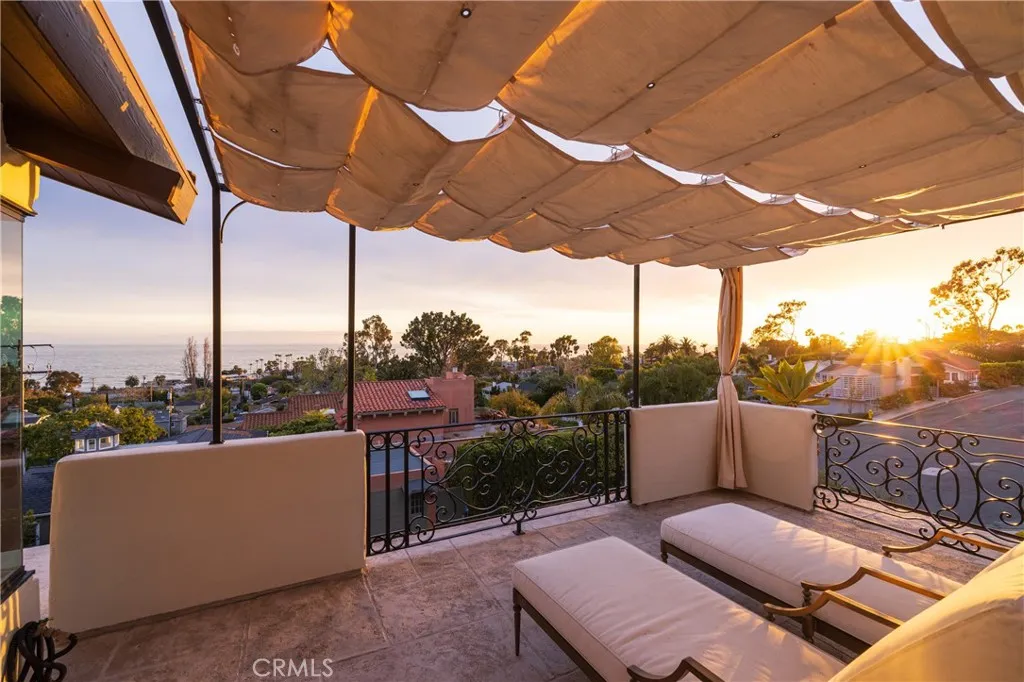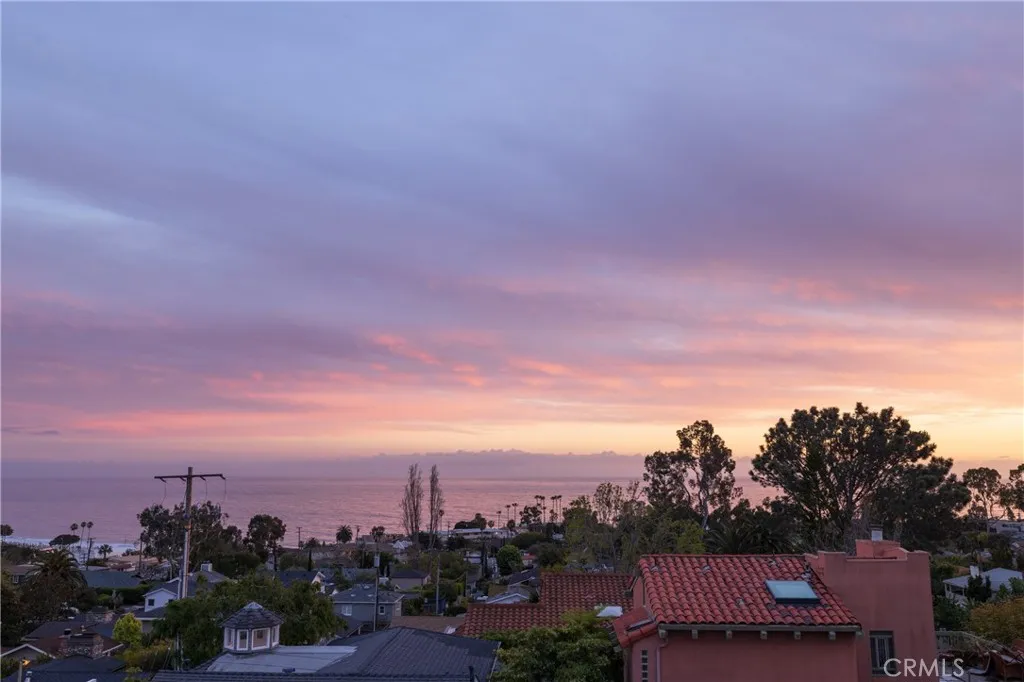 Located in the very desirable and sought-after Tree Streets in North Laguna Beach, this corner lot residence is embellished with approximately 103 feet of view frontage, offering picture-perfect white water/ocean, city, evening-light, Catalina Island, and sunset views from nearly every room. The elevated homesite is laid out over three levels and offers four bedrooms, four full baths, a library/office, and a large bonus room currently used as an exercise area. The main living level opens onto decks offering breathtaking vistas, as well as upgraded picture windows and an array of French doors, creating a seamless blend of indoor and outdoor living. Elegantly designed outdoor living spaces offer a perfect setting for gatherings, seamlessly extending onto large decks with stunning ocean views. The main level boasts a living room, kitchen, dining room, bedroom, and bath each designed with elegance and functionality in mind. Upstairs, the luxurious primary suite features a fireplace, private balcony, walk-in closet, and upgraded en suite bath with a soaking tub, separate walk-in shower with multiple shower heads, quartz counters, marble flooring, and vanity area. Fine craftsmanship is evident throughout, with rich beamed ceilings, elegant wood-plank flooring, and sophisticated recessed lighting. The library/office is located on a split level off of the main living area, as well as a very private bedroom and bath which offers a sweetheart balcony. The fourth bedroom and bath, as well as laundry, large gym, and garage, are on the lower level. Ample parking is provided by a lengthy driveway and one attached garage. The driveway will accommodate up to three vehicles. Ideally located minutes from the Dartmoor trailhead—a local favorite for hiking and biking enthusiasts—the home is also conveniently close to Crescent Bay, Main Beach, and Heisler Park, as well as within walking distance to Laguna's downtown shops and restaurants. This turn-key residence is a testament to luxury coastal living, promising an unmatched lifestyle in one of Laguna Beach's most coveted locations.