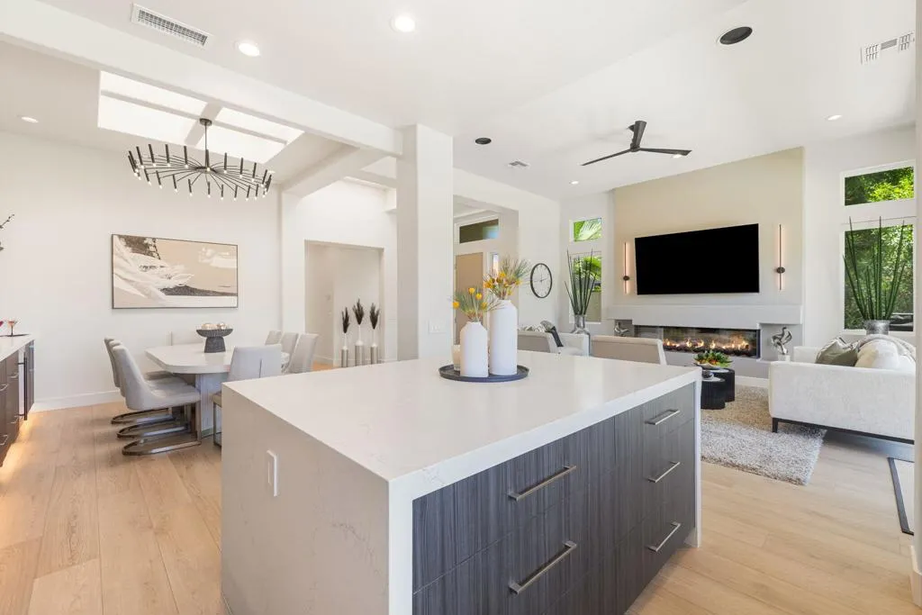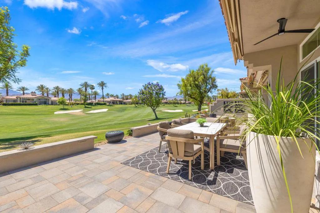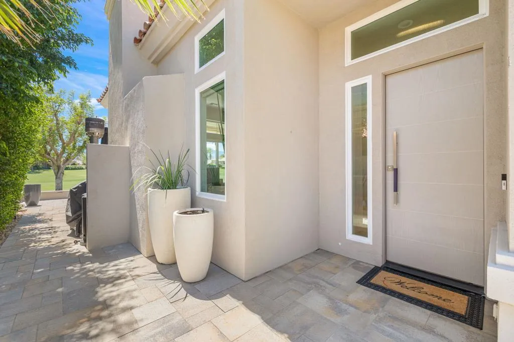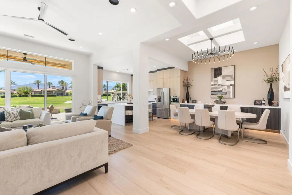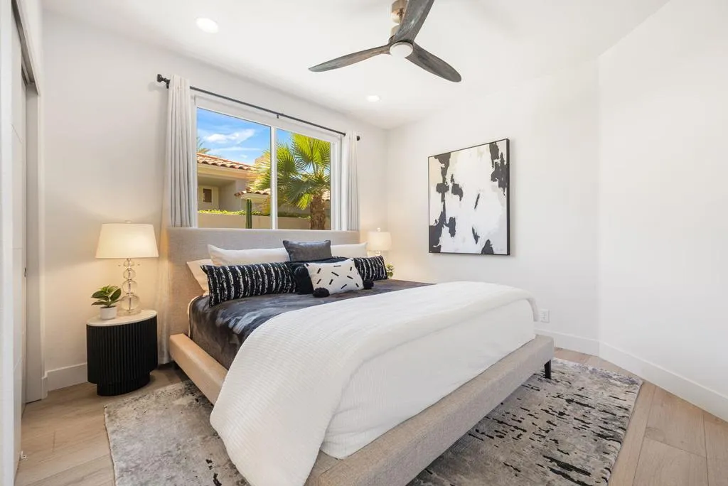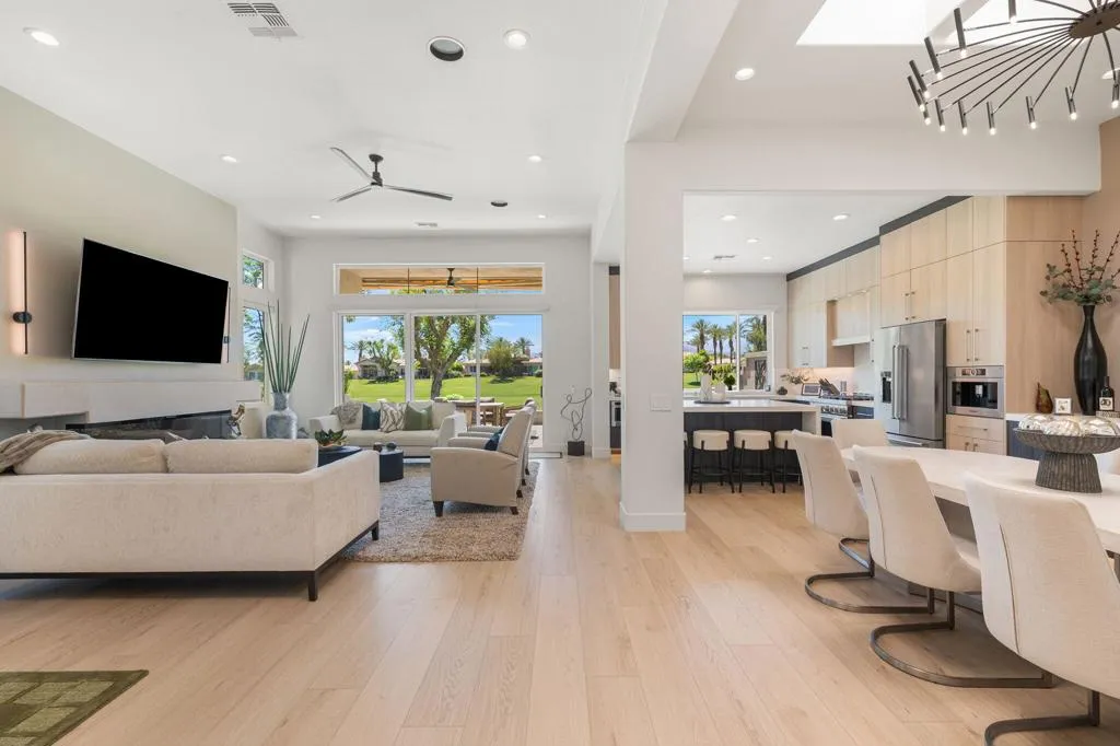 Reimagined and completely remodeled from top to bottom, this stunning Acacia 3 floor plan has been transformed into a sophisticated modern desert retreat. Walls have been removed to create an open, light-filled layout, and an additional powder bath has been thoughtfully added for enhanced functionality and effortless entertaining. From the moment you arrive, you'll appreciate the upgraded paver driveway, courtyard, and back patio, along with beautifully redesigned courtyard landscaping that sets the tone for seamless indoor-outdoor living. A custom front door makes a striking first impression and welcomes you into the home. Inside, luxury vinyl flooring flows throughout, complementing the reimagined kitchen featuring brand-new custom cabinetry, quartz countertops, and a full suite of new appliances, including a built-in Bosch espresso machine. The living room showcases a sleek electric fireplace and opens effortlessly to the outdoor spaces, perfectly positioned to capture desirable south-facing mountain views, and overlooks the 7th hole of The Grove course. The primary suite is a true showpiece, offering a spa-inspired bathroom with all-new cabinetry, quartz countertops, updated sinks and fixtures, a walk-in shower, and a bonus custom-designed closet. Two well-appointed guest bedrooms share a beautifully updated bath, providing comfortable and stylish accommodations for family and guests. Throughout the home, modern ceiling fans, designer sconces, and LED lighting create a warm yet contemporary ambiance. Even the laundry room has been thoughtfully designed with stylish finishes and functional upgrades that elevate everyday living. A newer air conditioning system adds year-round comfort and efficiency as well as all brand-new windows and sliders throughout the home. This is a rare opportunity to own a fully reimagined Acacia 3, offering high-end finishes, modern design, and exceptional attention to detail in one of Indian Ridge's most desirable settings. Home is being offered furnished per inventory. Club membership available or golf membership available per the waitlist.