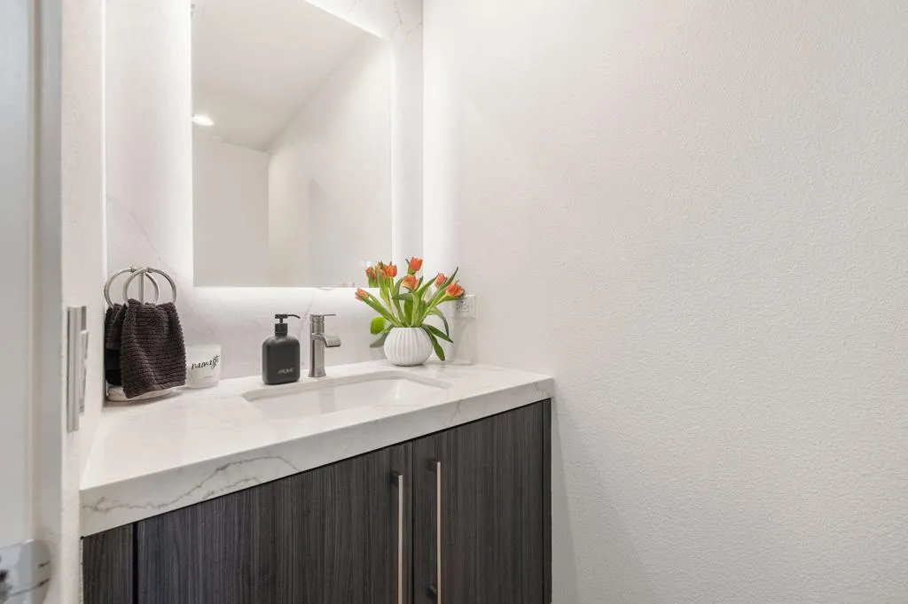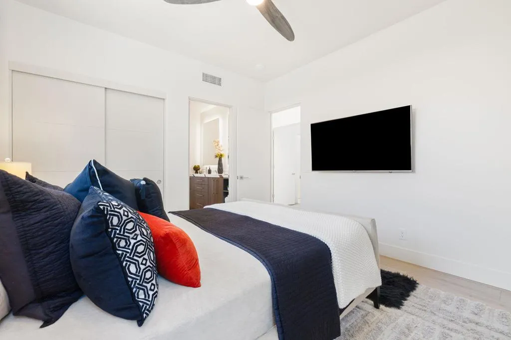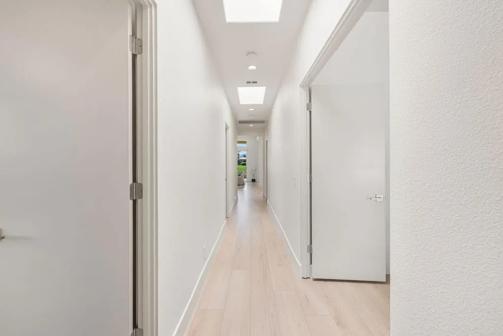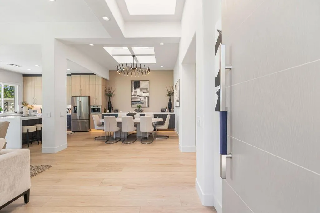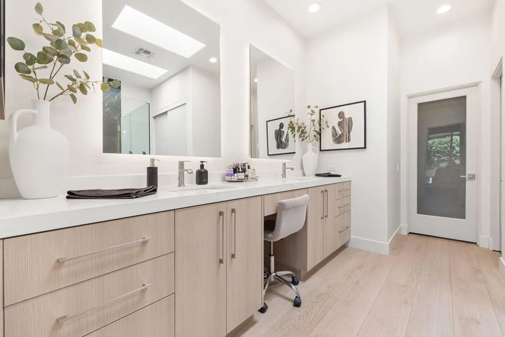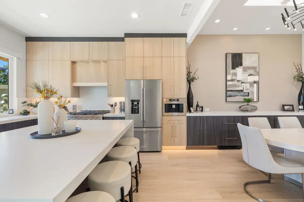 Reimagined and completely remodeled from top to bottom, this stunning Acacia 3 floor plan has been transformed into a sophisticated modern desert retreat. Walls have been removed to create an open, light-filled layout, and an additional powder bath has been thoughtfully added for enhanced functionality and effortless entertaining. From the moment you arrive, you'll appreciate the upgraded paver driveway, courtyard, and back patio, along with beautifully redesigned courtyard landscaping that sets the tone for seamless indoor-outdoor living. A custom front door makes a striking first impression and welcomes you into the home. Inside, luxury vinyl flooring flows throughout, complementing the reimagined kitchen featuring brand-new custom cabinetry, quartz countertops, and a full suite of new appliances, including a built-in Bosch espresso machine. The living room showcases a sleek electric fireplace and opens effortlessly to the outdoor spaces, perfectly positioned to capture desirable south-facing mountain views, and overlooks the 7th hole of The Grove course. The primary suite is a true showpiece, offering a spa-inspired bathroom with all-new cabinetry, quartz countertops, updated sinks and fixtures, a walk-in shower, and a bonus custom-designed closet. Two well-appointed guest bedrooms share a beautifully updated bath, providing comfortable and stylish accommodations for family and guests. Throughout the home, modern ceiling fans, designer sconces, and LED lighting create a warm yet contemporary ambiance. Even the laundry room has been thoughtfully designed with stylish finishes and functional upgrades that elevate everyday living. A newer air conditioning system adds year-round comfort and efficiency as well as all brand-new windows and sliders throughout the home. This is a rare opportunity to own a fully reimagined Acacia 3, offering high-end finishes, modern design, and exceptional attention to detail in one of Indian Ridge's most desirable settings. Home is being offered furnished per inventory. Club membership available or golf membership available per the waitlist.