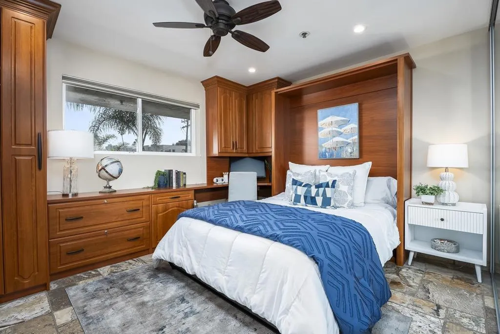 Welcome to coastal living at its finest in this beautifully maintained 2-bedroom, 2-bathroom condo offering approximately 1,078 square feet, ideally located along the waterfront in Ocean Beach. Enjoy sweeping ocean views and refreshing sea breezes from your private balconies—perfect for morning coffee or relaxing at sunset. Inside, a bright and inviting open-concept layout showcases a beautifully updated kitchen with rich wood cabinetry, stainless steel appliances, and a stylish tile backsplash. The kitchen flows seamlessly into the dining and living areas, creating an ideal space for both everyday living and entertaining. A wall of mirrors enhances natural light and amplifies the sense of space, while modern lighting, ceiling fans, and warm-toned flooring complete the cohesive, move-in-ready design. The spacious primary suite offers a tranquil retreat with generous proportions, mirrored closet doors, and direct balcony access, along with a well-appointed en-suite bathroom featuring dual vanities, ample storage, and updated finishes. The versatile second bedroom features custom built-ins, a Murphy bed, and an updated en-suite bathroom, making it ideal for guests, a home office, or both. Additional highlights include abundant storage throughout, in-unit combo washer/dryer, and a secure building for added peace of mind. Located just steps from the sand and surf, and moments from the shops, dining, and vibrant energy of Newport Avenue, this home offers the ultimate blend of comfort, convenience, and coastal charm!