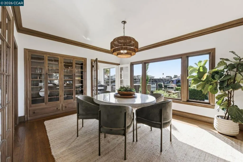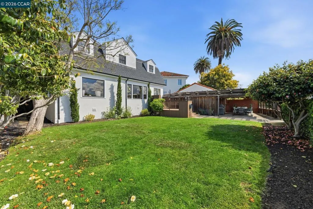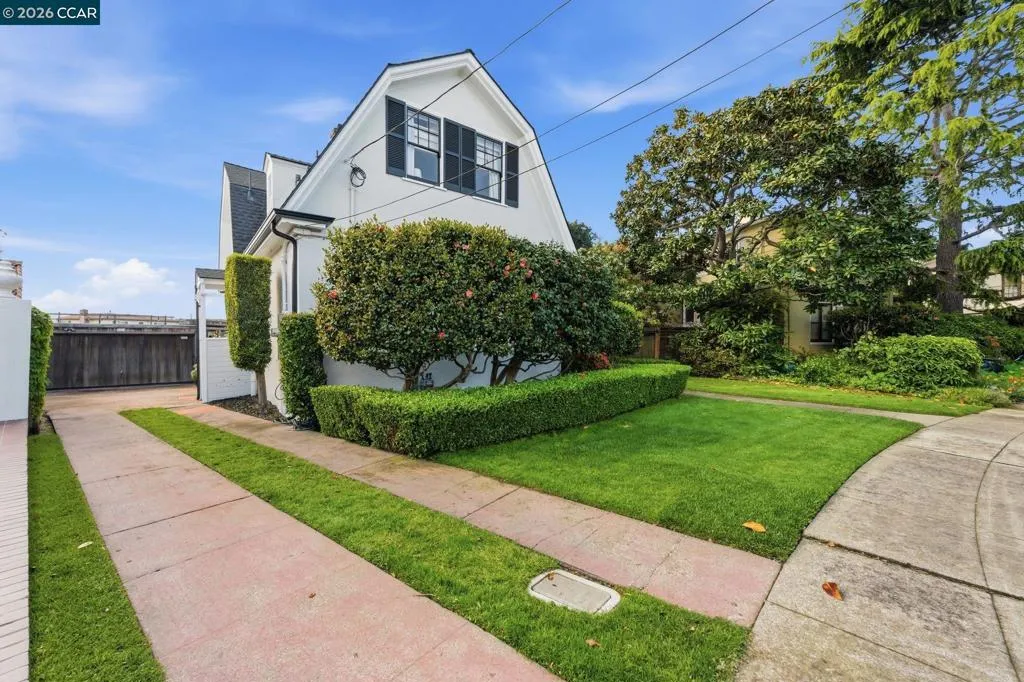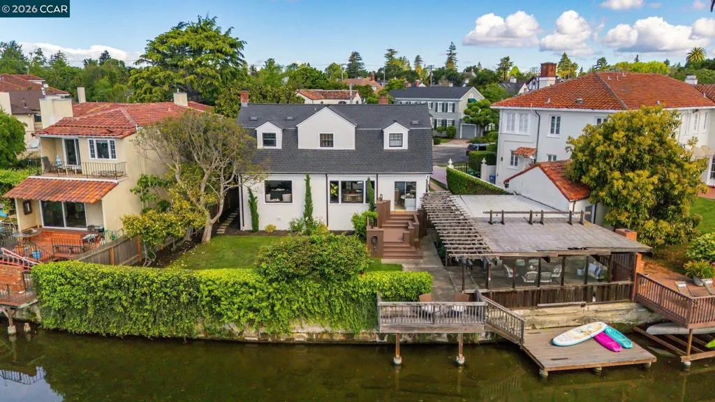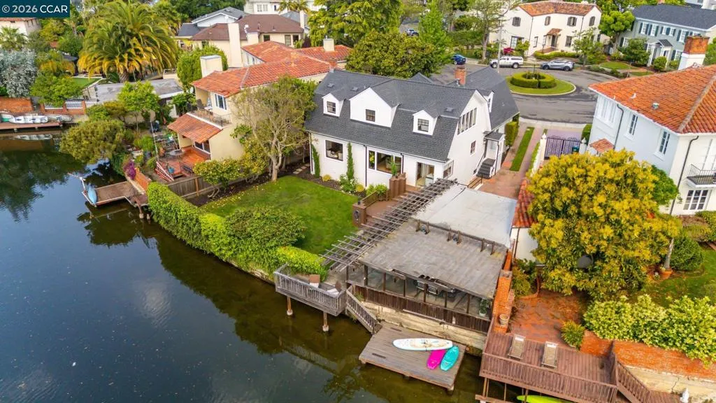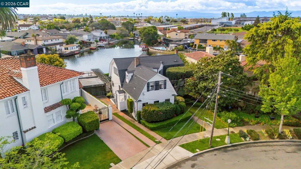 A rare offering along the lagoon in Alameda’s coveted Gold Coast, this elegant Tudor Revival–inspired residence on sought-after Palmera Court presents a compelling blend of timeless architecture, generous scale, and exceptional waterfront living. Set on an expansive 11,700± sq ft parcel, the property unfolds into a private retreat where level lawns, mature landscaping, and thoughtfully designed outdoor spaces create a setting of both beauty and ease. At the water’s edge, a covered pergola with integrated lighting serves as a refined open-air pavilion ideal for year-round dining and entertaining, while the adjacent deck offers a tranquil vantage point to take in the serene lagoon views. The grounds provide a rare combination of usable space and direct water access, delivering an effortless indoor-outdoor lifestyle that is both relaxed and sophisticated. Inside, approximately 2,465 sq ft of well-composed living space features 4 bedrooms and 3 baths, with a flexible two-story layout including the option for a main-level bedroom or office. Original hardwood floors, classic detailing, and abundant natural light enhance the home’s warm yet understated elegance. The living room is anchored by a traditional fireplace and framed by picture windows, while the kitchen and dining areas connect seamlessly to the rear grounds, reinforcing the home’s connection to its exceptional setting. Upstairs, well-proportioned bedrooms offer comfort, privacy, and versatility, supported by a thoughtful layout designed for everyday living and quiet retreat. Additional features include a detached garage, extended driveway, and ample off-street parking. A substantial basement with comfortable clearance provides excellent storage and offers potential for future use. Positioned on a welcoming court known for its strong sense of community, and just moments from top-rated schools, shoreline paths, Alameda Beach, and convenient SF Ferry access, this is a rare opportunity to own a distinguished residence in one of Alameda’s most desirable and tightly held waterfront enclaves.
