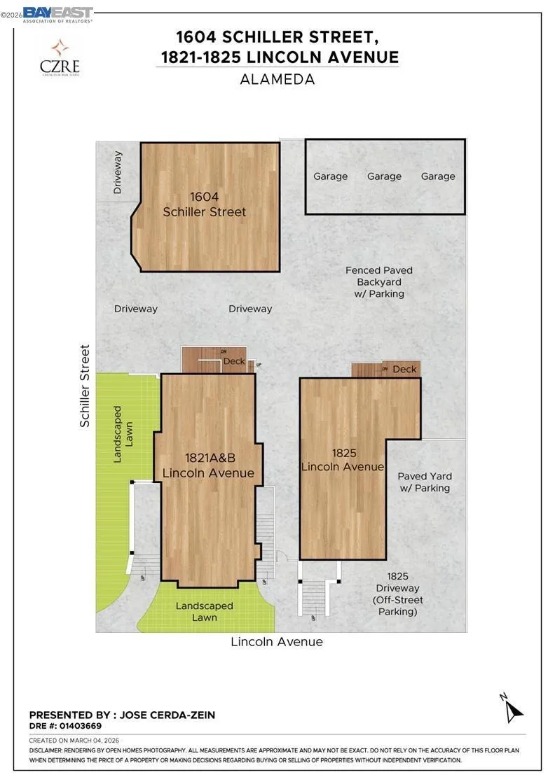 3 Homes on 1 Lot. 4 Units. Rare Alameda Opportunity. Located on the corner of Schiller & Lincoln, this unique compound-style property offers a flexible layout with 2 detached single-family homes and a duplex totaling 4 residential units. Opportunities like this rarely come to market in Alameda. The configuration creates multiple ownership paths for buyers exploring compound living, rental income, or long-term investment potential. Unit mix includes: 1604 – 2 bed / 1 bath; 1821A – 1 bed / 1.5 ba; 1821B – 2 bed / 1 ba; 1825 – 2 bed / 1 ba. The detached homes provide natural separation and flexibility, offering the possibility to live in one residence while generating income from the others or hold as a strategic long-term asset. A detached garage structure and the configuration of 3 homes on 1 lot may present additional possibilities for creative use, potential ADU, or future parcelization concepts. Ideally positioned near Grand Street with convenient access to Park Street, Webster Street, South Shore Center, neighborhood parks, dining, the SF Ferry, BART connections, AC Transit, and major commuter routes.
