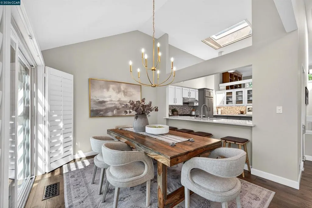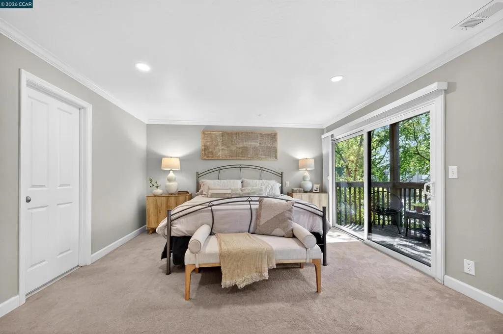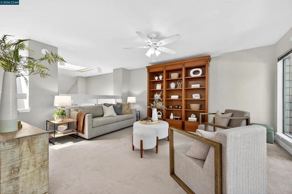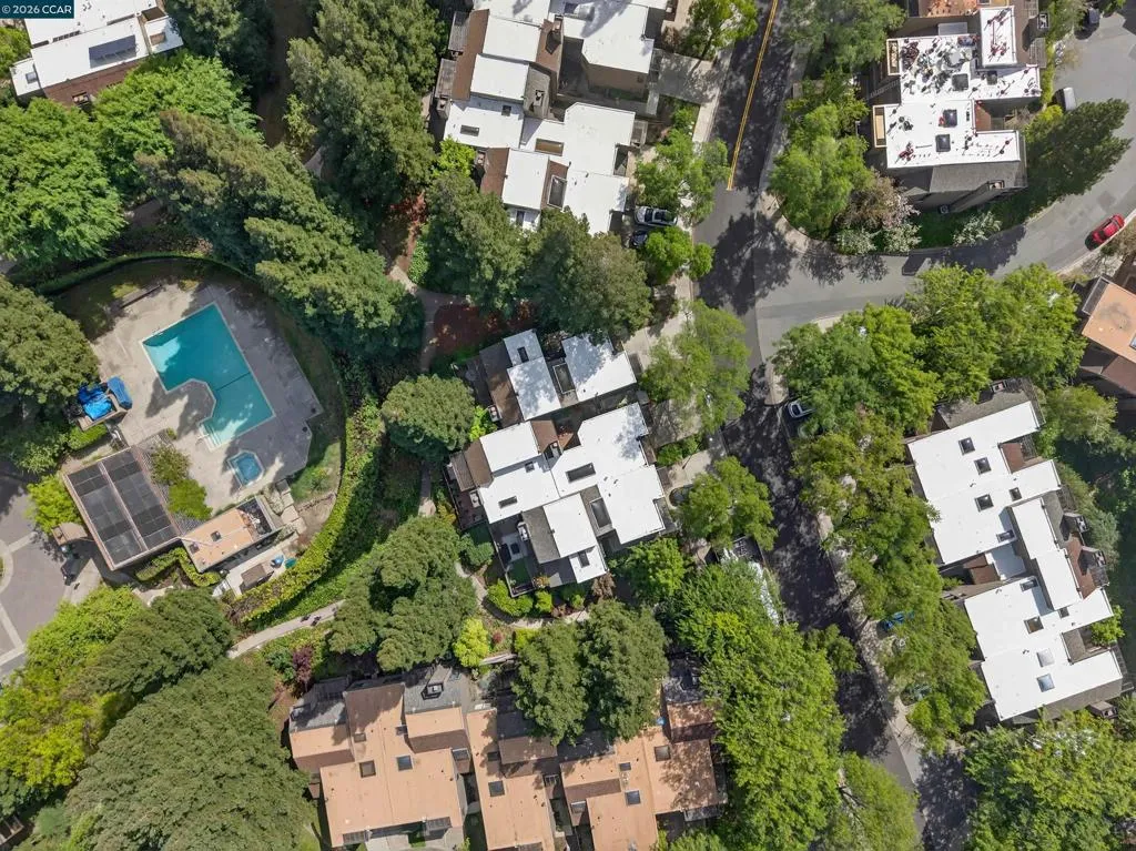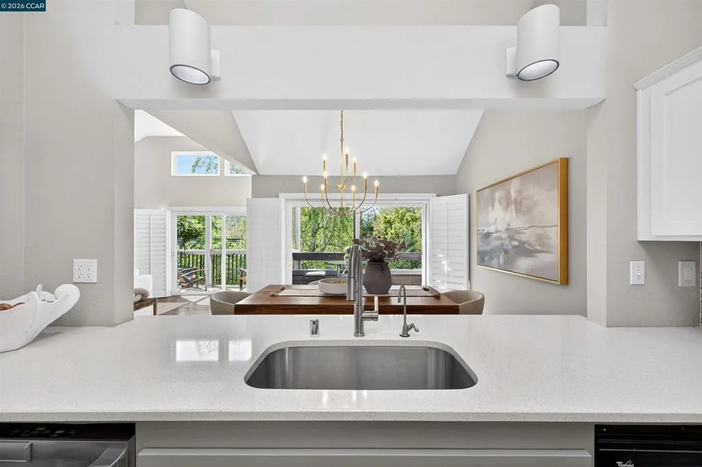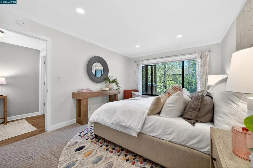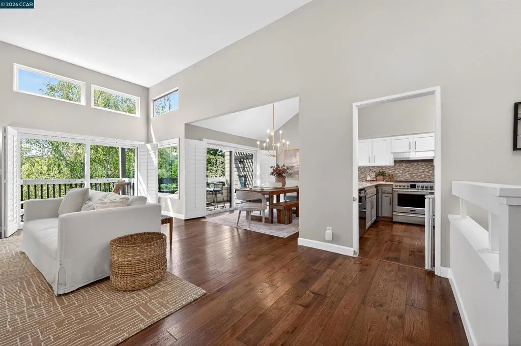 A rare corner unit in the Summit Ridge townhome community: wrap-around windows and 4 balconies are awash with sunlight and verdant views. Easy living with ample space, indoor-outdoor flow, and resort amenities. OOO Main floor has cathedral ceilings, transom windows, double sliders out to two decks, and generous flow for entertaining; gather around the fireplace where tall windows reveal the views, or in the luxe kitchen with room for multiple cooks, opening to a generous dining room and an eat-outside deck. Hickory floors connect the spaces with warm elegance. OOO The giant primary suite has its own woodsy deck and a walk-in closet; zero neighbor-shared walls ensures the peacefulness, and a striking updated bathroom features a soaking tub with an overhead rainfall shower and mosaic glazing. A second, generous bedroom is next door, alongside a peaceful second bathroom. OOO A potential third bedroom exists with the loft suite: it is spacious and bright with its own wrap-around windows and sliders out to a generous and private balcony. The half bath adjoins a study nook/home office/yoga pad for options. OOO. On the border with Lafayette, this close-in location offers direct access to Hwy24 and Lafayette BART, Lafayette schools, and the good food and fun of downtown Lafayette. OOO The private hilltop neighborhood is green and peaceful, and also alive with neighbors out walking their dogs or going for a bike ride, and children playing. Amenities include a community pool, a park and walking paths, private roads with sidewalks and benches viewing Mt. Diablo, and access to the Shell Ridge and Briones-Mt. Diablo trails. Come see this no-fuss lifestyle offering the best of all worlds.
