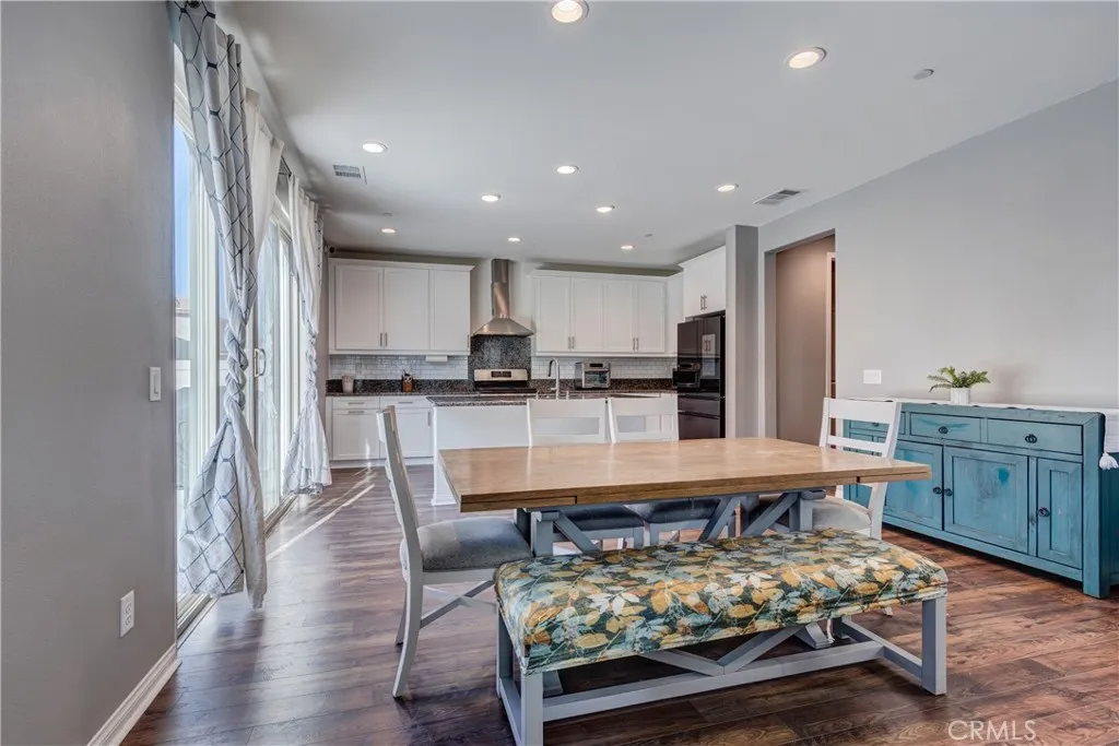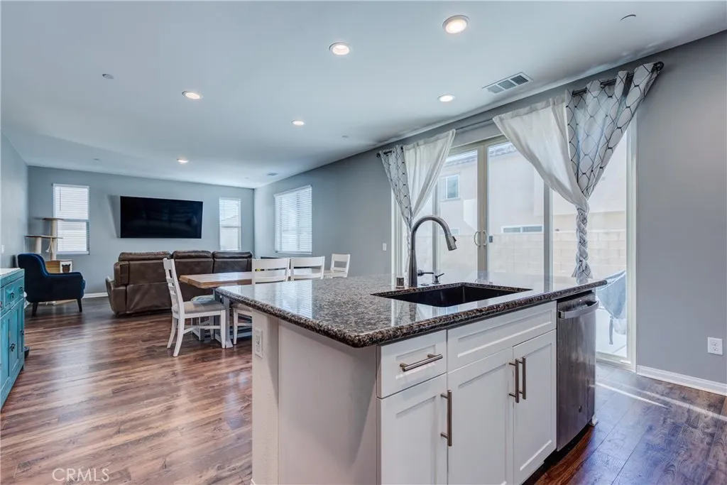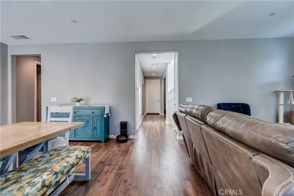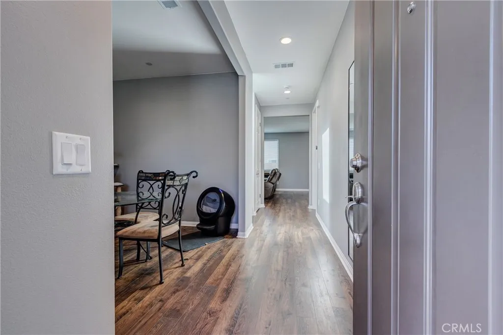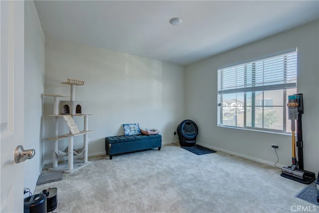 This bright home welcomes you with an open floor plan that begins with a versatile bonus room, perfect for a home office, hobby space, or formal dining area. Toward the back of the home, you’ll find a spacious great room that flows seamlessly into the dining area and a functional kitchen featuring a center island, backyard access. An open stair railing leads to the second floor, where the private owner’s suite offers a walk-in closet and an attached bathroom. Upstairs also includes a laundry area, two additional bedrooms, a full bathroom with double sinks, and a flexible loft space. The backyard is designed for easy enjoyment with a combination of concrete and turf, providing a low-maintenance space to relax, play, or entertain. Filled with natural light, this home offers generous living areas and a practical layout that makes everyday living effortless. Conveniently located near top-rated schools, with easy access to freeways 215, 10, and 210, and just minutes from grocery stores, shopping centers, and restaurants. The home is also situated within a well maintained gated community for added peace of mind.