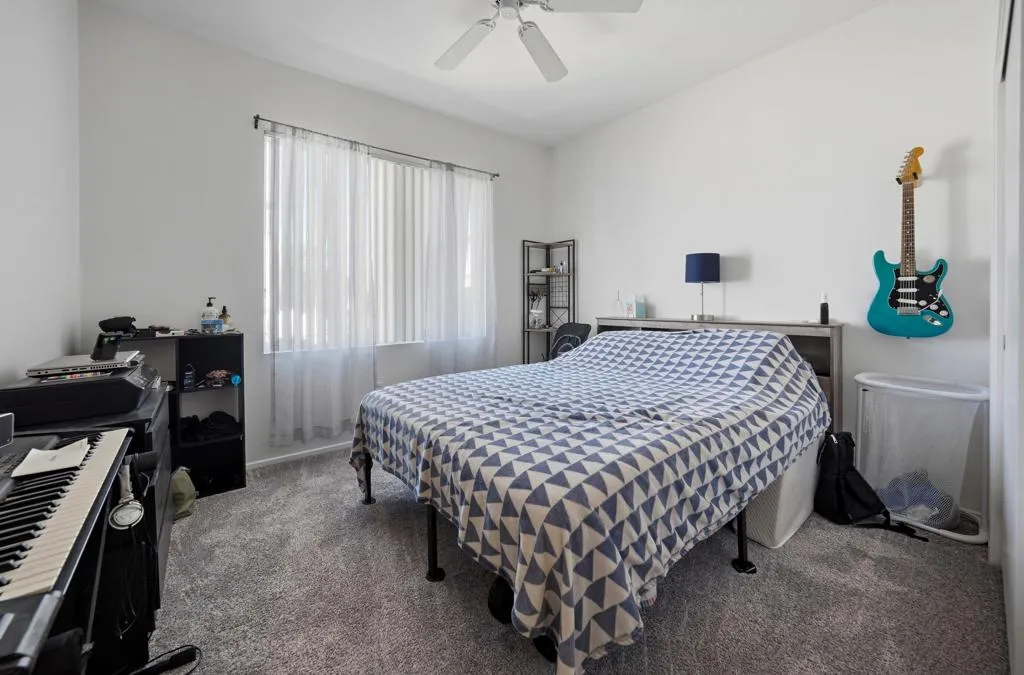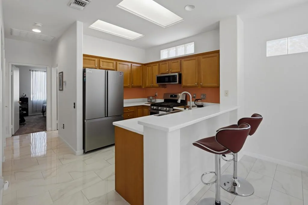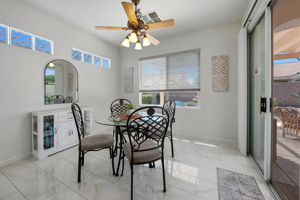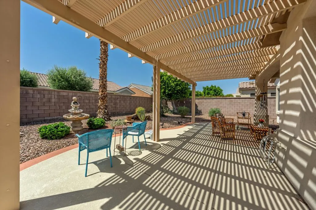 Sun City Palm Desert - Lanai. Ideally located between the Lakeview Clubhouse and the north manned gate, this beautifully upgraded home offers both convenience and comfort in a serene desert setting. Curb appeal is enhanced by a welcoming front courtyard featuring a decorative concrete patio, lush desert landscaping, and a phantom screen--creating a functional and inviting outdoor space. The spacious south-facing rear yard is equally impressive, complete with an extended decorative concrete patio, alumawood patio cover, and mature desert landscaping--perfect for relaxing or entertaining. Inside, 12x24-inch tile laid on the offset runs throughout the home, with carpet reserved for the bedrooms. The open living room includes a built-in media nook, while the kitchen is well-appointed with Corian countertops, stainless steel appliances, and a convenient breakfast bar. The dining area opens to the rear patio via a sliding glass door, blending indoor and outdoor living. The primary suite features a bay window and a large walk-in closet. Its en suite bathroom offers a stall shower with a textured glass enclosure and a seated vanity. The guest bathroom includes a tub/shower combination. Additional features include an extended 2-car garage with ample storage space and a new air conditioning system installed in 2025. This home combines thoughtful upgrades, comfortable living spaces, and an excellent location within the community.