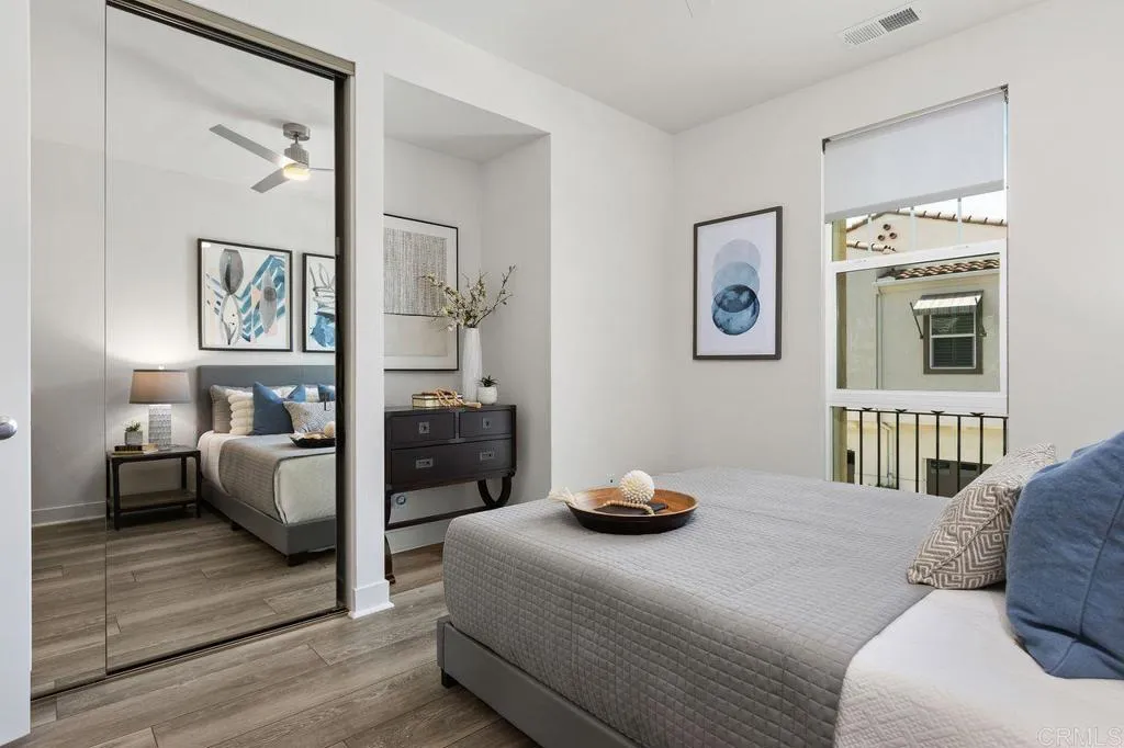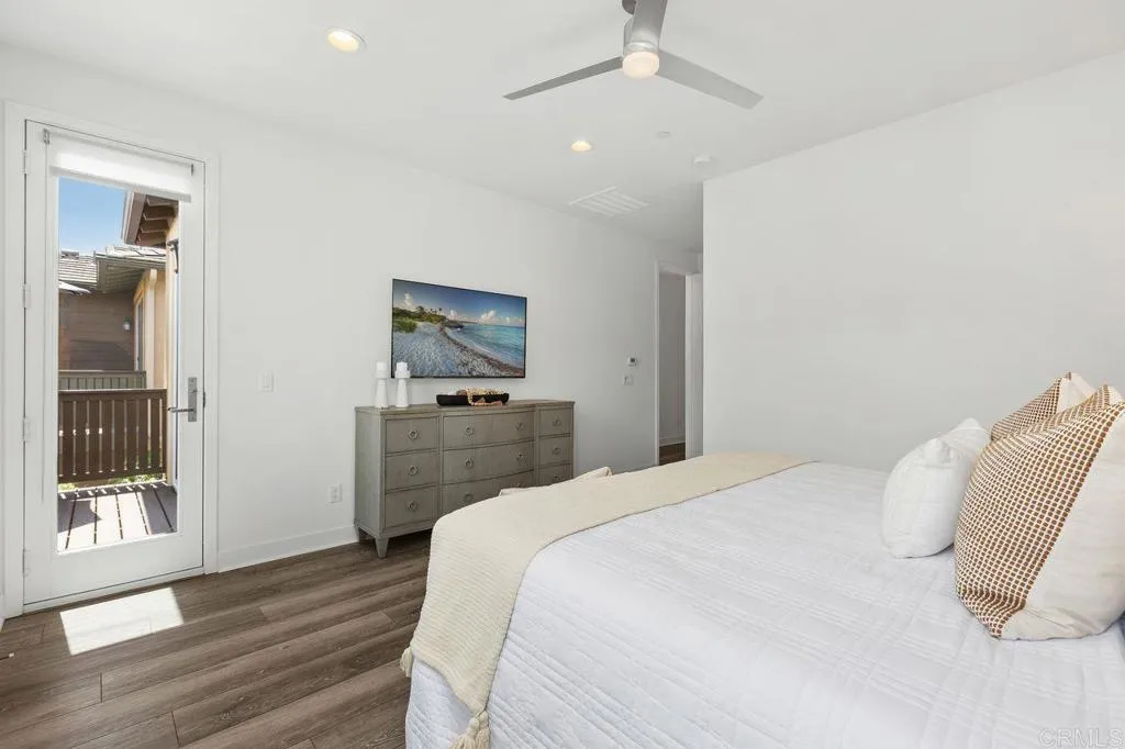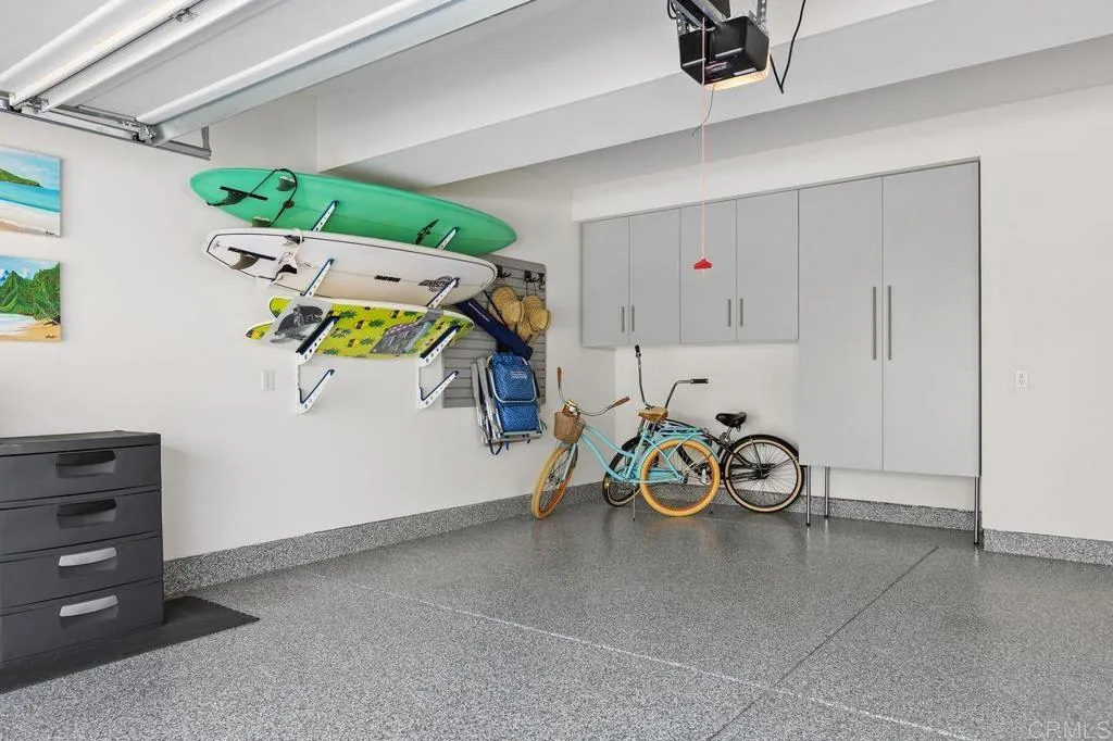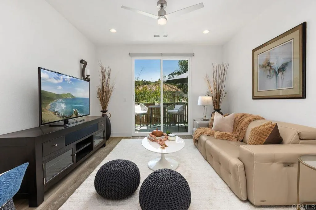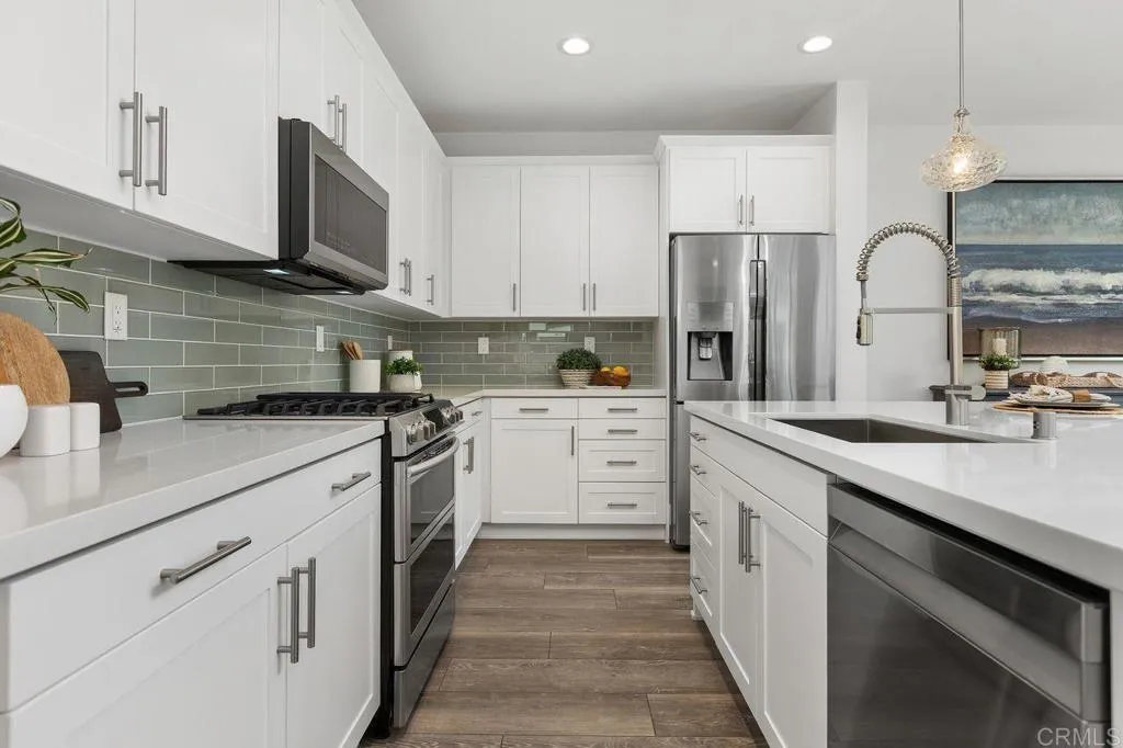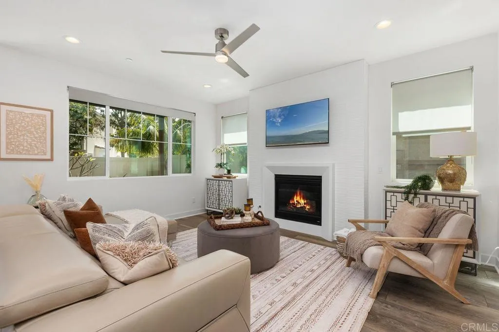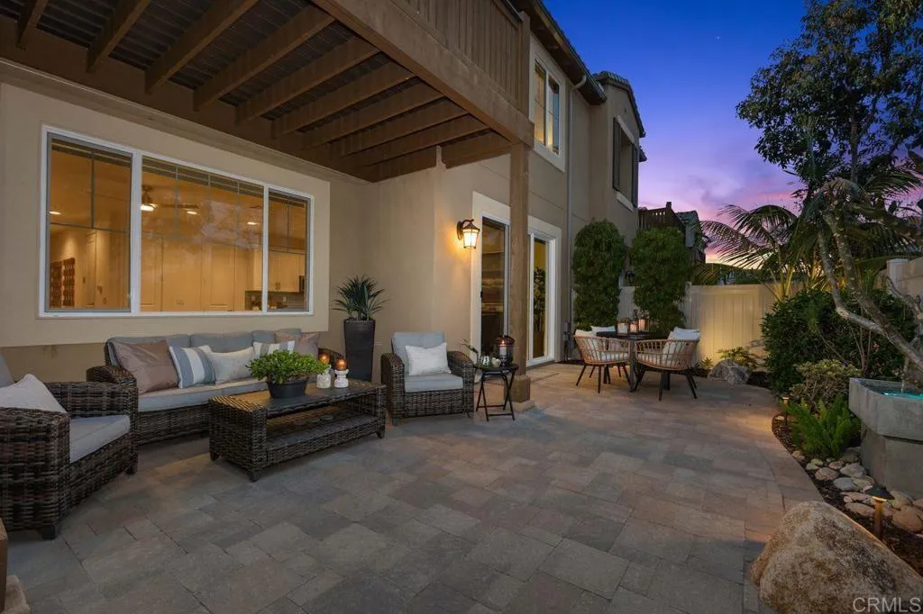 Nestled within the highly desirable Preserve community just miles from Carlsbad State Beach, this exceptional home offers the perfect blend of modern luxury and natural serenity. Ideally located within walking distance to shopping, dining, and transportation, it delivers both convenience and an elevated lifestyle. Step inside to an expansive open-concept floor plan that seamlessly blends sophistication with high-end, functional design. The chef-inspired kitchen is a true centerpiece, featuring striking white shaker cabinetry, a sophisticated glass backsplash, wide-plank wood-look flooring, and premium stainless steel appliances—including a five-burner gas stove. An oversized center island with a large single-basin sink, pull-down faucet, and custom glass-blown pendant lighting is complemented by timeless light-toned quartz countertops. The kitchen flows effortlessly into the inviting family room, where a cozy fireplace creates the perfect gathering space. Expansive sliding glass doors open to your private backyard oasis, complete with elegant custom pavers, lush tropical landscaping, ambient lighting, and a calming water feature—ideal for relaxing or entertaining. Upstairs, the home continues to impress with three bedrooms and a versatile loft featuring abundant natural light, a custom ceiling fan, and direct access to a private balcony. The thoughtfully designed primary suite offers a peaceful retreat, privately situated away from the secondary bedrooms. Enjoy direct balcony access, custom ceiling fan, a spa-inspired ensuite with dual vanities, an expansive walk-in shower, and a spacious walk-in closet. The two secondary bedrooms offer large closet space and ample natural lighting. A conveniently located upstairs laundry room includes a utility sink and additional white shaker cabinetry. The garage is equally refined, featuring epoxy flooring, custom built-in cabinetry, and functional storage solutions. Residents of The Preserve enjoy resort-style amenities, including a beach-entry pool, lap lanes, spa, BBQ area, outdoor fireplace lounge, fitness center, gated dog park, playgrounds, scenic park areas, and miles of hiking trails—all surrounded by 156 acres of preserved open space. Located within the top-rated Carlsbad Unified School District, this is more than just a home—it’s the lifestyle you’ve been waiting for.