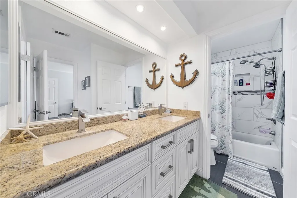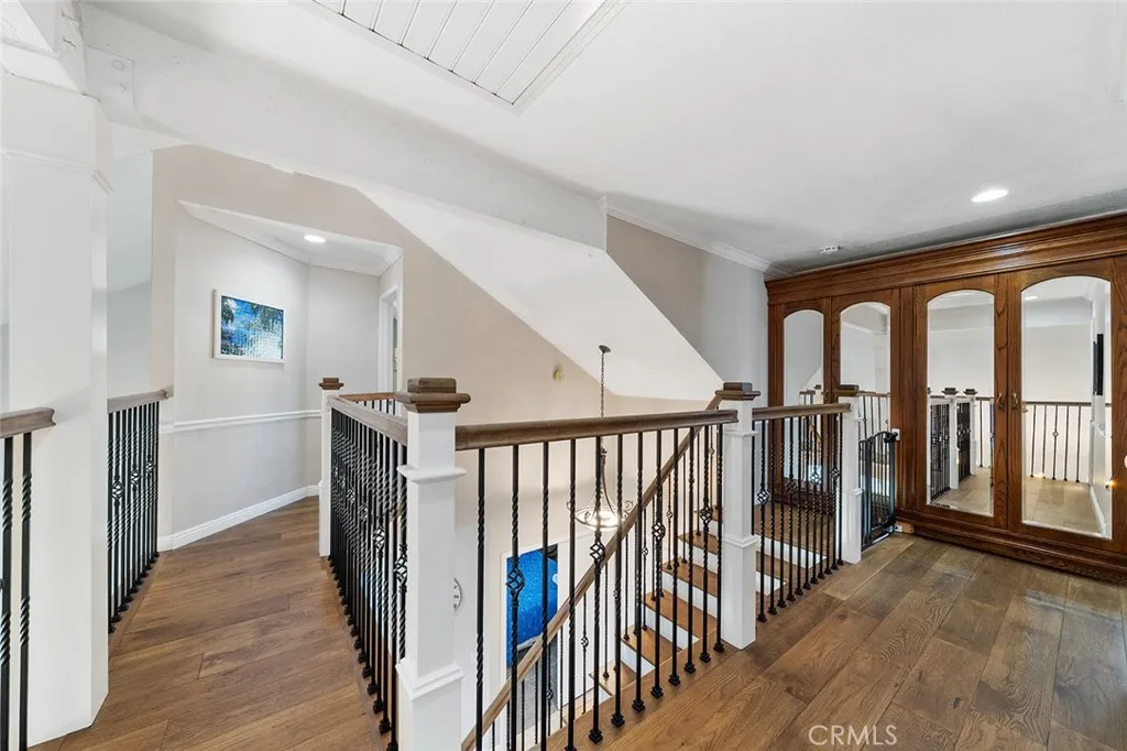 Charming Storybook Home in the Upland Foothills set in a Quiet Cul-de-Sac Location. Beautifully maintained and thoughtfully upgraded, this stunning home sits on an expansive 9,500+ sq ft lot in a desirable Upland foothill neighborhood. Exceptional curb appeal and lush landscaping welcome you into a bright, open floor plan with cathedral ceilings, freshly painted interiors, and abundant natural light. The main level features a downstairs bedroom and full bathroom, a spacious living room with exposed ceiling beam, formal dining room, and dry bar. The remodeled kitchen offers granite countertops, under-cabinet lighting, self-closing cabinets, a large pantry with pull-out drawers, and an extended island ideal for dining and entertaining. Built-in cabinetry with wine refrigerator complements the adjacent family room with brick fireplace and plantation shutters. A new custom wood staircase with decorative paneling leads upstairs to four spacious bedrooms, including one with a large attached closet/playroom. The fully remodeled upstairs bathrooms feature elegant tile flooring and granite countertops, including a Jack-and-Jill bathroom. Several bedrooms include oversized closets with custom built-in shoe racks. The primary bedroom opens to a private walk-on patio with scenic views. Flooring includes travertine and plush carpet downstairs, wood flooring upstairs, and laminate flooring in select bedrooms. The outdoor space is a true retreat with meticulously landscaped front and back yards. Features include a newly redone primary bedroom balcony with Trex decking and solar lighting, R.V. parking, stamped concrete, and a custom outdoor kitchen with 5-burner BBQ, sink, refrigerator, and storage. Additional highlights include insulated patio covers with remote-controlled fans, a fire pit, tranquil pond with two waterfalls, mature fruit trees (lemon, apple, avocado, orange), and a separate dog kennel area, large exterior shed, BRAND NEW AC SYSTEM, window seats with storage, shutters throughout, large walk-in closets, and solar panels. An exceptional blend of comfort, style, and outdoor living—this home is a must-see.