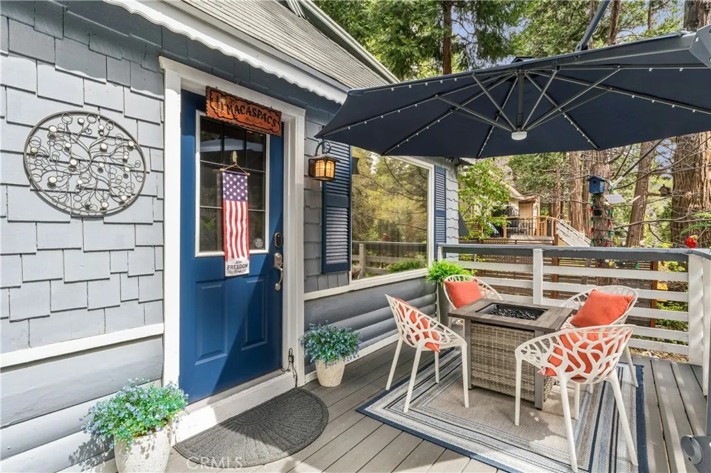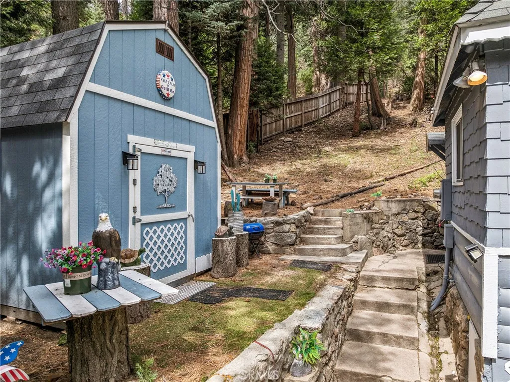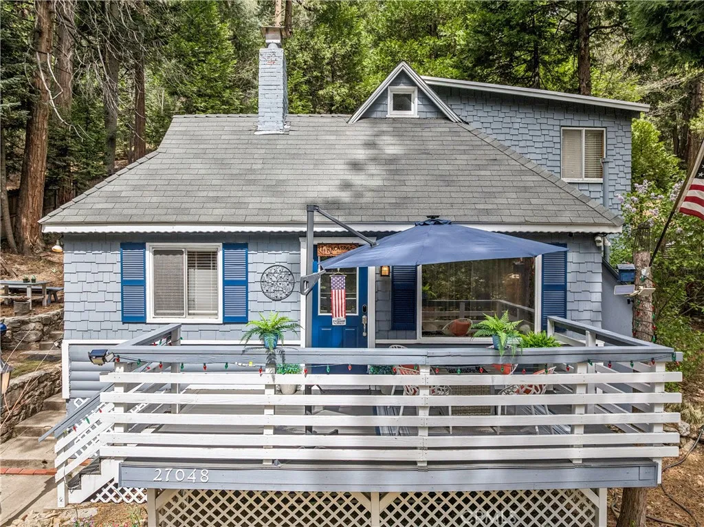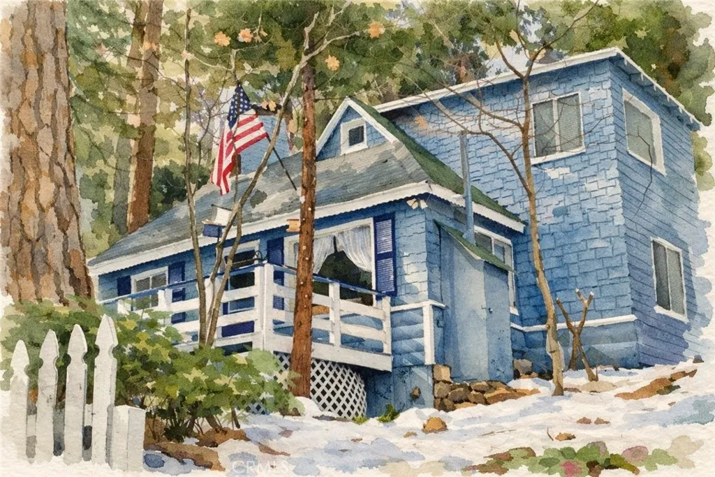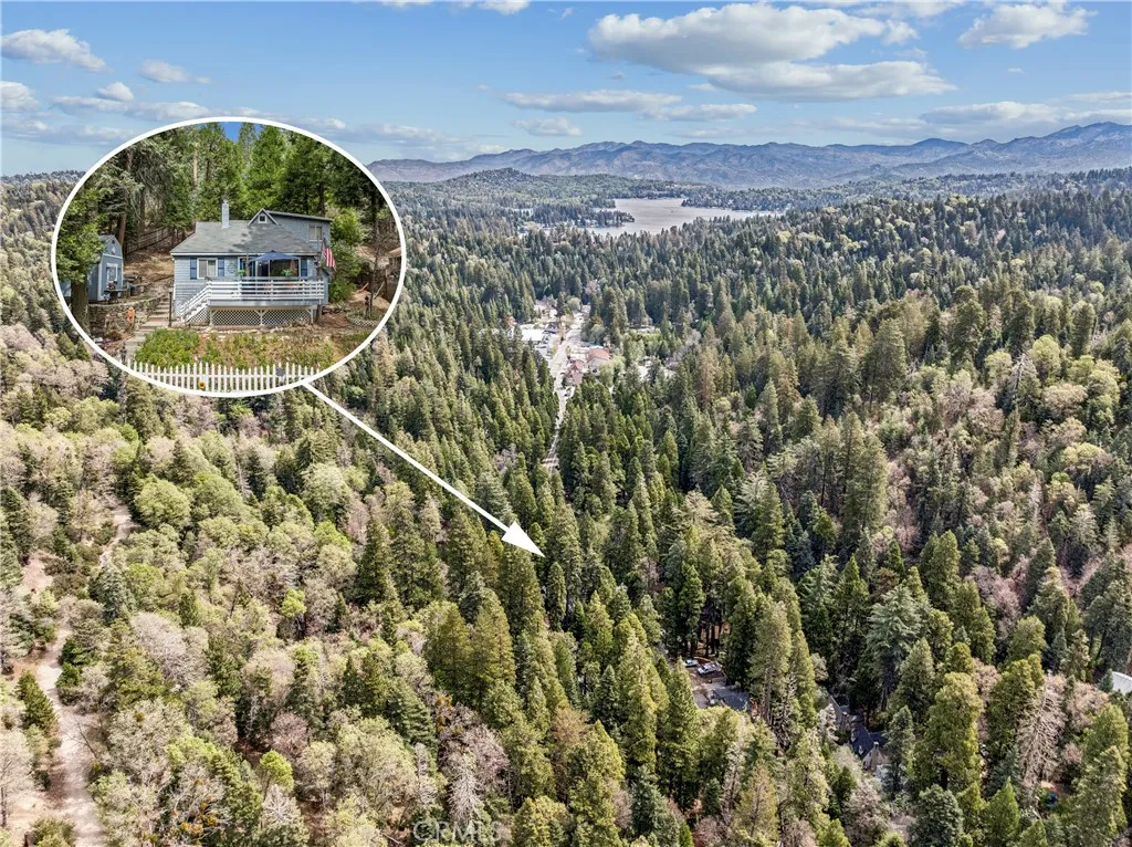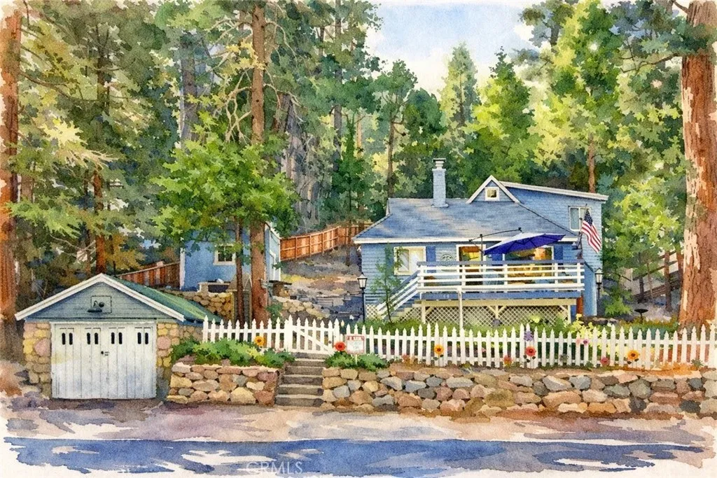 1923 Blue Jay vintage cabin backing to protected forest. Full of original charm and thoughtfully updated over the years, this 3-bedroom mountain retreat sits on a quarter-acre lot in a prime location less than a quarter mile from Blue Jay shops and restaurants and about half a mile to the lake. Features include an updated kitchen with Bosch dishwasher, updated full bath with original tub, updated plumbing and electrical, refurbished stone fireplace, and original refinished hardwood floors. The expanded downstairs bedroom accommodates a triple bunk bed plus a single bed, with two additional bedrooms upstairs. Recent improvements include interior and exterior paint, newer blinds, updated light fixtures selected to match the cabin’s vintage character, added corner cabinets, newer Trex front patio, umbrella solar lights, and firepit. Detached original deep single-car garage with stone walls provides great storage. A newer guest house on the side plateau offers space for up to 3 guests or flexible use as a storage structure. Set among mature cedar and pine trees, with access to nearby hiking trails and street-side parking for 3–4 cars, this furnished mountain getaway captures the charm of early Lake Arrowhead living.