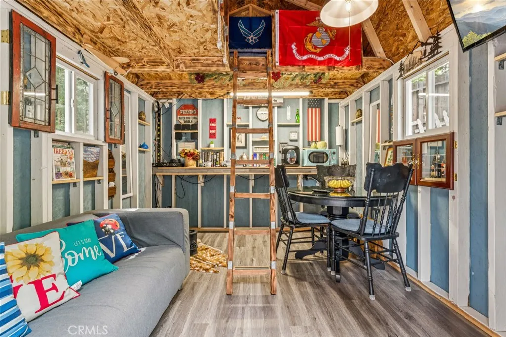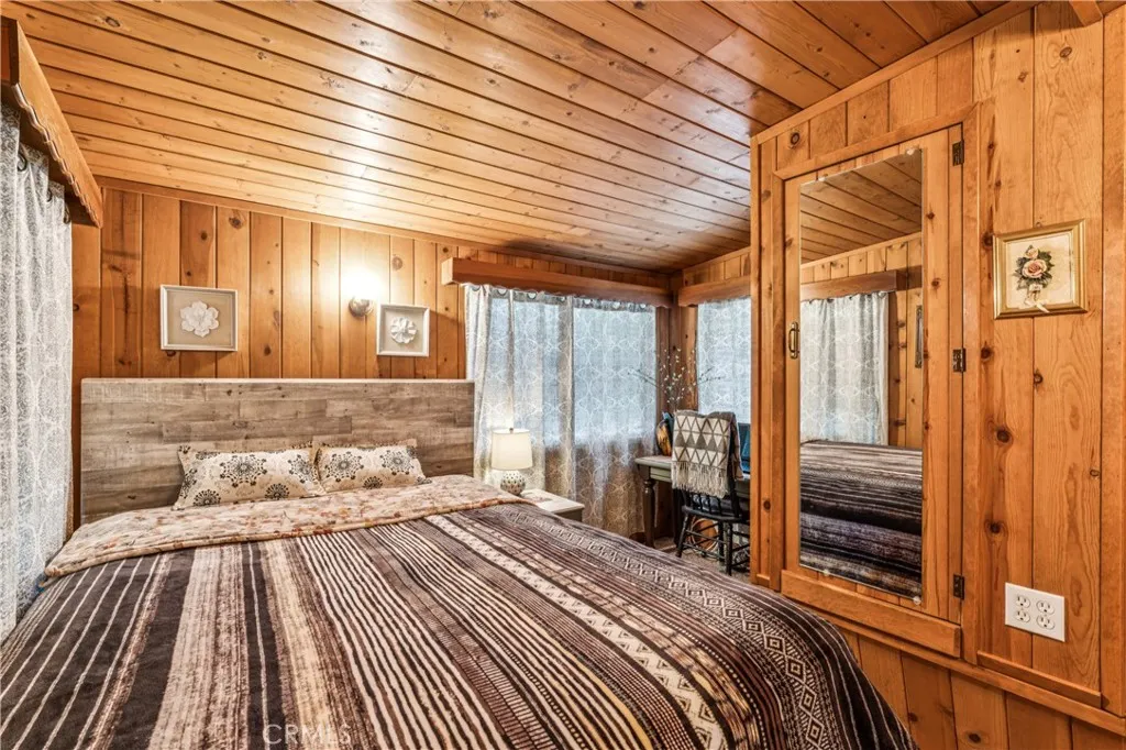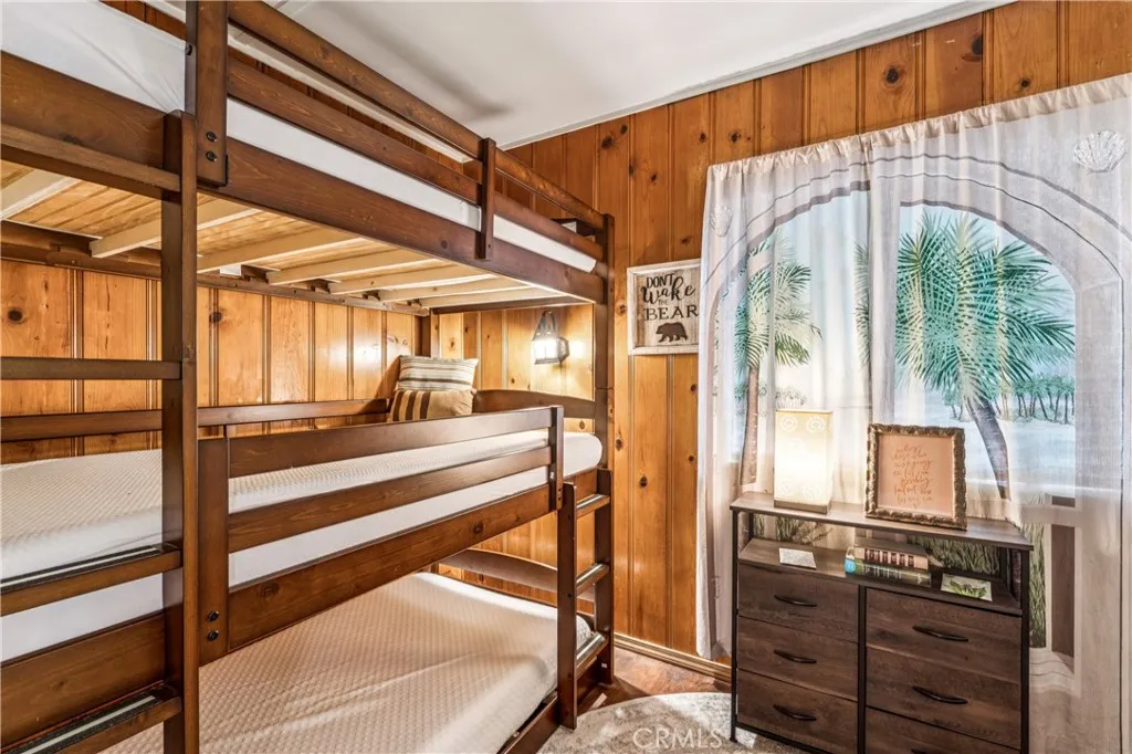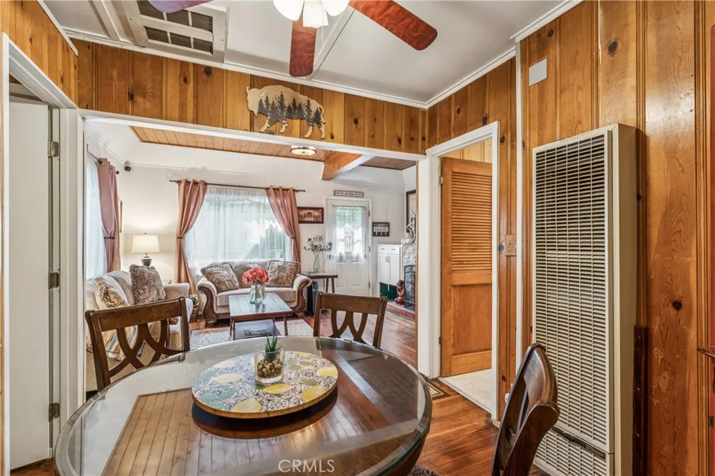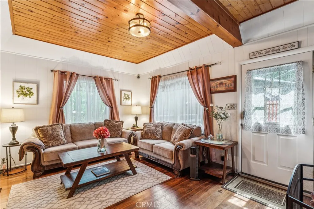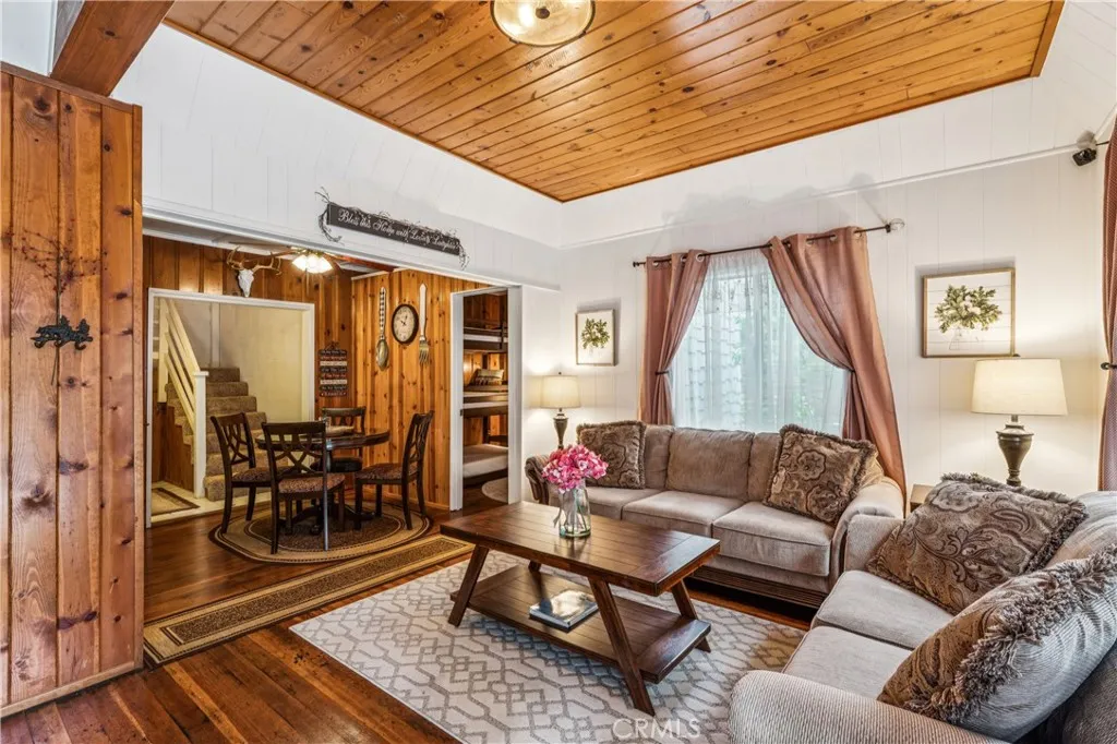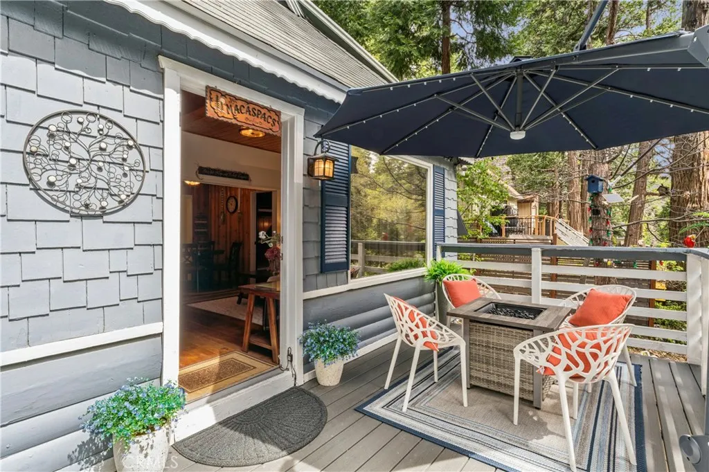 1923 Blue Jay vintage cabin backing to protected forest. Full of original charm and thoughtfully updated over the years, this 3-bedroom mountain retreat sits on a quarter-acre lot in a prime location less than a quarter mile from Blue Jay shops and restaurants and about half a mile to the lake. Features include an updated kitchen with Bosch dishwasher, updated full bath with original tub, updated plumbing and electrical, refurbished stone fireplace, and original refinished hardwood floors. The expanded downstairs bedroom accommodates a triple bunk bed plus a single bed, with two additional bedrooms upstairs. Recent improvements include interior and exterior paint, newer blinds, updated light fixtures selected to match the cabin’s vintage character, added corner cabinets, newer Trex front patio, umbrella solar lights, and firepit. Detached original deep single-car garage with stone walls provides great storage. A newer guest house on the side plateau offers space for up to 3 guests or flexible use as a storage structure. Set among mature cedar and pine trees, with access to nearby hiking trails and street-side parking for 3–4 cars, this furnished mountain getaway captures the charm of early Lake Arrowhead living.