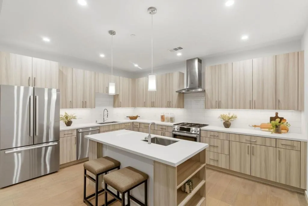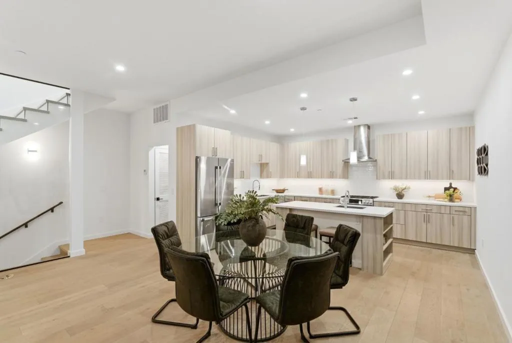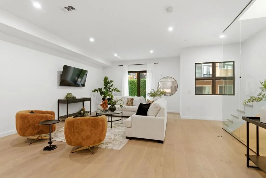 Sophisticated modern living defines 908 Woodside Rd, a beautifully designed 3-bedroom, 3-bath residence offering approximately 1,700 sq. ft. of refined interior space. Thoughtfully crafted with soaring 910 ft ceilings, wide-plank European white oak hardwood floors, sleek glass interior railings, and Level 5 interior wall finishes, this home delivers a polished, contemporary aesthetic throughout. Oversized high-performance triple-pane windows, paired with enhanced insulation between walls and floors, create a serene and light-filled living environment. The gourmet kitchen showcases top-of-the-line Bosch appliances with gas oven/range, quartz countertops with a full-height premium backsplash, custom soft-close cabinetry with dovetail drawers, and elegant under cabinet lighting. Spa-inspired bathrooms feature frameless glass showers, Hansgrohe fixtures, and quartz surfaces. Designed for seamless indoor-outdoor living, the home offers a 96 sq. ft. balcony off the main living area and an additional 170 sq. ft. private balcony off the primary suite. A secured entry gate, fenced perimeter, and attached 2-car garage pre-wired for EV charging complete this exceptional offering.