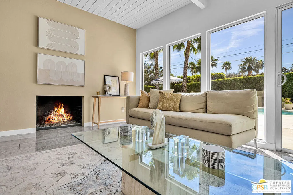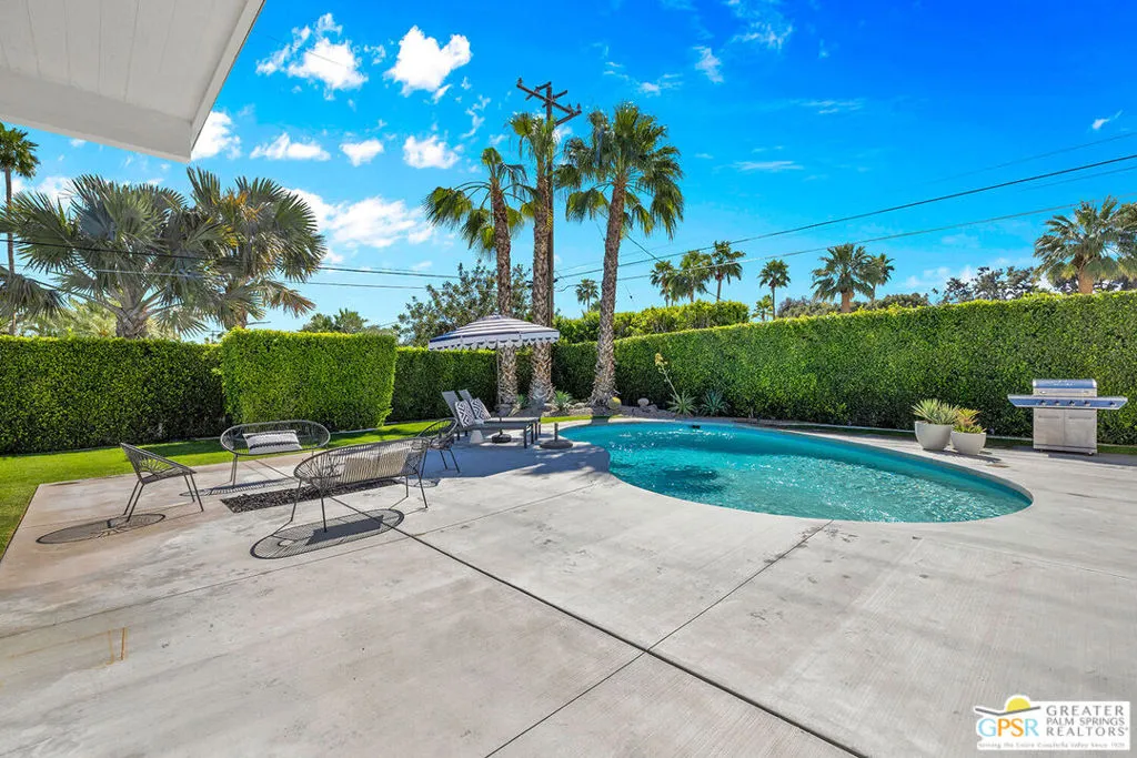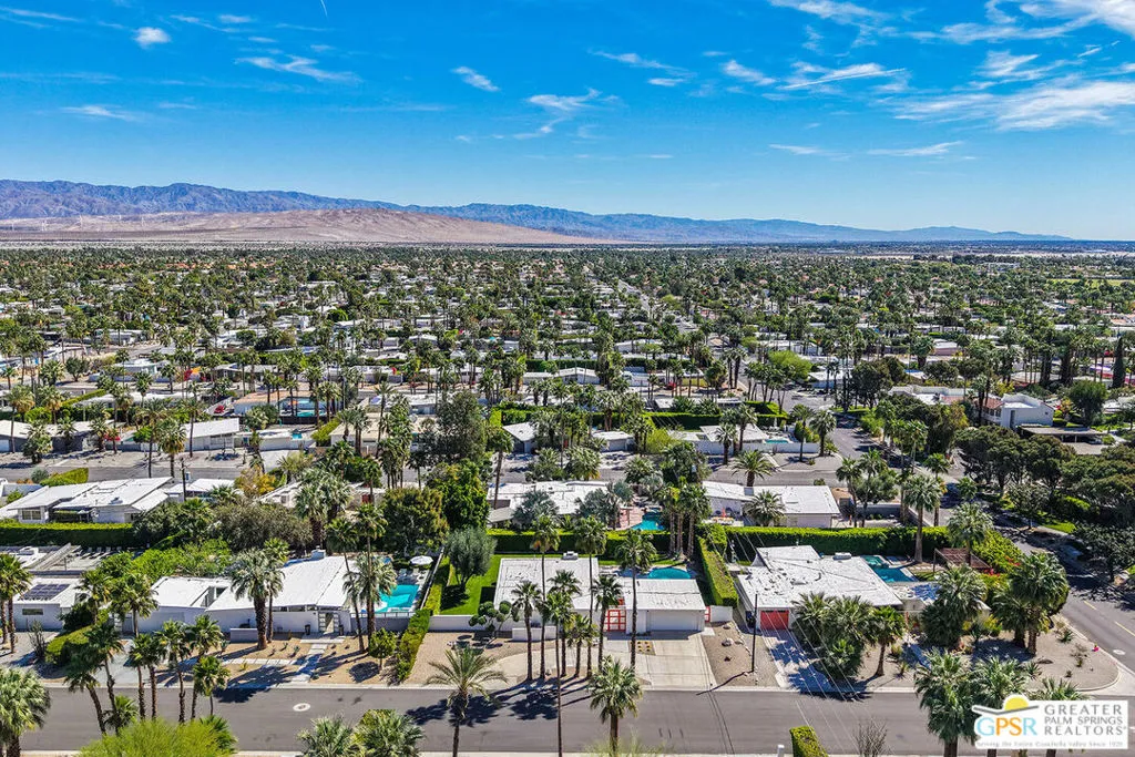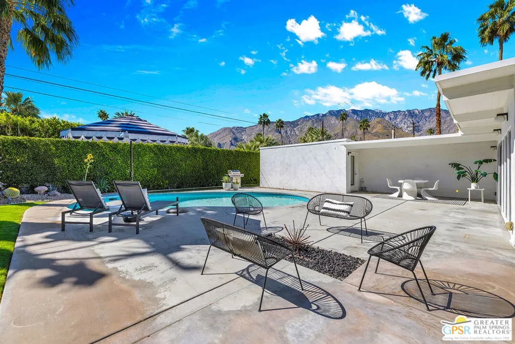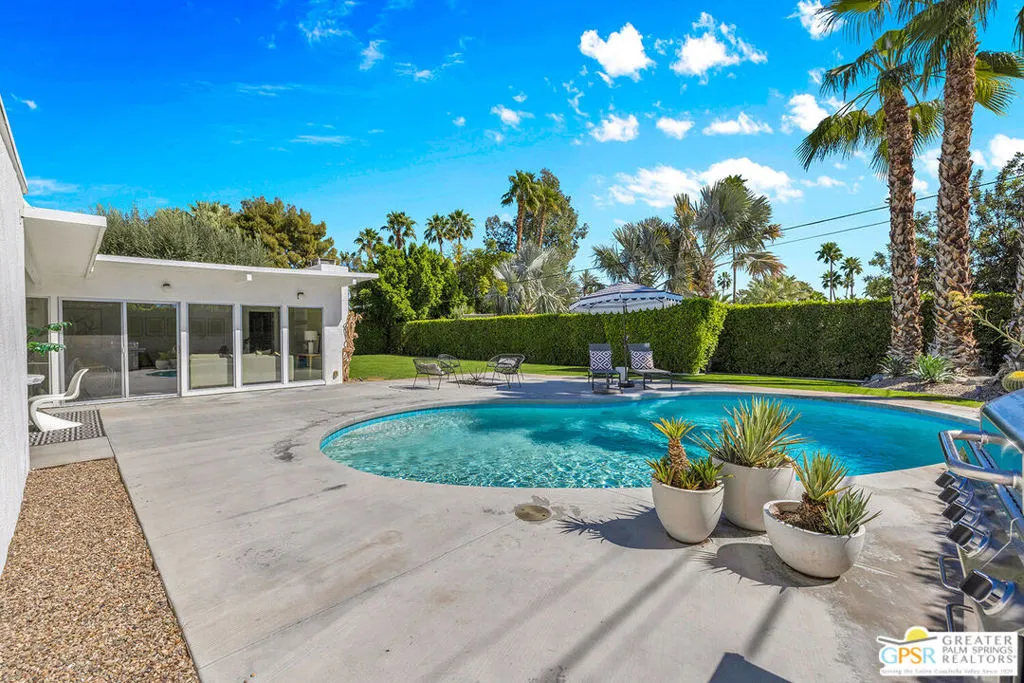 Discover this beautifully preserved mid-century modern home on a quiet cul-de-sac in the southern part of Racquet Club Estates. Designed and built in 1959 by noted Palm Springs developer Jack Meiselman, this stylish residence captures the essence of classic desert living. The thoughtful floor plan offers great bedroom separation, with a flexible third bedroom that works well as a den, office, or guest space. The inviting living room centers around a charming fireplace and opens to a dramatic south-facing wall of glass that fills the home with natural light. The semi-galley kitchen is well appointed and ready for everyday living or entertaining. Outside, enjoy a sparkling kidney-shaped pool, a covered patio for al fresco dining, a fire pit for cool desert evenings, and an expansive rear and side yard with room to expand. Offered turnkey furnished, this is a wonderful opportunity to enjoy the Palm Springs lifestyle in an iconic architectural setting. Contact the listing agent to schedule a private showing.