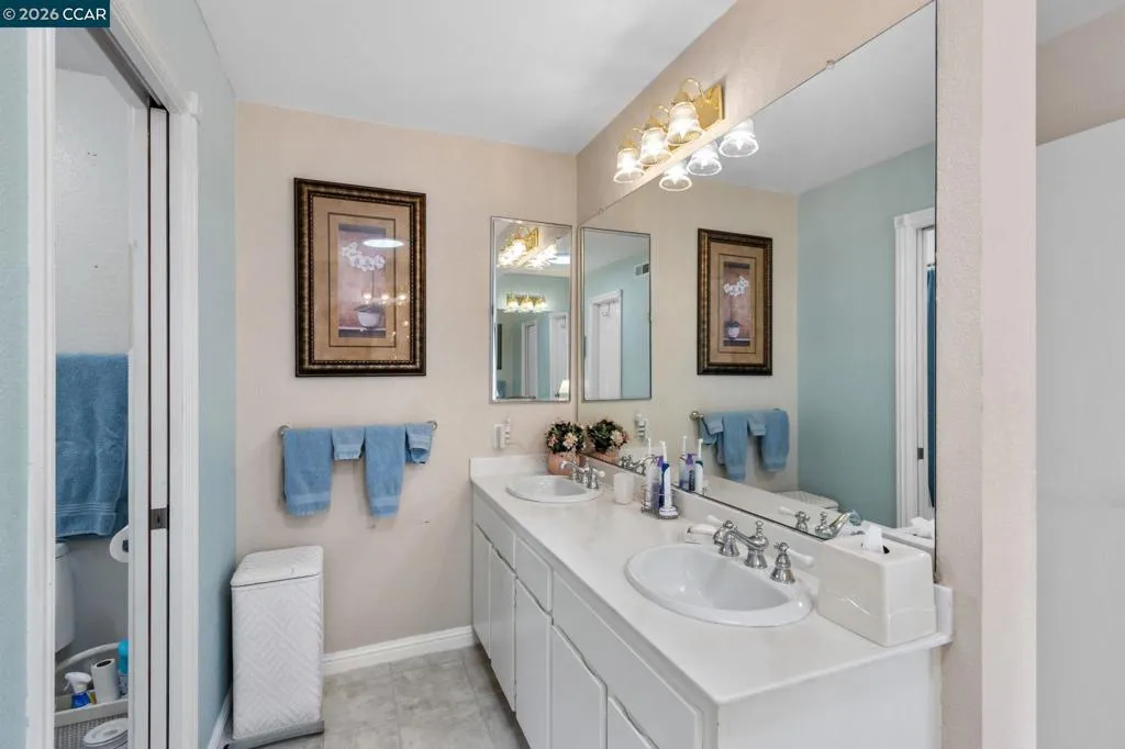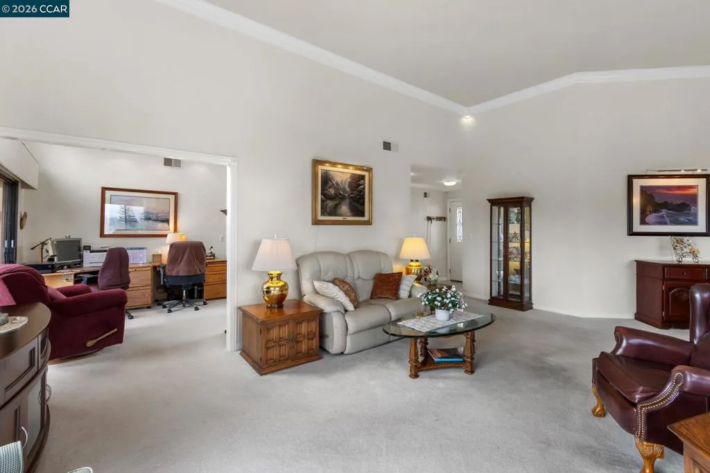 A rare opportunity in Rossmoor’s exclusive enclave, “The Heights.” This sought-after home offers exceptional privacy and panoramic views stretching across Rossmoor to the Benicia Hills, with most rooms capturing the scenery. Dramatic, soaring ceilings in the living room, dining area, and den enhance natural light and create an open, airy feel. The upgraded kitchen features custom baked-finish cabinetry with pull-outs, soft-close drawers, granite countertops, under-cabinet lighting, and recessed fixtures—blending style and functionality. A cozy wood-burning fireplace, crown molding, and architectural lighting anchor the main living space. Mutual-approved tile flooring in the entry, kitchen, and bathrooms adds durability and design appeal. Both bedrooms feature charming bay window extensions, bringing in additional light and character. Bathrooms are brightened by solar tube skylights, and a newer front door with sidelights creates an inviting entry. Enjoy indoor-outdoor living with two refinished and waterproofed view decks—perfect for morning coffee or sunset views. An oversized single garage with loft storage adds convenience. A truly special home defined by privacy, views, and location.