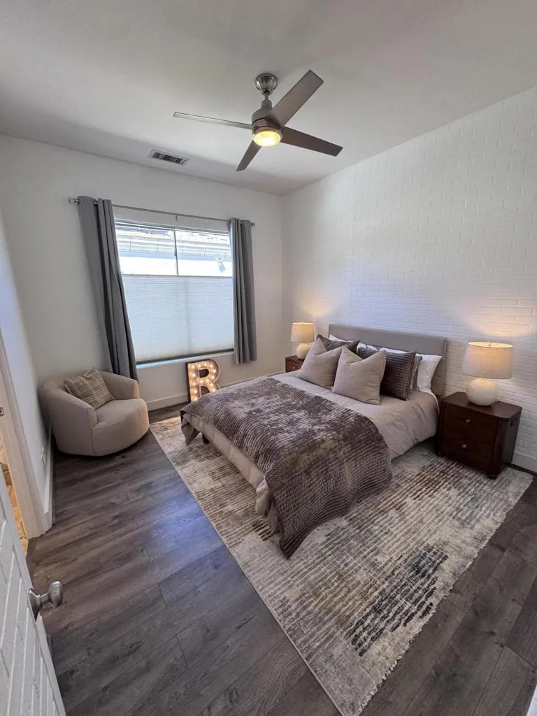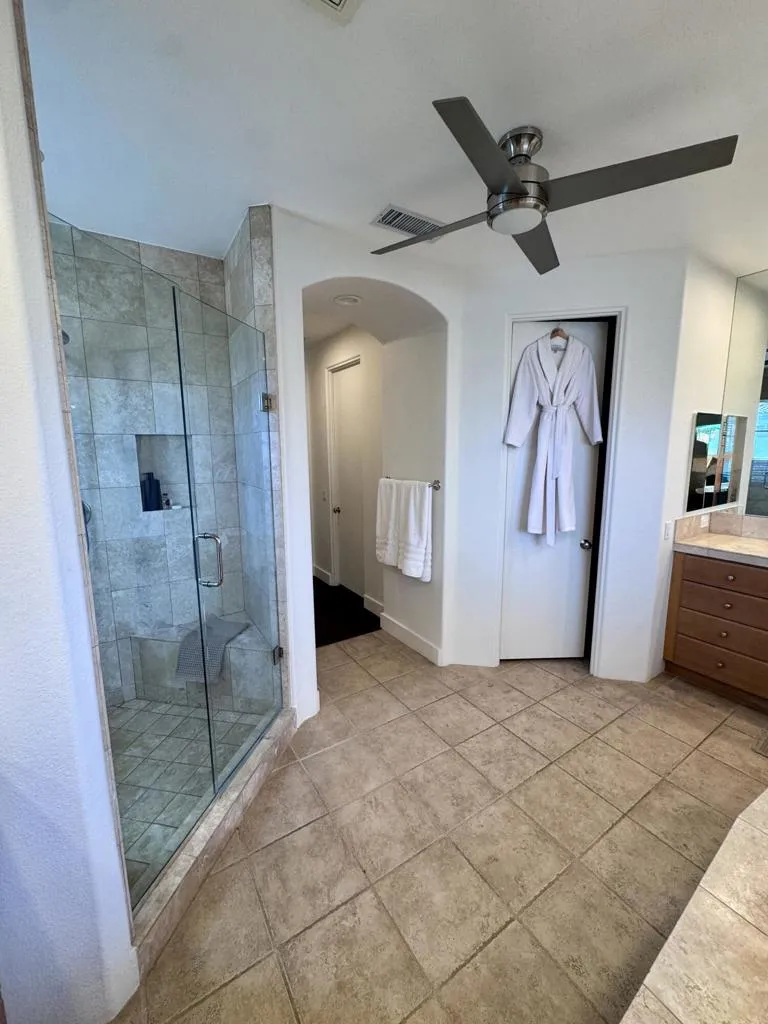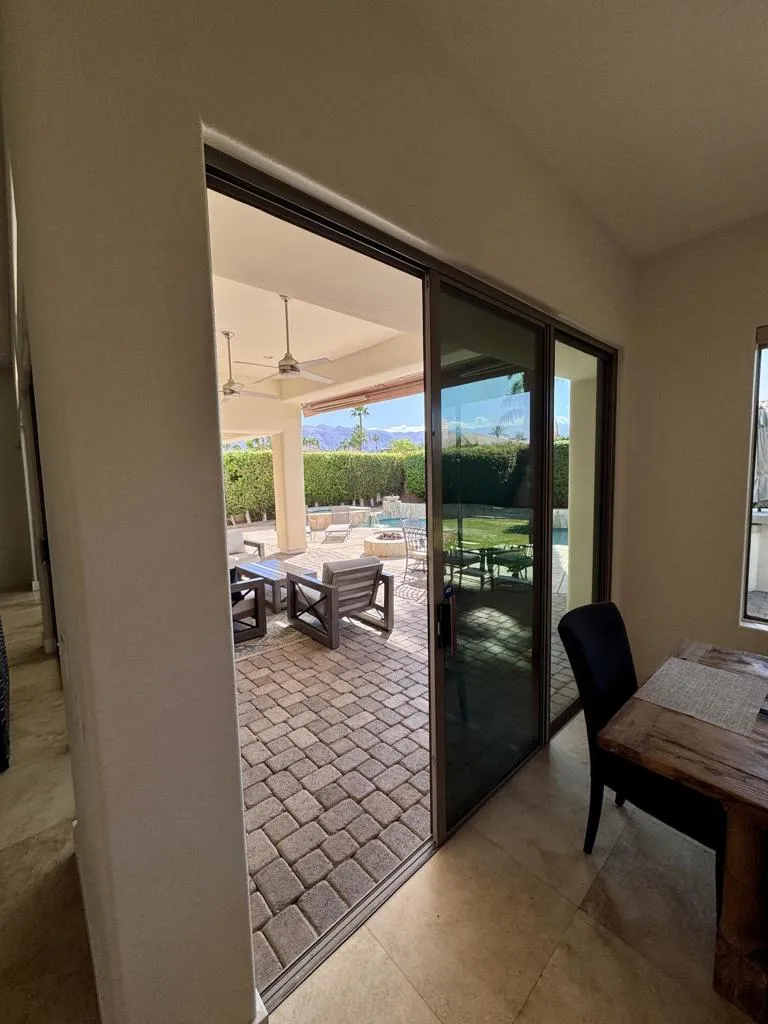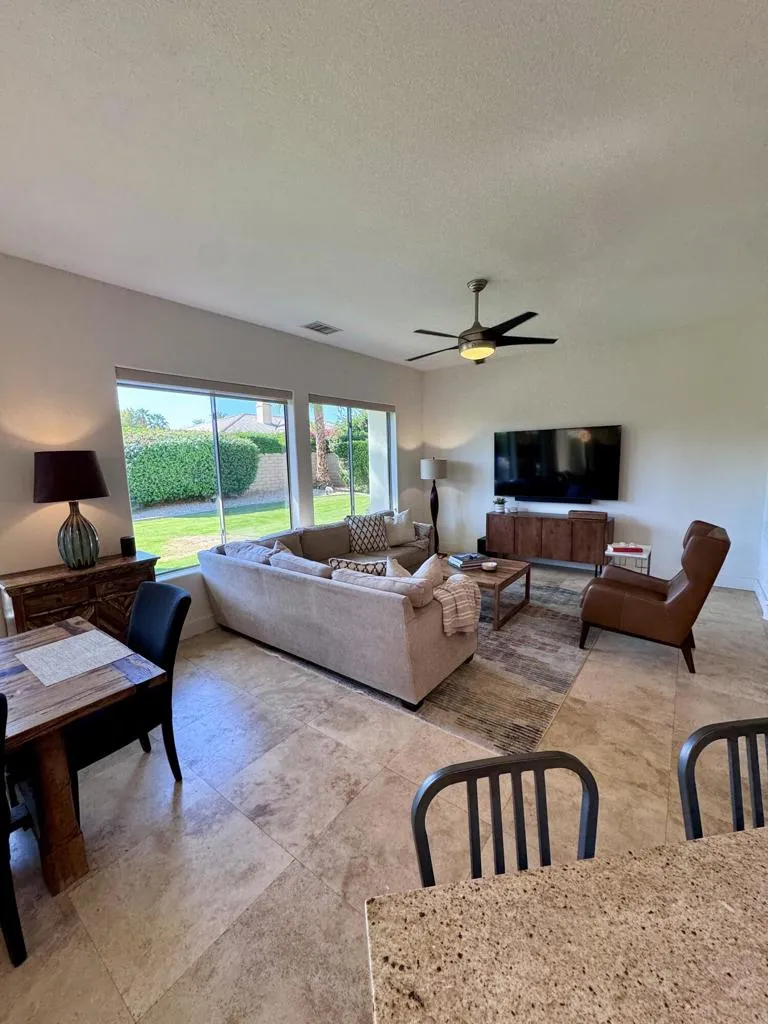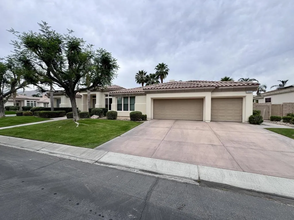 Large 4 bed/4.5 bath family-friendly house in a pretty and central gated neighborhood close to Eisenhower Hospital, shopping (Albertsons, Bristol Farms, Starbucks, Sherman's Deli all just a minute or two away), the soccer park and really convenient for Desert Sands Unified schools. Light and bright with lovely western views, this home offers a large open plan kitchen/living/dining room with fireplace and island, additional living space with fireplace and huge windows and doors to the patio, an oversized primary suite with double closets and large sitting area, 3 additional en suite bedrooms, office/gym space, a good sized laundry room and a powder room. In the back yard there is a generously-sized grassy area, as well as a pool and spa, a gas fire pit and a spacious and deep covered patio. The bbq island is a nice feature with a built in gas grill and refrigerator. 3 car attached garage with a level 2 EV charger, and an owned solar system for subsidized power costs.