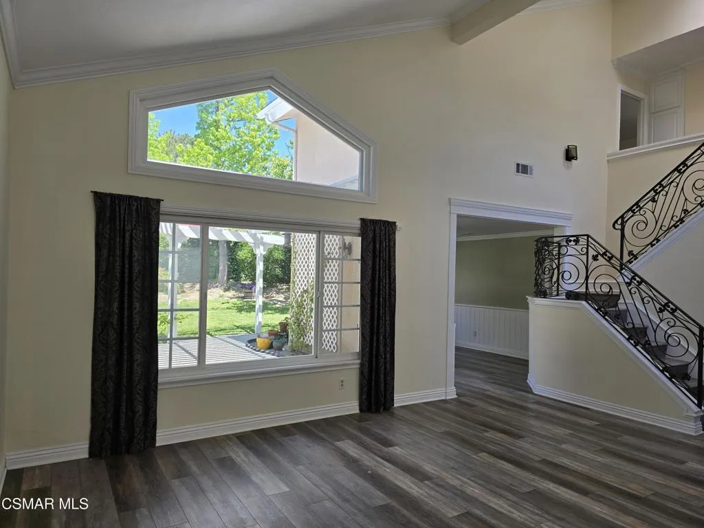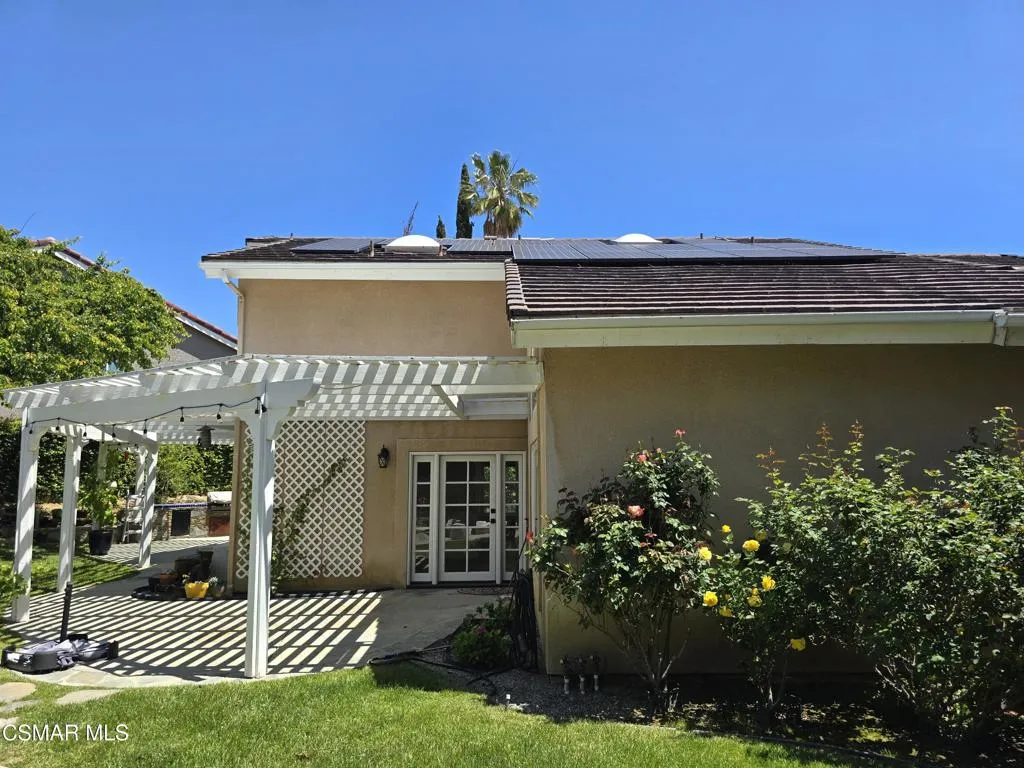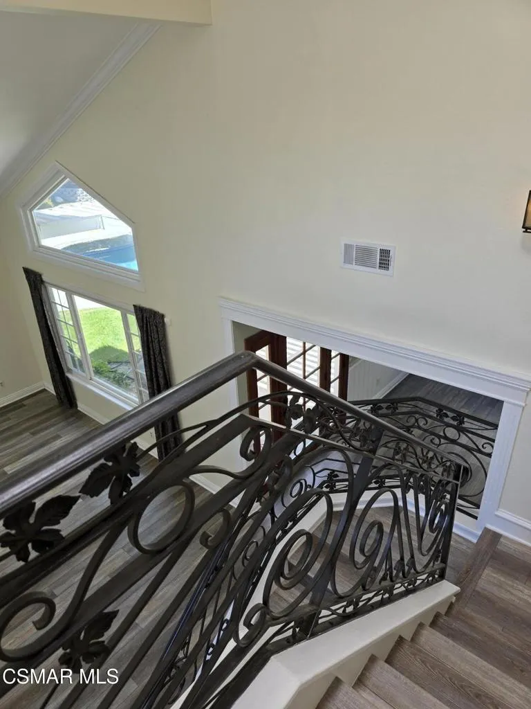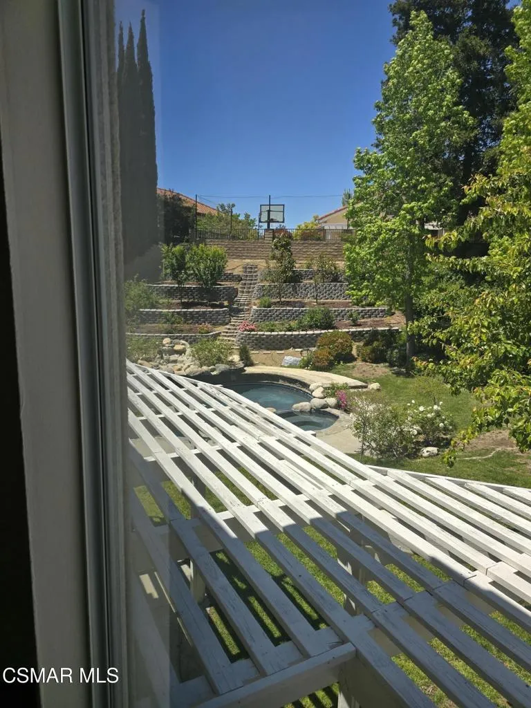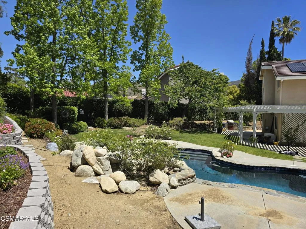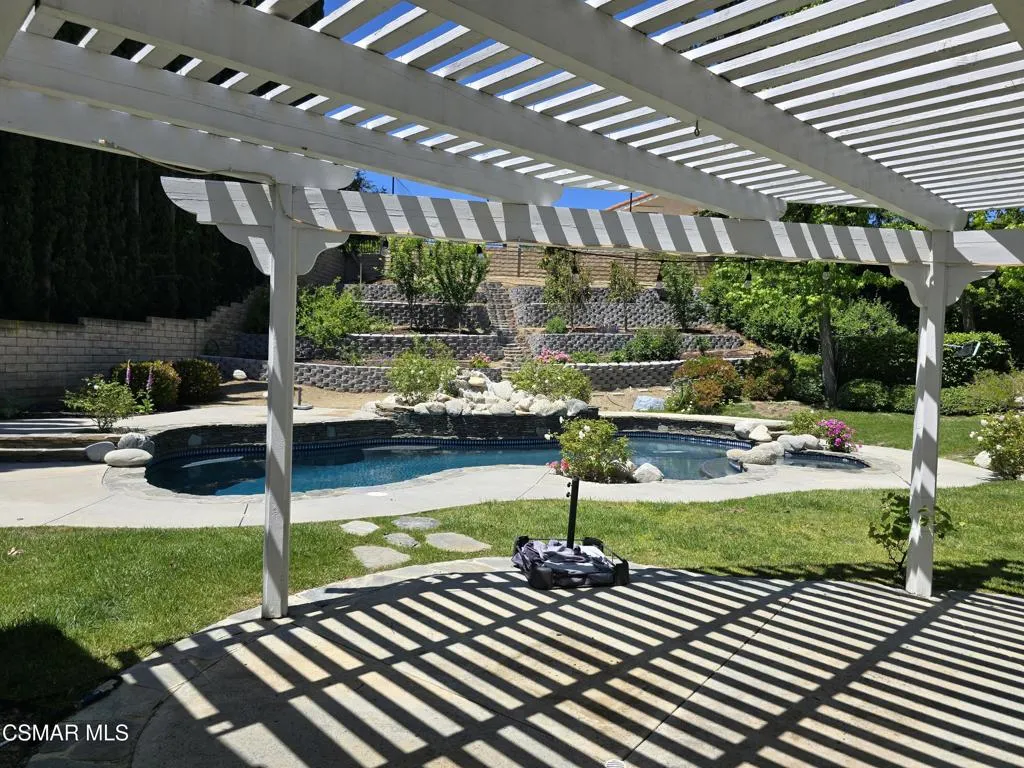 Must see this gorgeous 5 bedroom+3 bathroom pool home in a quiet cul-de-sac in the desirable Indian Hills neighborhood of Simi Valley. Featuring a light and bright, open floor plan which includes high ceilings, dual paned windows, crown molding & trim, recessed lighting, laminate hardwood-like flooring throughout and a whole house fan. The family room features a wet bar, a fireplace and a 75 inch flatscreen tv. The updated kitchen offers designer appliances, a center island, cabinets galore with pull outs & soft-closing drawers, and quartz countertops which adjoins the formal dining room. Outside you will be dazzled by the beautiful, lush, private, resort-style backyard with pool, spa and rock waterfall. Includes wrap-around covered patio, a built-in BBQ and mini fridge, stacked stone terrace, a rose garden, vegetable/herb planters and fruit bearing trees (plums, lemons, limes, avocados, apples, apricot). Side yard can house a small RV, boat or motorcycle. Inside you will find a decorative wrought iron banister which leads to 4 bedrooms upstairs which all have ceiling fans and 2 full bathrooms. The spacious ensuite master bedroom features 2 closets, a retractable skylight, double sink vanity, a separate soaking tub and water closet, and shower stall. Conveniently located near 118 Freeway, parks and recreation, hiking and biking trails, and much more! Easy commute to San Fernando Valley. Energy saving leased solar panels which will greatly reduce your electrical bill. The 3rd car spot in the garage was professionally converted to the 5th bedroom, which can also be well-suited as a home gym, office or studio. No HOA. Welcome to your new home!