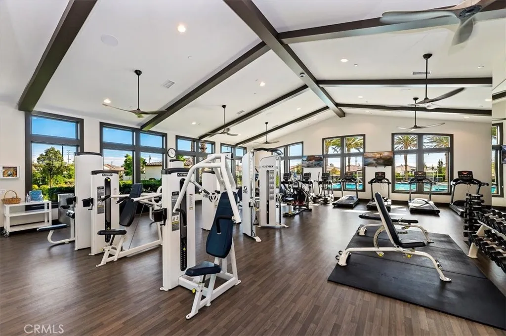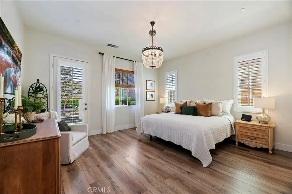 Welcome to the gated Esperanza 55+ Active Adult Community—one of the most desirable communities in Ontario Ranch. This exceptional single-story residence, the highly sought-after Modena model, is a true gem that presents beautifully and offers a seamless blend of style, comfort, and thoughtful design. Offering 2 bedrooms, 2 bathrooms, and a versatile flex room with the potential to serve as a third bedroom, home office, or den, this home provides both functionality and flexibility to fit your lifestyle. From the moment you step inside, the attention to detail is unmistakable. Elegant laminate flooring, upgraded baseboards and casing, plantation shutters, and refined designer finishes create a bright, modern aesthetic throughout. The kitchen is tastefully appointed with quartz countertops and a full marble backsplash, while decorative wall molding in the entryway and bath adds a distinctive custom touch. Every inch of this home has been carefully curated and impeccably maintained, creating a space that feels polished and complete. Step outside to a professionally landscaped front and backyard designed for both relaxation and enjoyment. A tranquil fountain enhances the setting, offering a peaceful backdrop for morning coffee or quiet evenings at home. The garage continues the home’s elevated feel, featuring epoxy flooring and suspended storage racks for a clean, organized environment. Residents enjoy exclusive access to the La Jolla Club, where resort-style amenities include a pool, bar area, outdoor kitchen, fire pits, fitness center, pickleball courts, and a dog park—perfect for an active and social lifestyle. Ideally located within walking distance to The Station at Eastvale and the Goodman Center, with convenient access to 99 Ranch Market, the 60 and 15 freeways, and just a short drive to Ontario Mills for shopping, dining, and entertainment. This is a rare opportunity to own a pristine, turn-key home in a premier 55+ community.