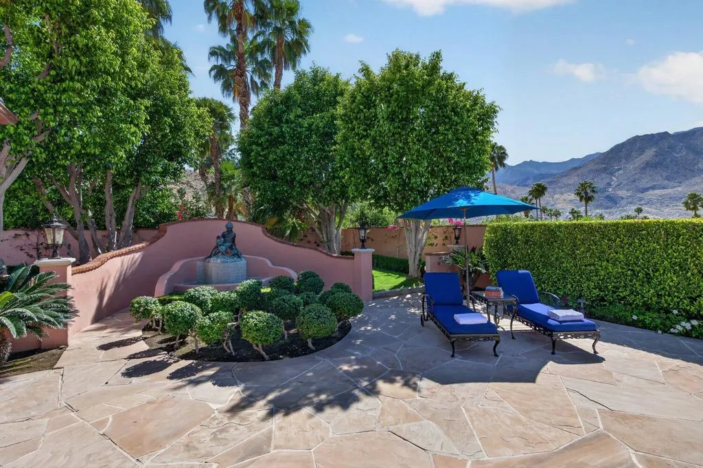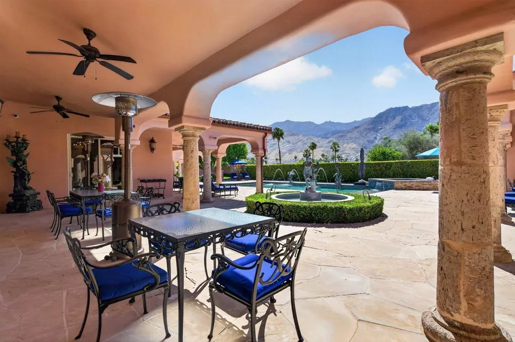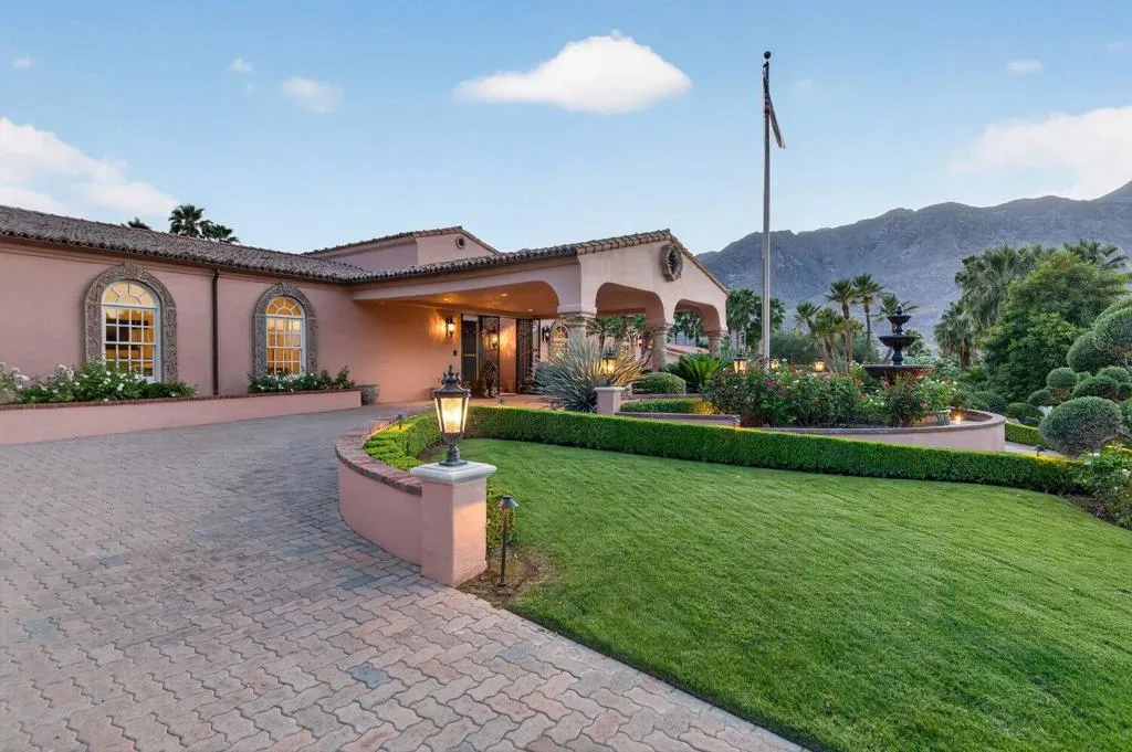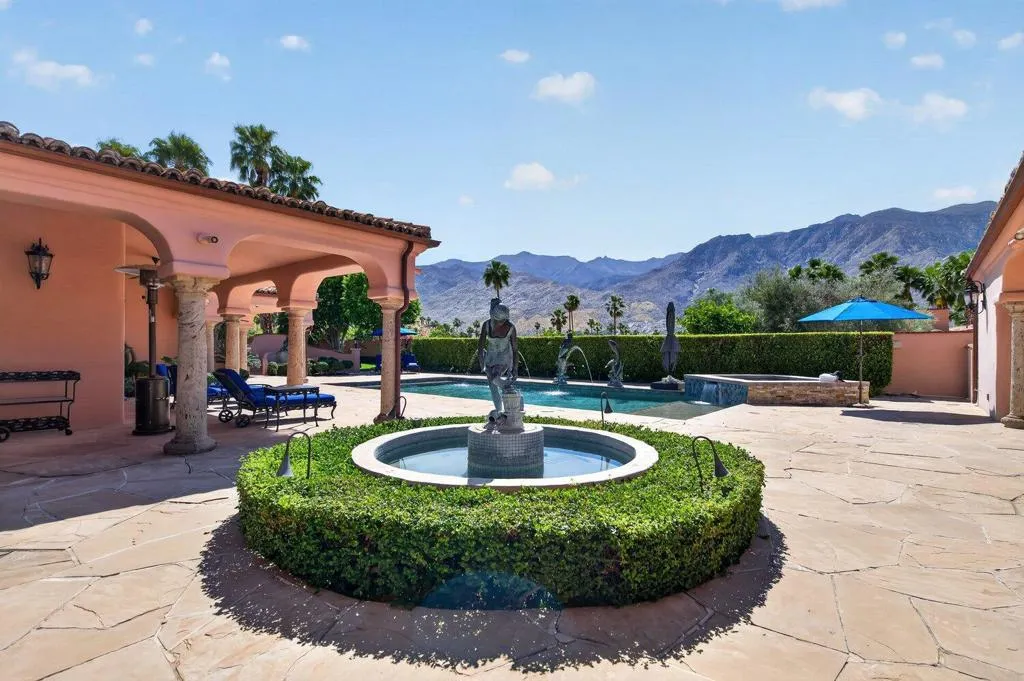 Affectionately named Villa Rosa, and located in the highly sought-after Palm Springs Andreas Hills neighborhood, this majestic estate is nestled on a quiet cul-de-sac. Originally built in 1988 at no spared expense, the property offers extraordinary seclusion and unobstructed panoramic views of the San Jacinto Mountains. This expansive and striking estate of nearly 6,000 sq. ft. sits on an impressive 0.66 acre of manicured grounds framed by irreplaceable 360-degree vistas. A Mediterranean style residence that was built to impress and boasts 4 well-appointed en-suite bedrooms, 5 baths, a private office, in addition to multiple formal and more casual living areas all designed to create an entertainer's dream whether hosting an intimate gathering or a grand gala. This residence offers the perfect blend of scale, comfort and refined living with a timeless traditional elegance. The finest craftsmanship of the estate is still evident today with the hand carved solid wood double door entry, beautiful marble tile floors, custom wrought iron work, Cantera stone columns, solid wood doors and windows, several fireplaces, stunning European chandeliers, not to mention the spectacular 3-stack layer tile roof. At the heart of home is an out of this world gourmet chef's kitchen, from solid bench-made mahogany and cherry woods cabinetry, oversized island, Thermador and Subzero stainless-steel appliances, a butler 's pantry and marble slab countertop. The spacious primary suite is a true sanctuary with wood vaulted ceilings, a spa-inspired bath with a marble built-in jetted-tub, plus an oversized shower, dual vanities and his and hers walk-in closet. Outdoors await a stunning large pool with a tanning ledge and spa, multiple dining and lounging areas, manicured grounds, a gated long driveway leading to an oversized garage with storage; all designed to showcase the upmost privacy and space. This rare offering needs to be experienced in person to fully appreciate the breathtaking panorama and exquisite craftsmanship of the estate.