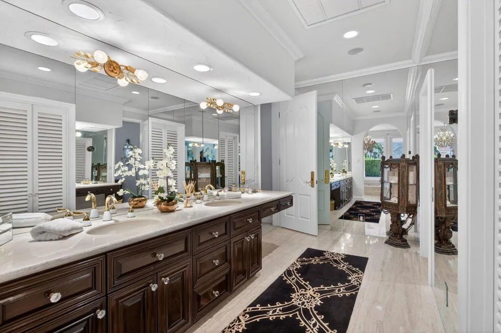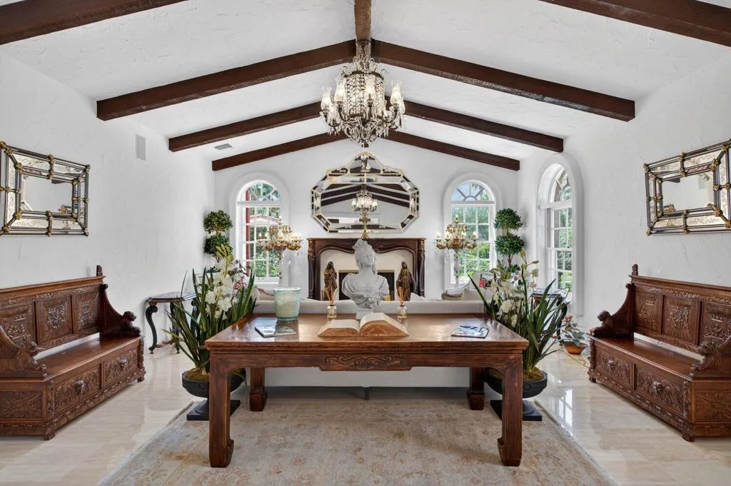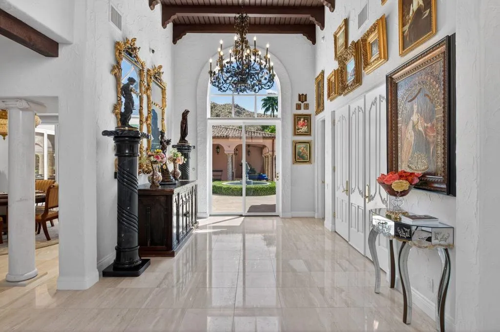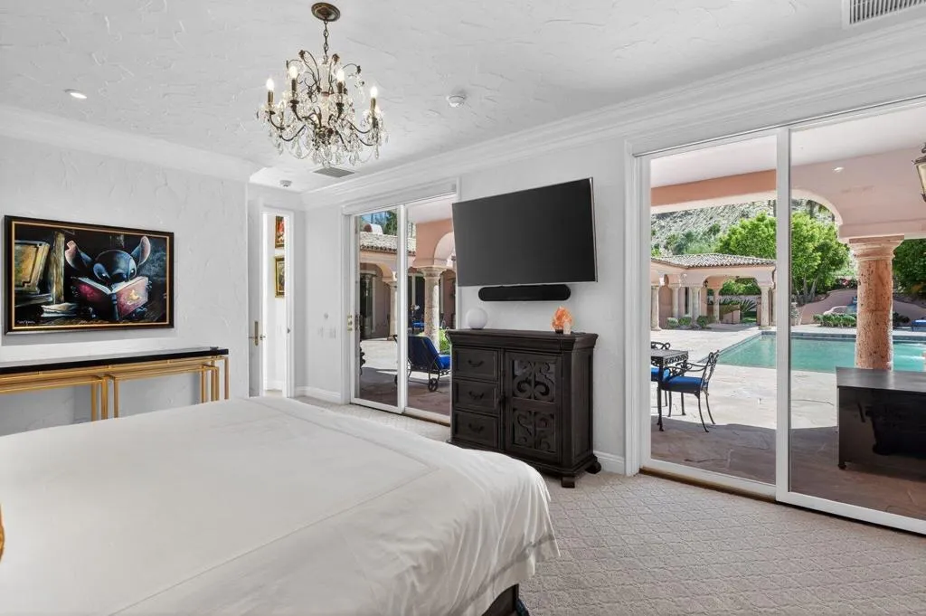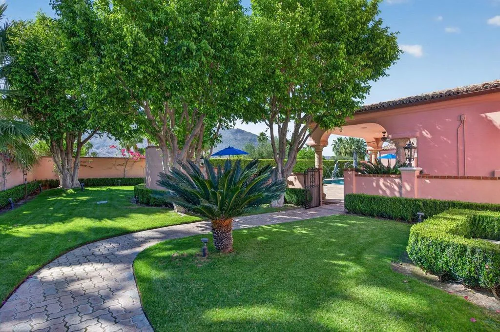 Affectionately named Villa Rosa, and located in the highly sought-after Palm Springs Andreas Hills neighborhood, this majestic estate is nestled on a quiet cul-de-sac. Originally built in 1988 at no spared expense, the property offers extraordinary seclusion and unobstructed panoramic views of the San Jacinto Mountains. This expansive and striking estate of nearly 6,000 sq. ft. sits on an impressive 0.66 acre of manicured grounds framed by irreplaceable 360-degree vistas. A Mediterranean style residence that was built to impress and boasts 4 well-appointed en-suite bedrooms, 5 baths, a private office, in addition to multiple formal and more casual living areas all designed to create an entertainer's dream whether hosting an intimate gathering or a grand gala. This residence offers the perfect blend of scale, comfort and refined living with a timeless traditional elegance. The finest craftsmanship of the estate is still evident today with the hand carved solid wood double door entry, beautiful marble tile floors, custom wrought iron work, Cantera stone columns, solid wood doors and windows, several fireplaces, stunning European chandeliers, not to mention the spectacular 3-stack layer tile roof. At the heart of home is an out of this world gourmet chef's kitchen, from solid bench-made mahogany and cherry woods cabinetry, oversized island, Thermador and Subzero stainless-steel appliances, a butler 's pantry and marble slab countertop. The spacious primary suite is a true sanctuary with wood vaulted ceilings, a spa-inspired bath with a marble built-in jetted-tub, plus an oversized shower, dual vanities and his and hers walk-in closet. Outdoors await a stunning large pool with a tanning ledge and spa, multiple dining and lounging areas, manicured grounds, a gated long driveway leading to an oversized garage with storage; all designed to showcase the upmost privacy and space. This rare offering needs to be experienced in person to fully appreciate the breathtaking panorama and exquisite craftsmanship of the estate.