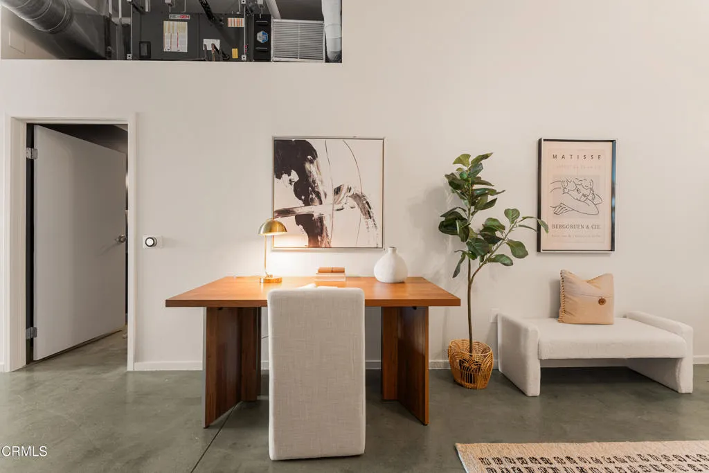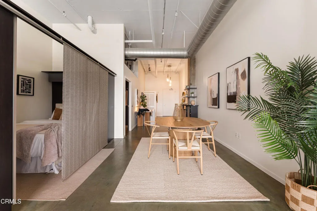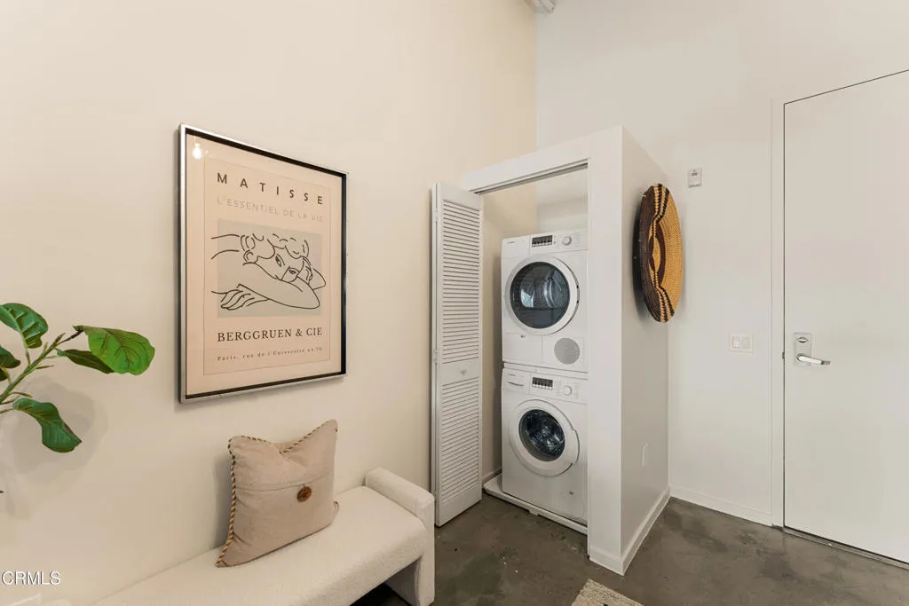 Mountain views and blue skies stream through dramatic floor-to-ceiling, double-pane windows, setting the tone for this exceptional top-floor live/work loft. Soaring ceilings amplify the home's authentic industrial character, where concrete floors and exposed piping contrast with freshly painted, gallery-like white walls. The residence features a newer A/C system (installed in 2025) and a sleek, modern kitchen appointed with black granite countertops and stainless-steel appliances. The spacious bathroom offers an oversized soaking tub and a generous closet with in-unit laundry. A ceiling-mounted bike pulley system adds everyday convenience and functionality. Residents enjoy a resort-style rooftop retreat complete with a pool, spa, fire pits, cabanas, BBQ areas, and a fully equipped fitness center--bringing a sense of elevated, luxury living to the urban landscape. The unit includes one designated parking space with an EV charger in a gated garage, along with 24/7 security for added peace of mind. Ideally situated in the heart of the vibrant Arts District, you are moments from celebrated dining, coffee, and cultural destinations, as well as parks, transit, and major freeways. Experience the energy and creativity of one of Downtown LA's most dynamic and rapidly evolving neighborhoods.