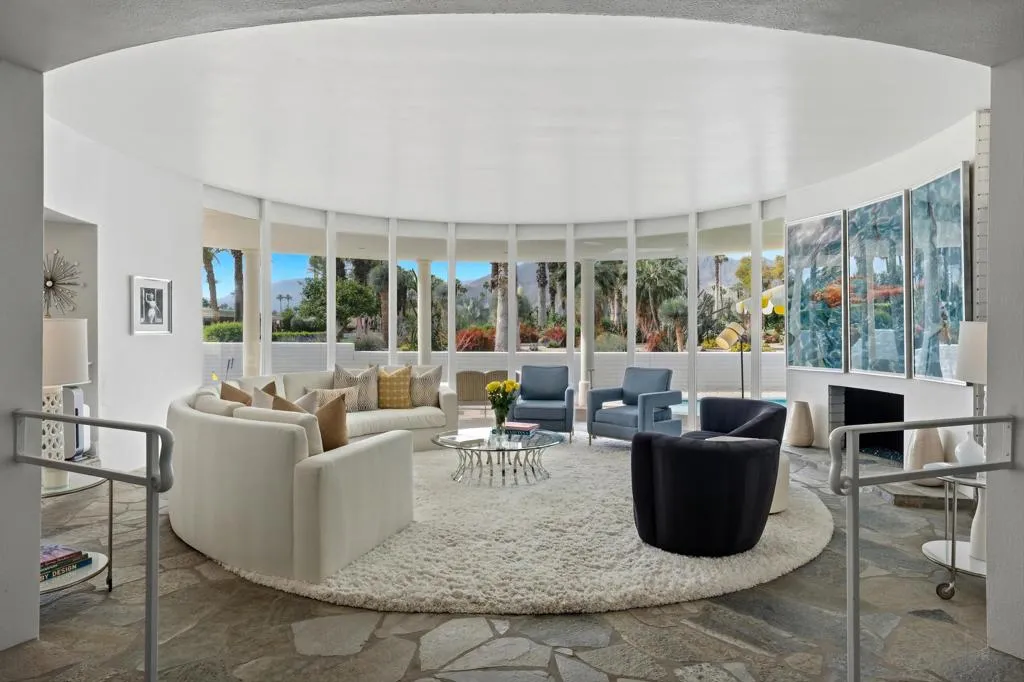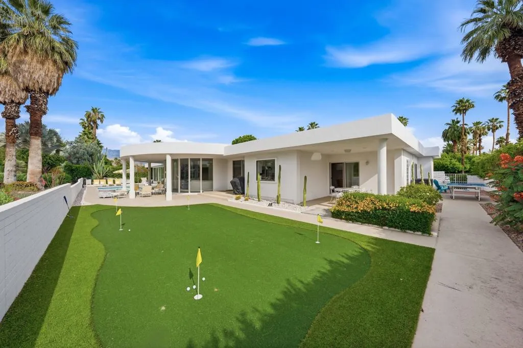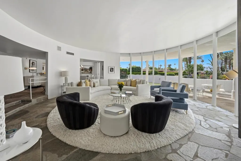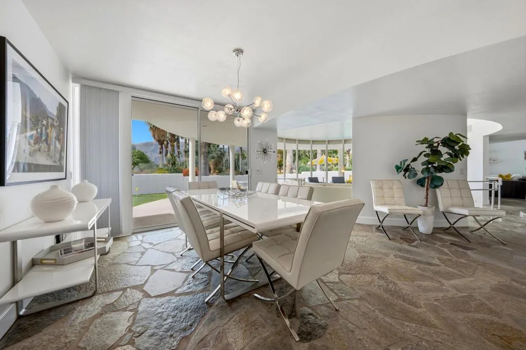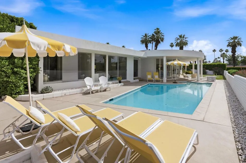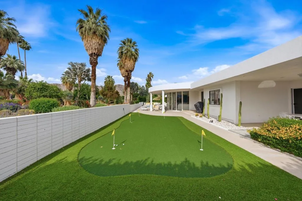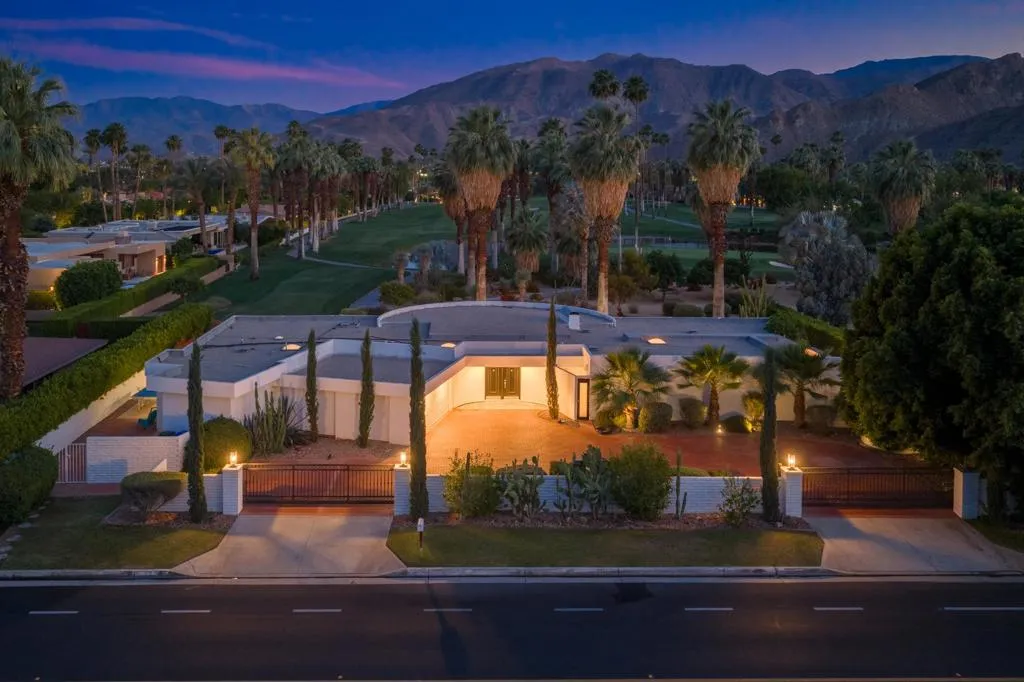 A rare opportunity to own a beautiful, recently restored, and impeccably maintained Mid-Century Modern residence in prestigious Rancho Mirage. Perfectly positioned overlooking the 13th tee of Thunderbird Country Club, this exceptional home captures sweeping, unobstructed views of both Santa Rosa and snow capped San Jacinto Mountains. Ideally located between vibrant Palm Springs and the upscale shopping and dining of Palm Desert, the setting offers both privacy and convenience.Originally built in 1962, the home showcases timeless architectural character, highlighted by a striking circular living room, an exceptionally rare design feature that creates an unforgettable first impression. This inviting space is both grand and intimate, featuring floor-to-ceiling windows that frame the dramatic desert landscape and bathe the interior in natural light.Designed to maximize its surroundings, every principal room enjoys stunning sun-filled mountain views, including the oversized master ensuite. Natural flagstone flooring flows throughout the main living spaces, while all three spacious bedrooms, all with ensuites, offer comfort and privacy. A thoughtfully separated third bedroom wing provides an ideal retreat for guests or a nanny suite.Balancing relaxed desert living with refined elegance, the home is perfectly suited for entertaining. The dining area features a distinctive backlit onyx bar-- an eye-catching focal point and ideal gathering space.Outdoor living is equally impressive, with a uniquely shaped pool true to the home's Mid-Century design, a private putting green, multiple lounge and dining areas, and a fire table for enjoying both sunrise coffee and evening cocktails. A ping pong area adds an extra element of fun and leisure.Behind solar powered iron gates a circular driveway and attached two-car garage complete this exceptional offering while enjoying 24 hour patrol from Thunderbird security. This turnkey home includes all furnishings with a few exceptions.