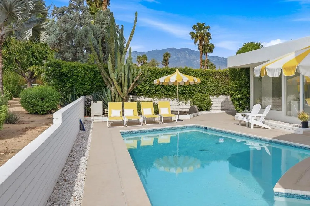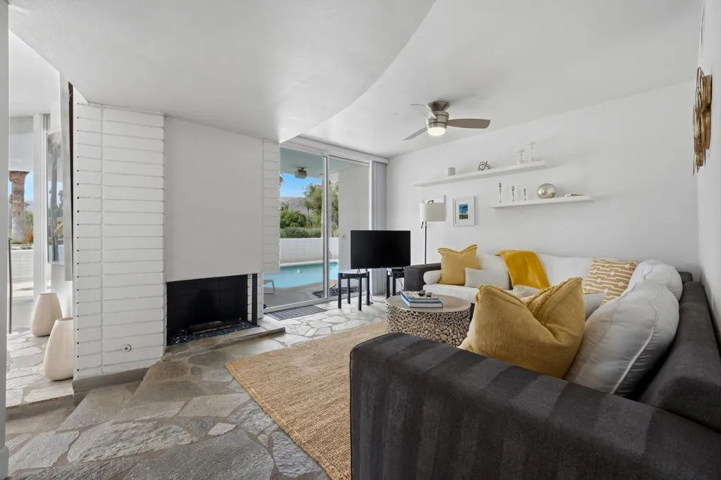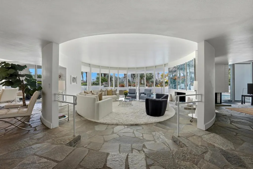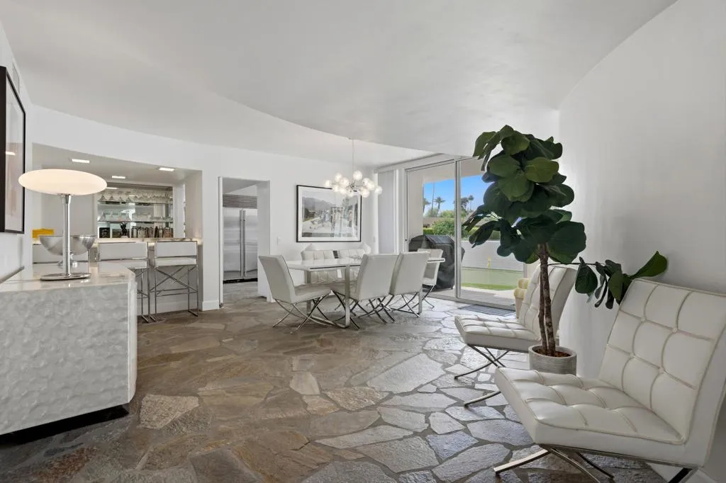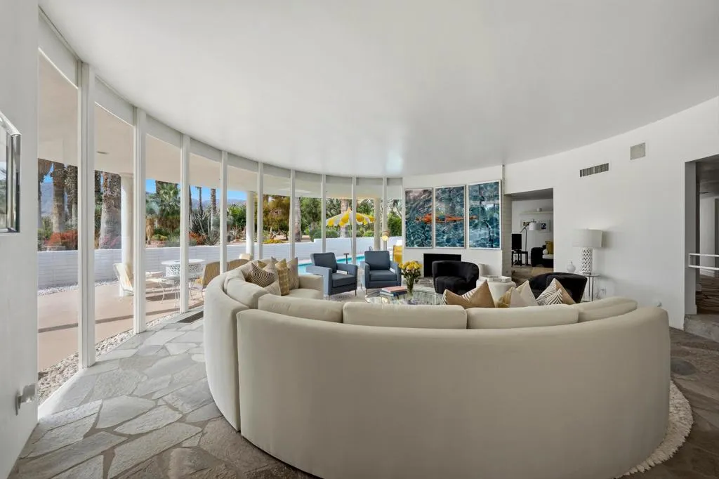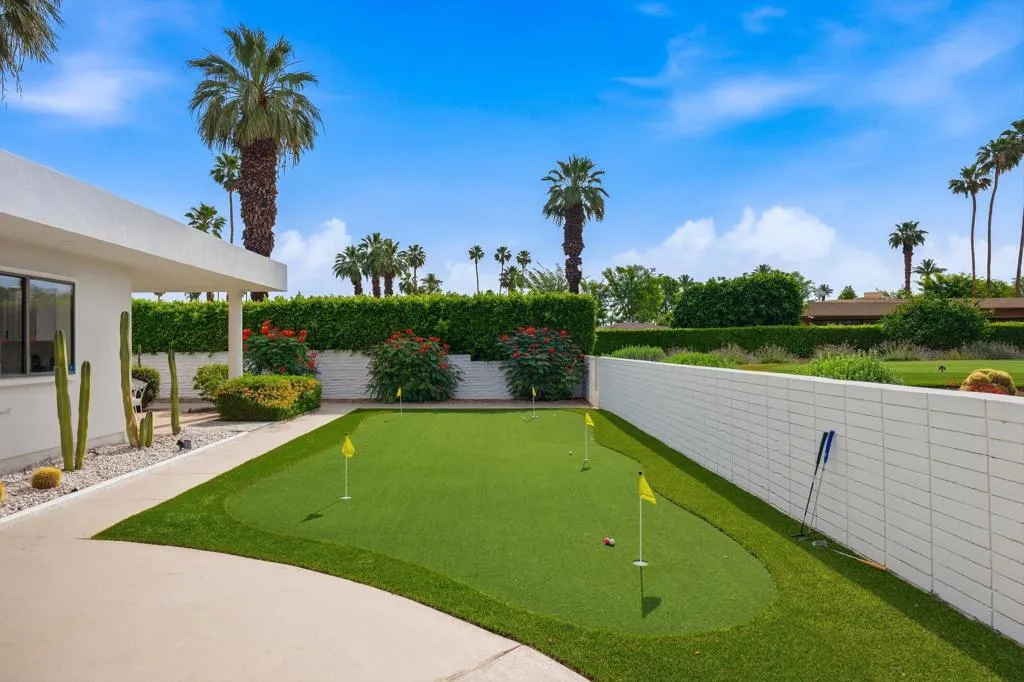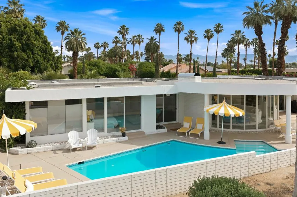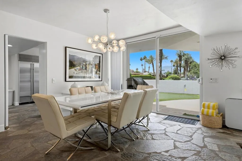 A rare opportunity to own a beautiful, recently restored, and impeccably maintained Mid-Century Modern residence in prestigious Rancho Mirage. Perfectly positioned overlooking the 13th tee of Thunderbird Country Club, this exceptional home captures sweeping, unobstructed views of both Santa Rosa and snow capped San Jacinto Mountains. Ideally located between vibrant Palm Springs and the upscale shopping and dining of Palm Desert, the setting offers both privacy and convenience.Originally built in 1962, the home showcases timeless architectural character, highlighted by a striking circular living room, an exceptionally rare design feature that creates an unforgettable first impression. This inviting space is both grand and intimate, featuring floor-to-ceiling windows that frame the dramatic desert landscape and bathe the interior in natural light.Designed to maximize its surroundings, every principal room enjoys stunning sun-filled mountain views, including the oversized master ensuite. Natural flagstone flooring flows throughout the main living spaces, while all three spacious bedrooms, all with ensuites, offer comfort and privacy. A thoughtfully separated third bedroom wing provides an ideal retreat for guests or a nanny suite.Balancing relaxed desert living with refined elegance, the home is perfectly suited for entertaining. The dining area features a distinctive backlit onyx bar-- an eye-catching focal point and ideal gathering space.Outdoor living is equally impressive, with a uniquely shaped pool true to the home's Mid-Century design, a private putting green, multiple lounge and dining areas, and a fire table for enjoying both sunrise coffee and evening cocktails. A ping pong area adds an extra element of fun and leisure.Behind solar powered iron gates a circular driveway and attached two-car garage complete this exceptional offering while enjoying 24 hour patrol from Thunderbird security. This turnkey home includes all furnishings with a few exceptions.