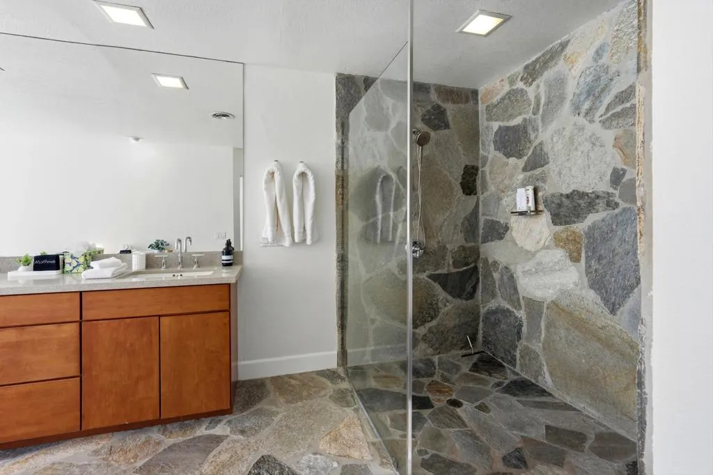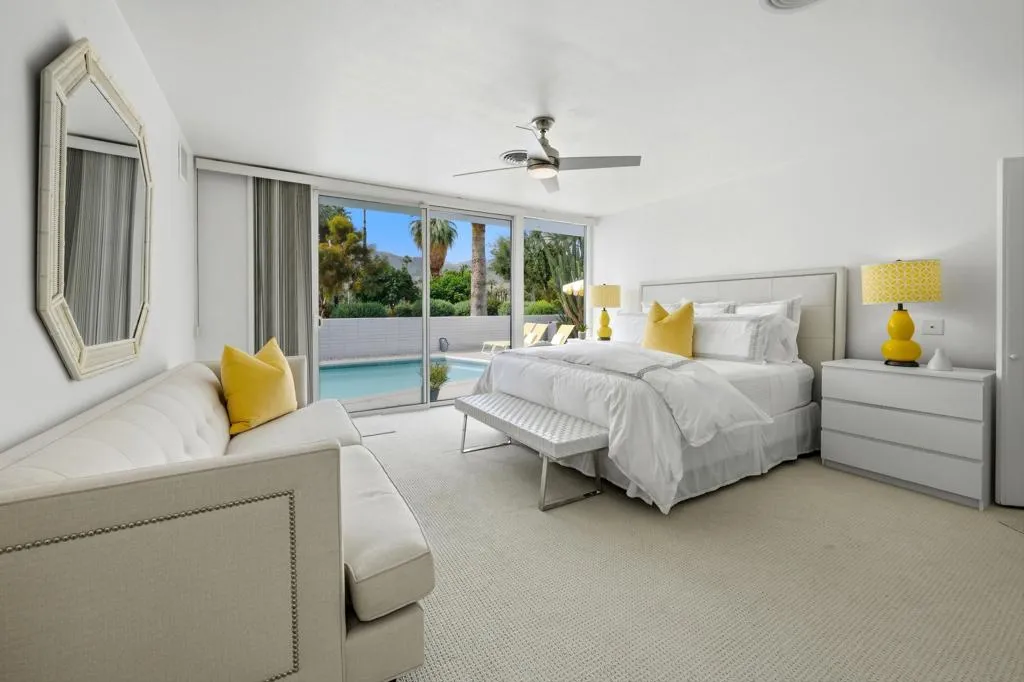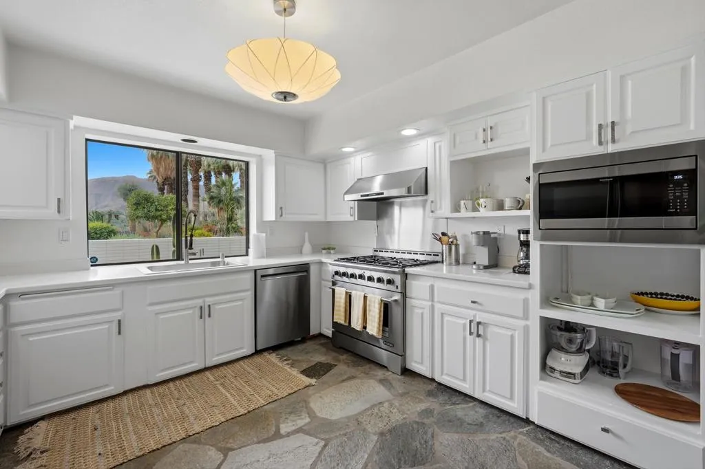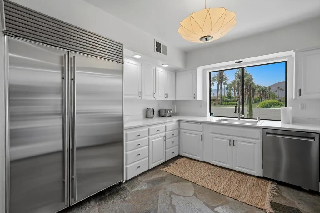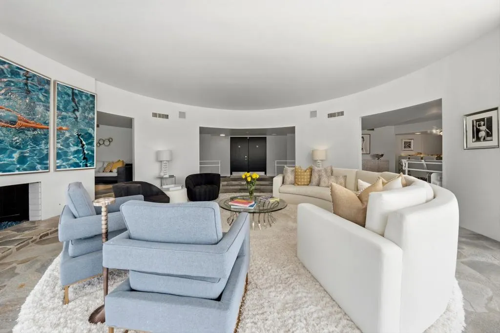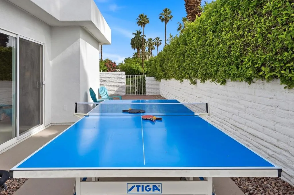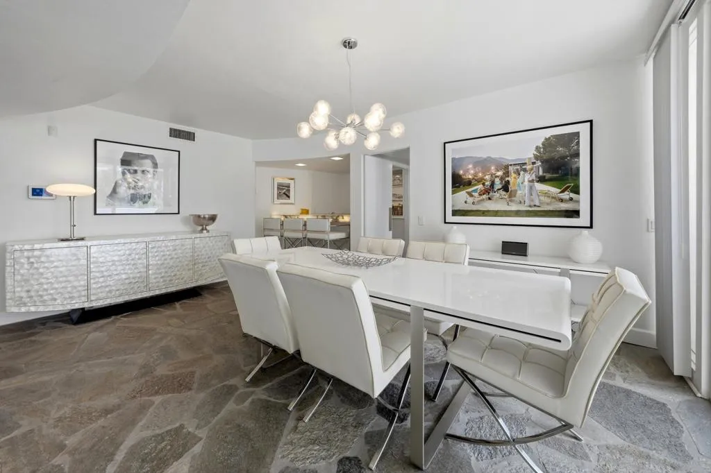 A rare opportunity to own a beautiful, recently restored, and impeccably maintained Mid-Century Modern residence in prestigious Rancho Mirage. Perfectly positioned overlooking the 13th tee of Thunderbird Country Club, this exceptional home captures sweeping, unobstructed views of both Santa Rosa and snow capped San Jacinto Mountains. Ideally located between vibrant Palm Springs and the upscale shopping and dining of Palm Desert, the setting offers both privacy and convenience.Originally built in 1962, the home showcases timeless architectural character, highlighted by a striking circular living room, an exceptionally rare design feature that creates an unforgettable first impression. This inviting space is both grand and intimate, featuring floor-to-ceiling windows that frame the dramatic desert landscape and bathe the interior in natural light.Designed to maximize its surroundings, every principal room enjoys stunning sun-filled mountain views, including the oversized master ensuite. Natural flagstone flooring flows throughout the main living spaces, while all three spacious bedrooms, all with ensuites, offer comfort and privacy. A thoughtfully separated third bedroom wing provides an ideal retreat for guests or a nanny suite.Balancing relaxed desert living with refined elegance, the home is perfectly suited for entertaining. The dining area features a distinctive backlit onyx bar-- an eye-catching focal point and ideal gathering space.Outdoor living is equally impressive, with a uniquely shaped pool true to the home's Mid-Century design, a private putting green, multiple lounge and dining areas, and a fire table for enjoying both sunrise coffee and evening cocktails. A ping pong area adds an extra element of fun and leisure.Behind solar powered iron gates a circular driveway and attached two-car garage complete this exceptional offering while enjoying 24 hour patrol from Thunderbird security. This turnkey home includes all furnishings with a few exceptions.