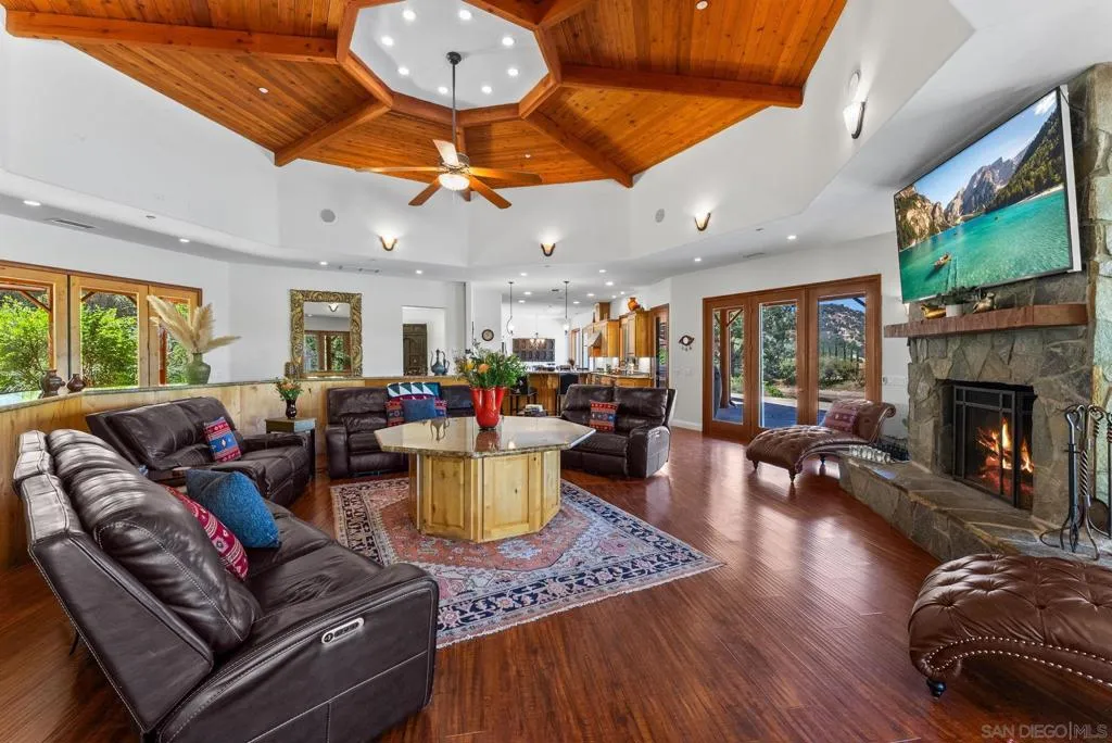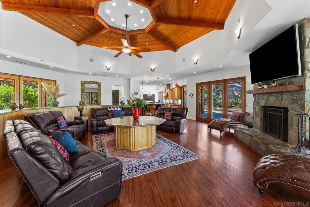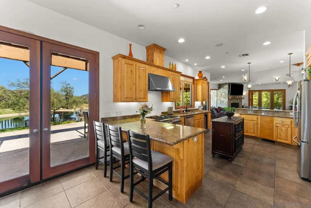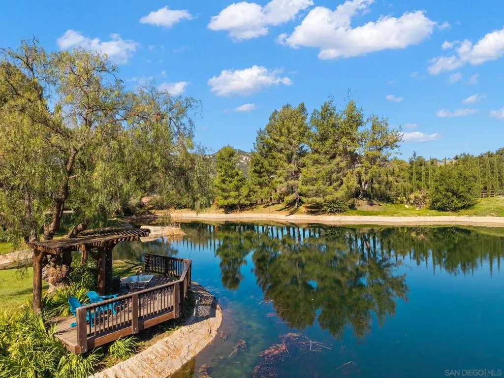 Welcome to Casa Lago, a rare private lakefront estate spanning 51+ acres across two legal parcels in one of Fallbrook’s most scenic settings. The main parcel encompasses approximately 19 acres and features a 5,891 sq. ft. single-level lodge-style residence with 6 bedrooms and 5.5 bathrooms, designed to capture sweeping mountain and lake views. The approximately two-acre stocked lake—expanded and fully lined with over $200,000 in improvements—serves as a striking centerpiece. Inside, the home offers a grand great room with soaring beamed ceilings and walls of glass, a chef-caliber kitchen, formal dining, and quality finishes throughout. The primary suite includes a fireplace and tranquil views, while en-suite guest rooms provide comfort and privacy. Wrap-around verandas and a resort-style pool and spa create seamless indoor-outdoor living. The grounds include a detached recreation building with a full-size racquetball court, pickleball court, shuffleboard, pool table, and game lounge. Additional features include leased solar, a flower-growing area, private go-kart track with hangar, and space suitable for equestrian use. The second parcel consists of approximately 32 acres with underground utilities and panoramic views, offering potential for a variety of uses, subject to buyer verification. Conveniently located approximately six miles to I-15, providing access to San Diego, Los Angeles and multiple regional airports. Casa Lago presents a rare opportunity to own a private lakefront estate in San Diego County.