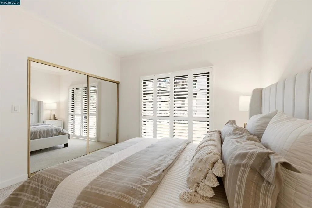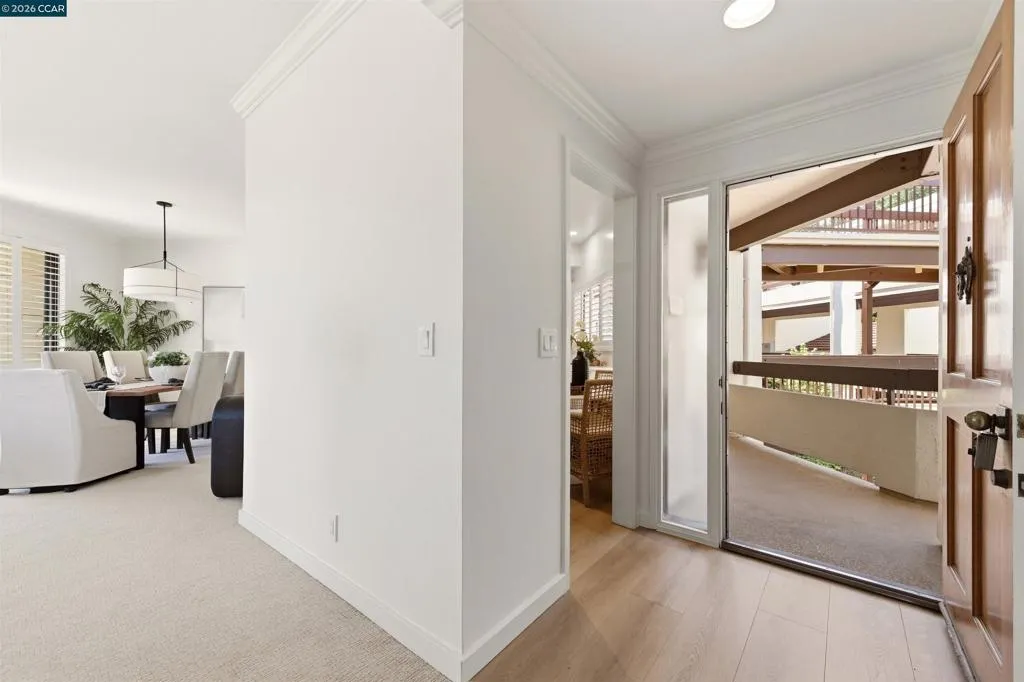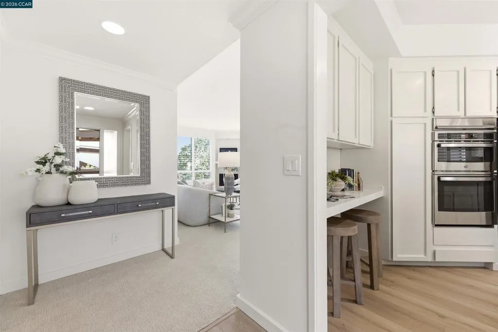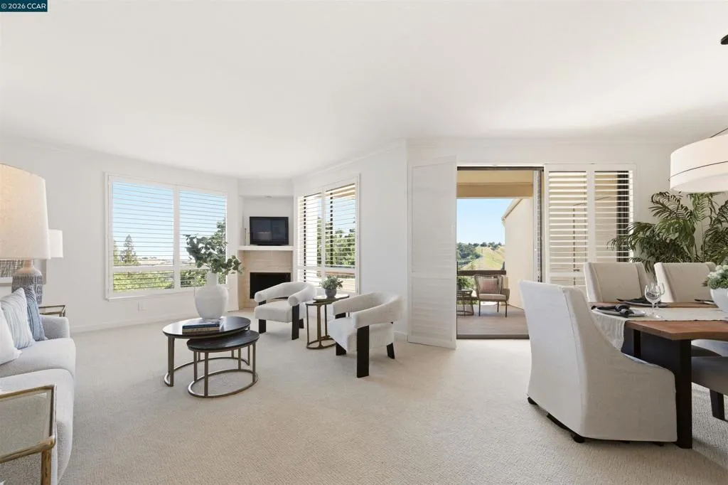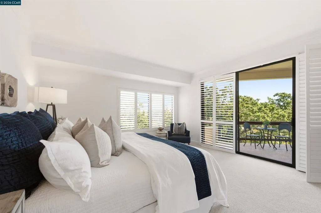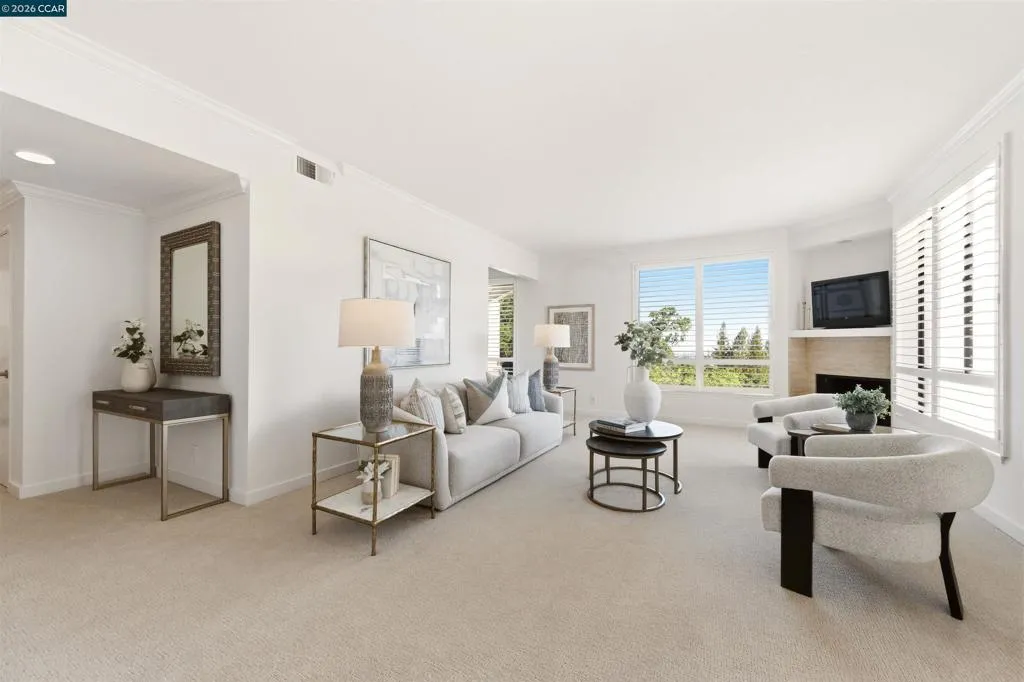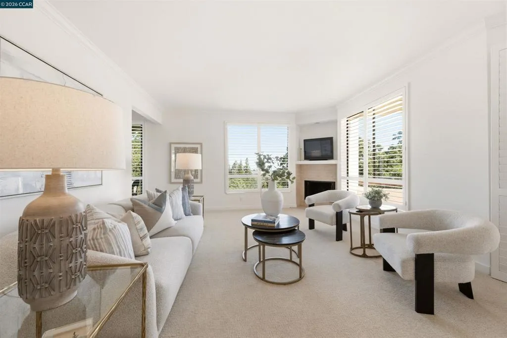 Easy level-in access welcomes you to this beautifully appointed home with sweeping panoramic views. A versatile interpretation of timeless tradition is expressed throughout, with dramatic high ceilings and disappearing walls of windows that fill the home with natural light. The beautifully updated kitchen features stainless steel appliances, new quartz countertops, abundant cabinetry, and the upscale finishes expected in a quality home. The spacious living room is anchored by a wood-burning fireplace, while two private decks offer wonderful spaces for outdoor enjoyment. A flexible den, enhanced by the stunning views, provides endless possibilities for work, relaxation, or guests. The expansive primary suite includes a charming sitting area and a large walk-in closet/dressing room. Spa-inspired baths have been tastefully updated, and the home’s refined interior is completed with high-end carpeting, white oak LVP flooring, custom blended paint, grand crown and base moldings, a rare garage, and additional carport parking. Distinctive details and thoughtful upgrades are found throughout this exceptional home.
