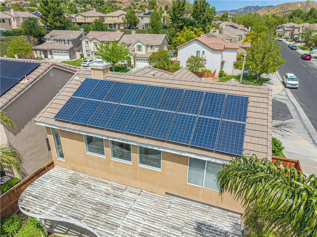 Welcome to this move-in-ready 3 bedroom, 2.5 bathroom corner home on a quiet cul-de-sac in the desirable Copper Hill North area of Saugus. Freshly painted, with brand new carpet throughout, the thoughtfully laid out floorplan begins with the oversized kitchen featuring solid hardwood cabinetry - the perfect place for preparing family meals or acting as a central hub for entertaining guests. Soaring ceilings and plenty of natural light are the signature of the living room which flows naturally into the dining area, both of which invite you to step through the patio doors into the backyard to enjoy the beautiful SoCal weather, day or night. A half bathroom downstairs easily accommodates your guests and provides day-to-day convenience for you. The three bedrooms upstairs are all spacious, and the primary suite offers the addition of a large en-suite bathroom and walk-in closet. The additional hall bathroom is plenty large for sharing, with plenty of counter space and storage courtesy of an oversized vanity. A built-in desk in the hall area makes a great home office or a great place for homework and studying, without taking up bedroom space. The solar system is OWNED, and provides plenty of power to keep your utility bills low. A tankless water heater issues instant and continous hot water for the entire home, and the laundry is all contained in its own area inside. Not to mention, you get access to a beautiful association pool right up the street. All of this with low HOA dues - What more could you ask for? Make this home yours today!
