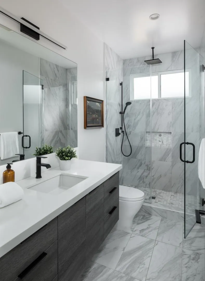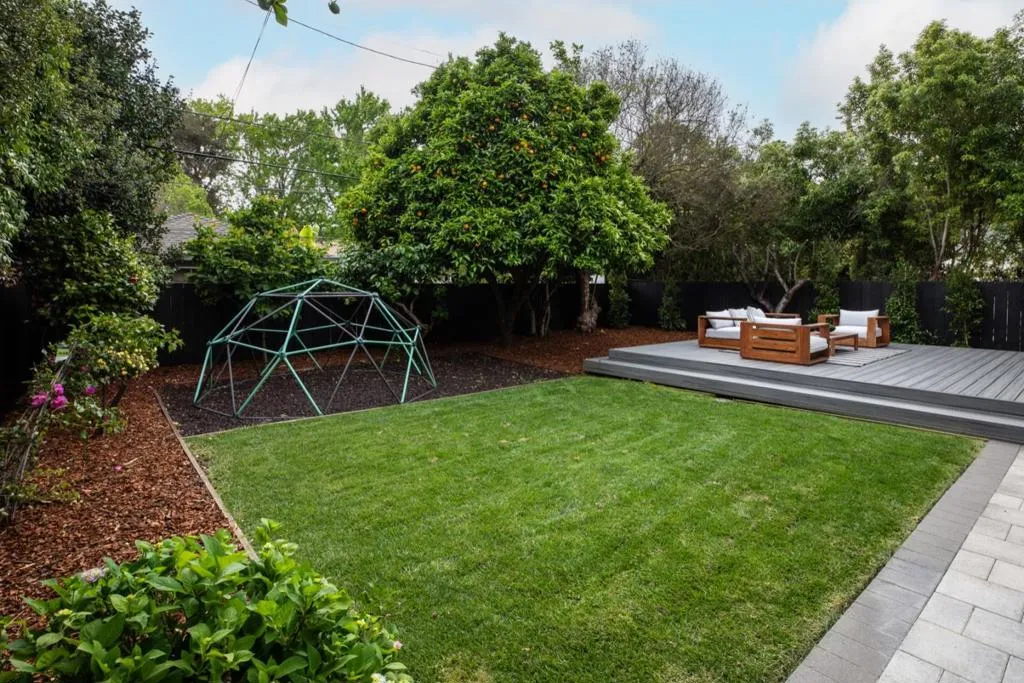 Located in the highly sought-after Flood Park neighborhood, this stunning home was completely rebuilt in 2021 with a focus on seamless indoor/outdoor California living and natural light. Designed by T-Square Architects, it features an off-white stucco exterior with ledge stone accents and steel-and-glass doors for striking curb appeal. Inside, light hardwood floors and wide hallways create an open, airy feel. The living room offers a floor-to-ceiling marble-style fireplace, while a main-level bedroom suite is ideal for guests or an office.The dining area flows into a spacious great room and chefs kitchen with Thermador stainless appliances, WiFi-enabled refrigerator and dishwasher, white lacquer cabinetry, and a waterfall-edge Cambria quartz island. The impressive family room boasts 12-foot ceilings, celestial windows, a fireplace, and glass doors opening to a private yard with Trex deck, lawn, and mature landscaping.Upstairs, the primary suite includes a luxurious bath with dual vanity, freestanding tub, and glass shower and private commode room. Additional features include Samsung washer and dryer, separate laundry room, tankless water heater, dual-zone HVAC, and proximity to parks, commute routes, and top Menlo Park schools.