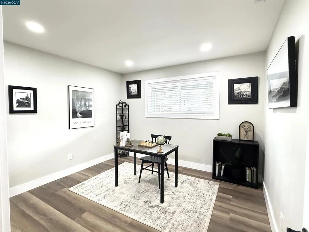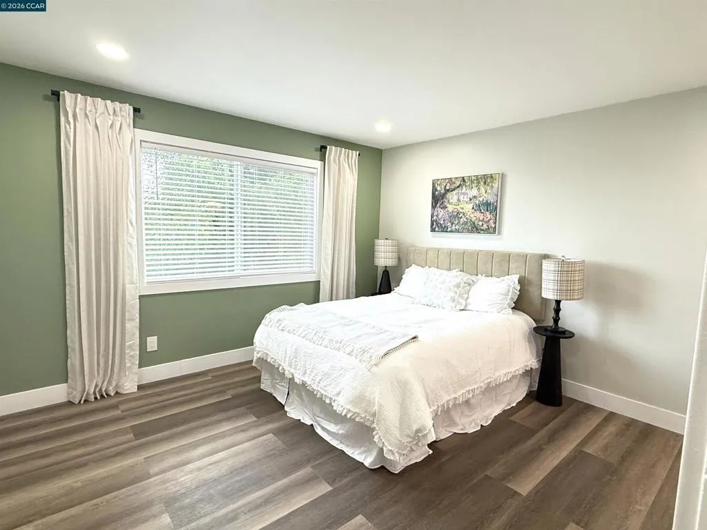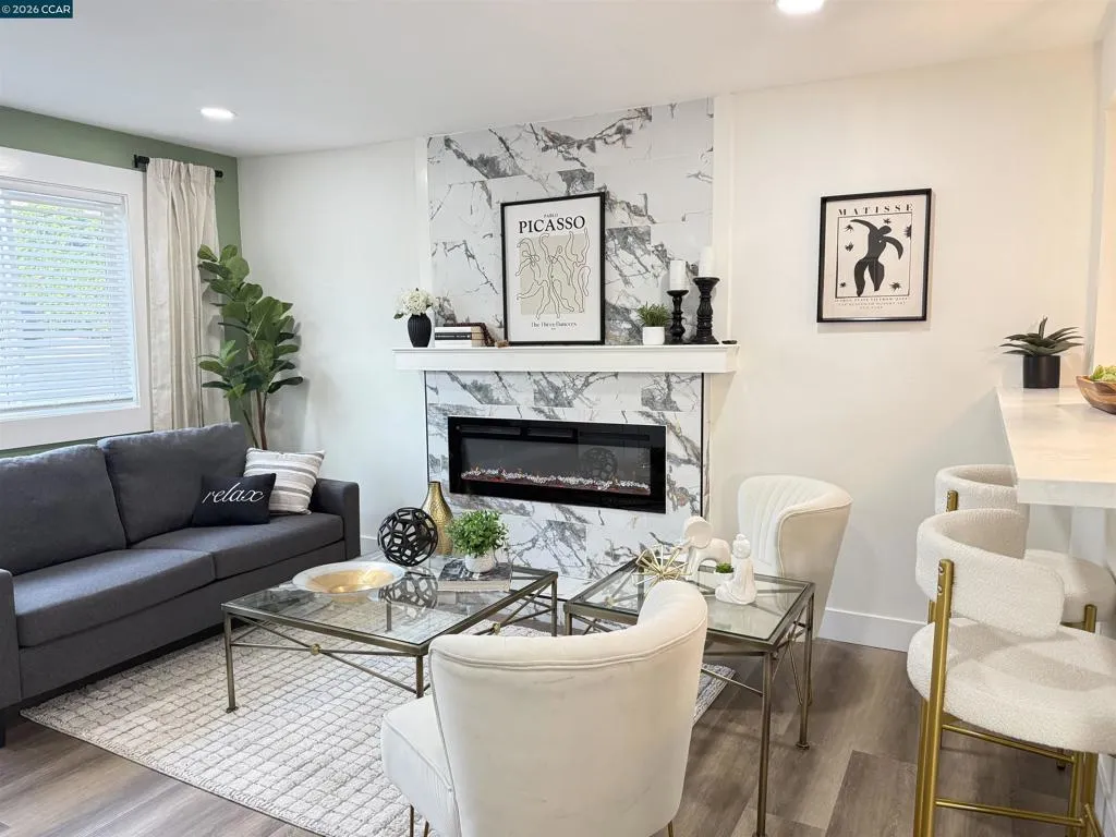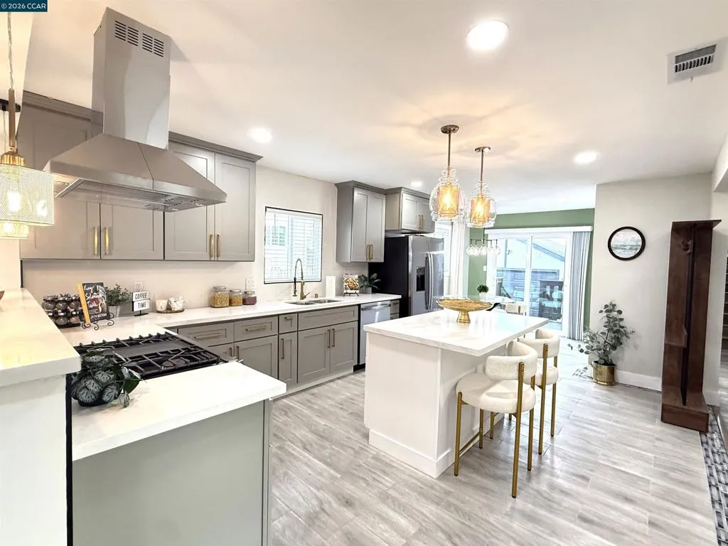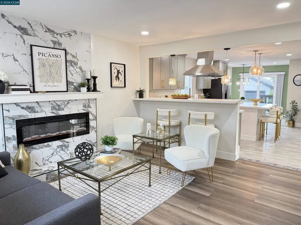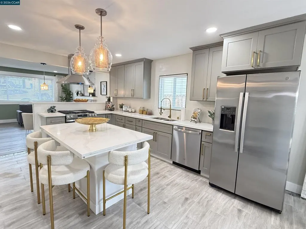 Welcome to this beautifully reimagined four-bedroom, two-bath tri-level home in the heart of Martinez, where modern upgrades meet timeless comfort and style. Completely redone from top to bottom, the stunning kitchen is a true centerpiece, featuring new cabinetry, quartz countertops, tile flooring, designer lighting, a spacious island, breakfast bar, and brand-new stainless steel appliances—perfect for both everyday living and entertaining. This elegant residence offers a warm and inviting atmosphere with laminate flooring, an electric fireplace, designer paint accent walls, recessed lighting, and new window blinds throughout. The private primary suite offers a serene retreat with a beautifully updated en-suite bathroom, while the hall bath is equally refined with a new vanity, tile shower, and custom enclosure. Enjoy peace of mind with major improvements including a new HVAC system and newly poured concrete driveway, walkways, garage floor, and back patio. Outdoor spaces shine with a deck, patio, front lawn, planter boxes, and automated irrigation. Located near vibrant downtown shops, restaurants, Marina Park, and top-rated schools, this home truly has it all.